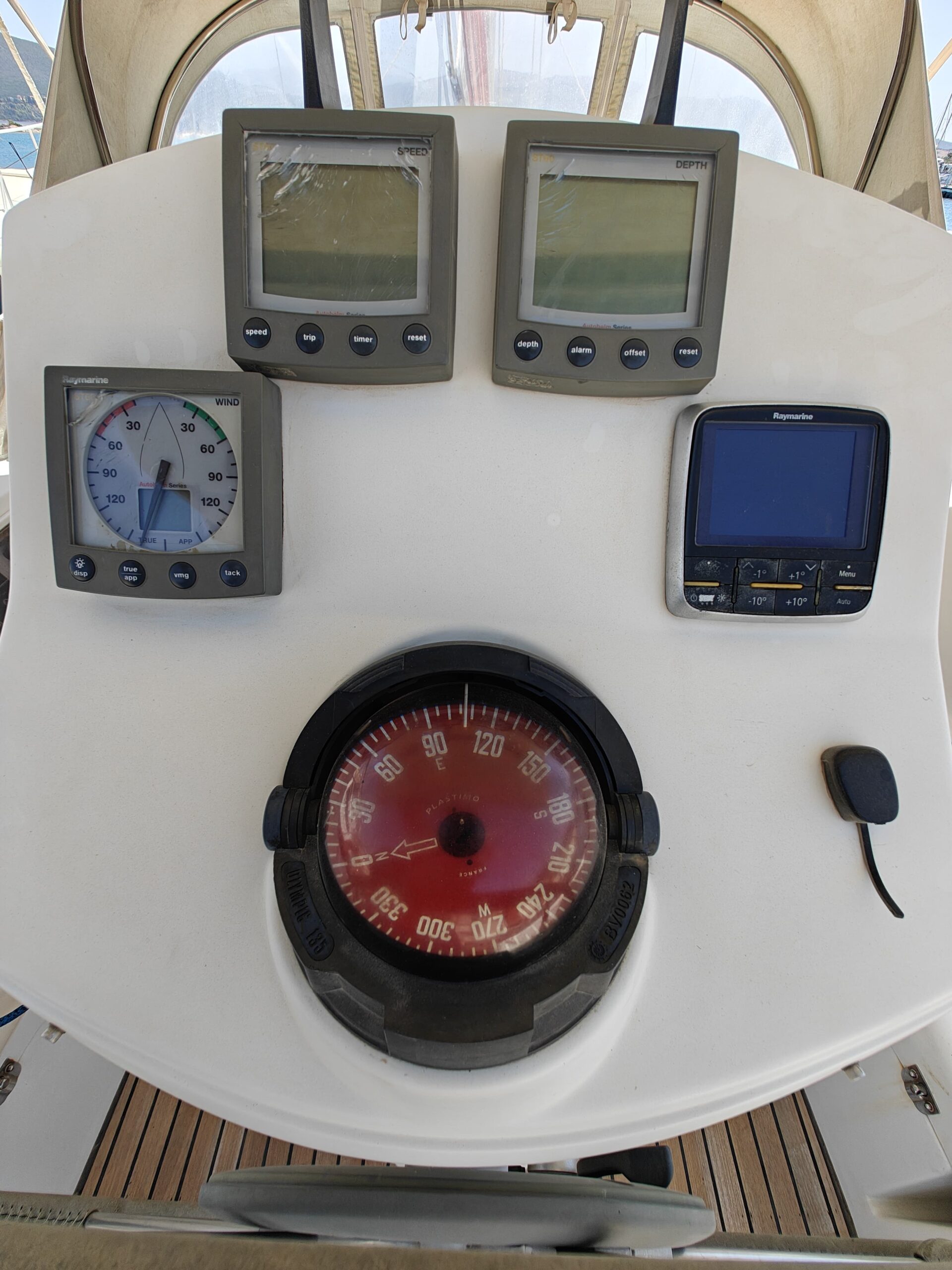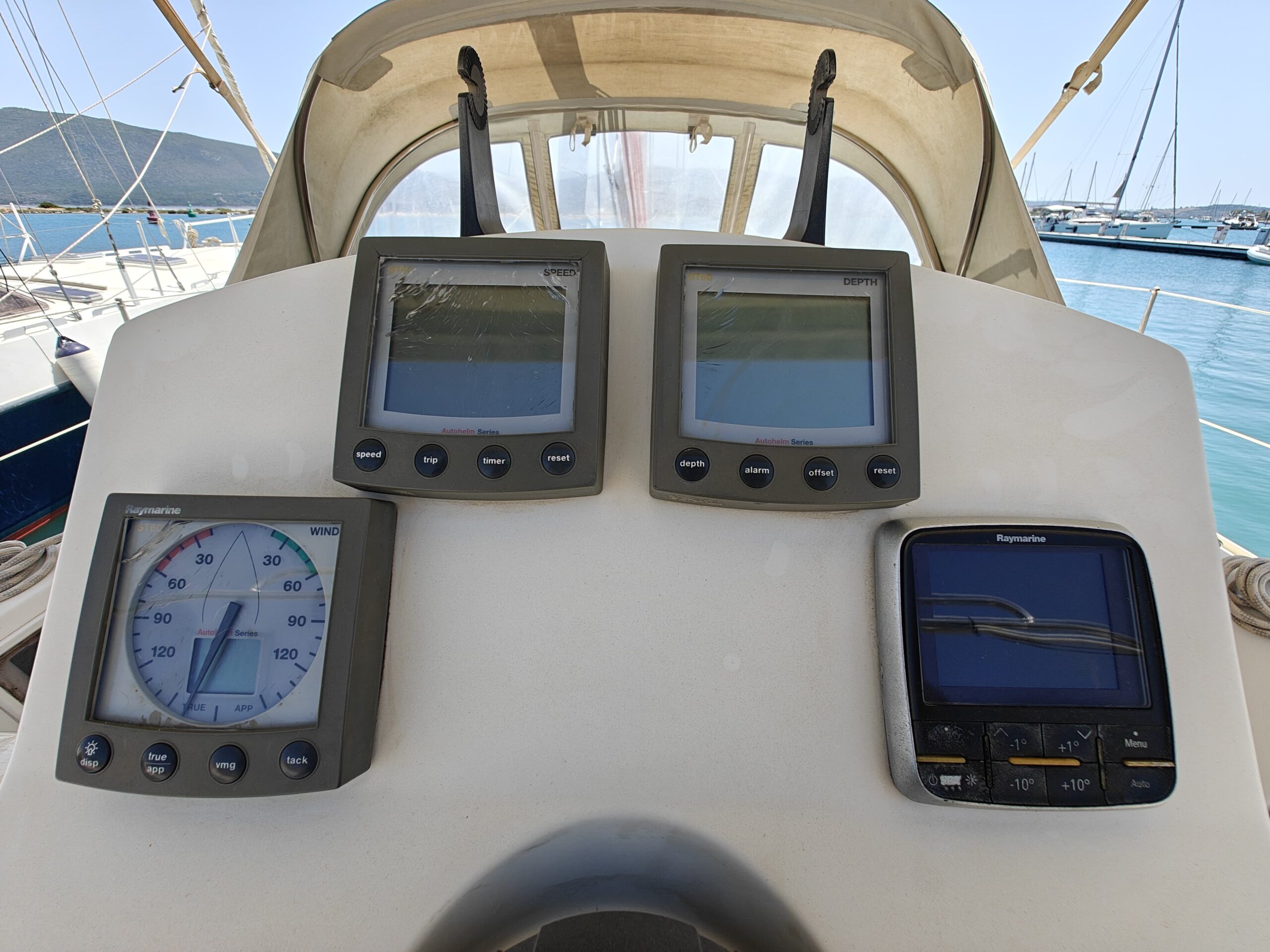 Navigation instruments include a depth sounder, log-speedometer, wind instrumentation, autopilot, VHF, and compass.