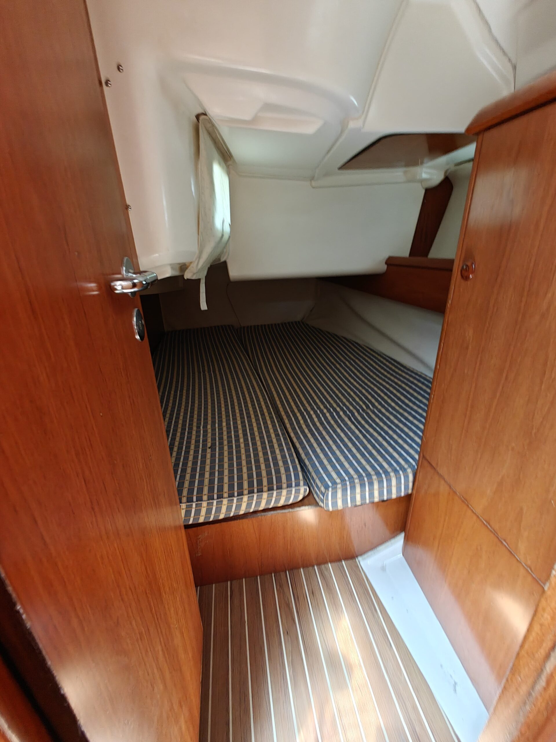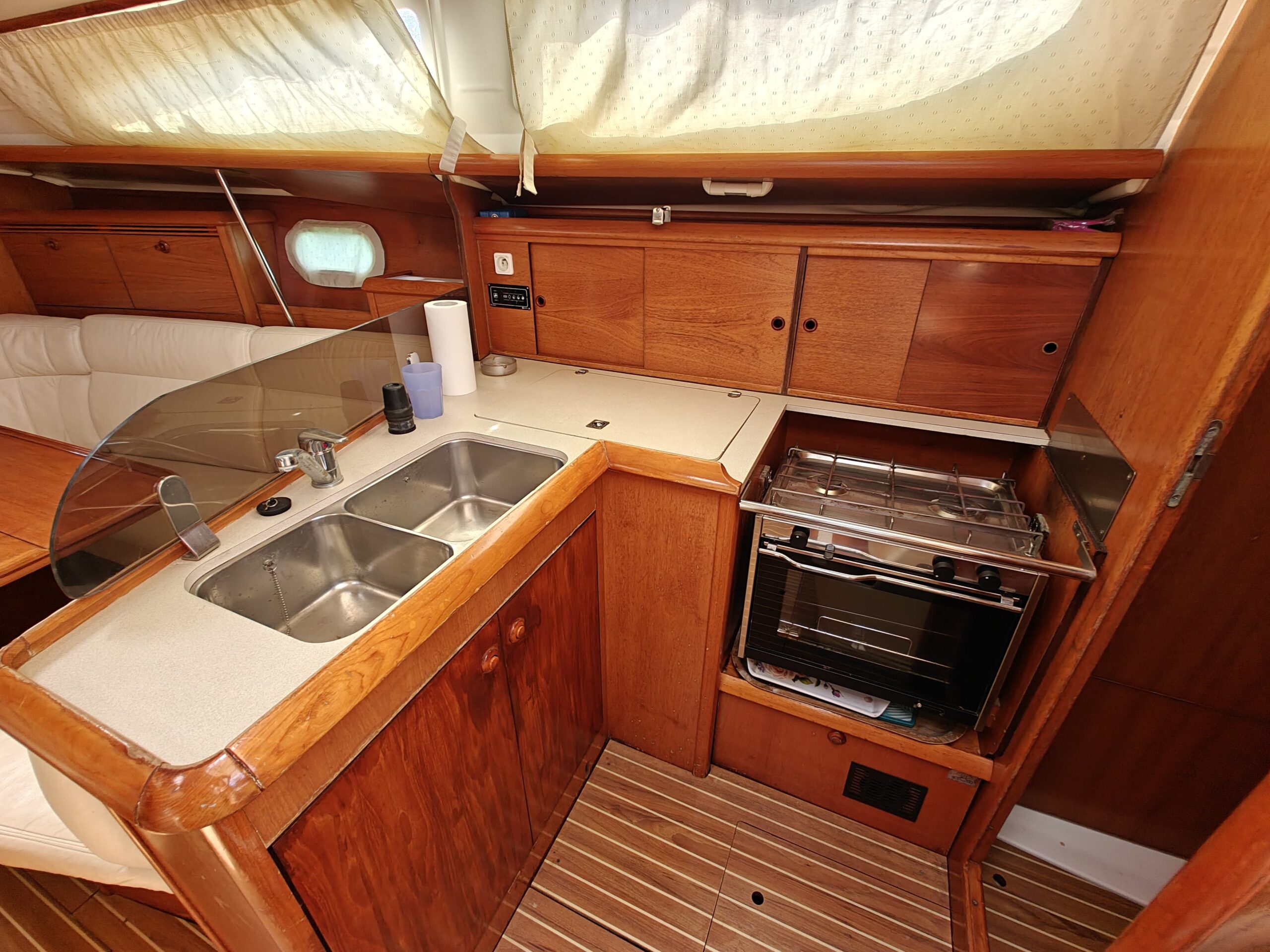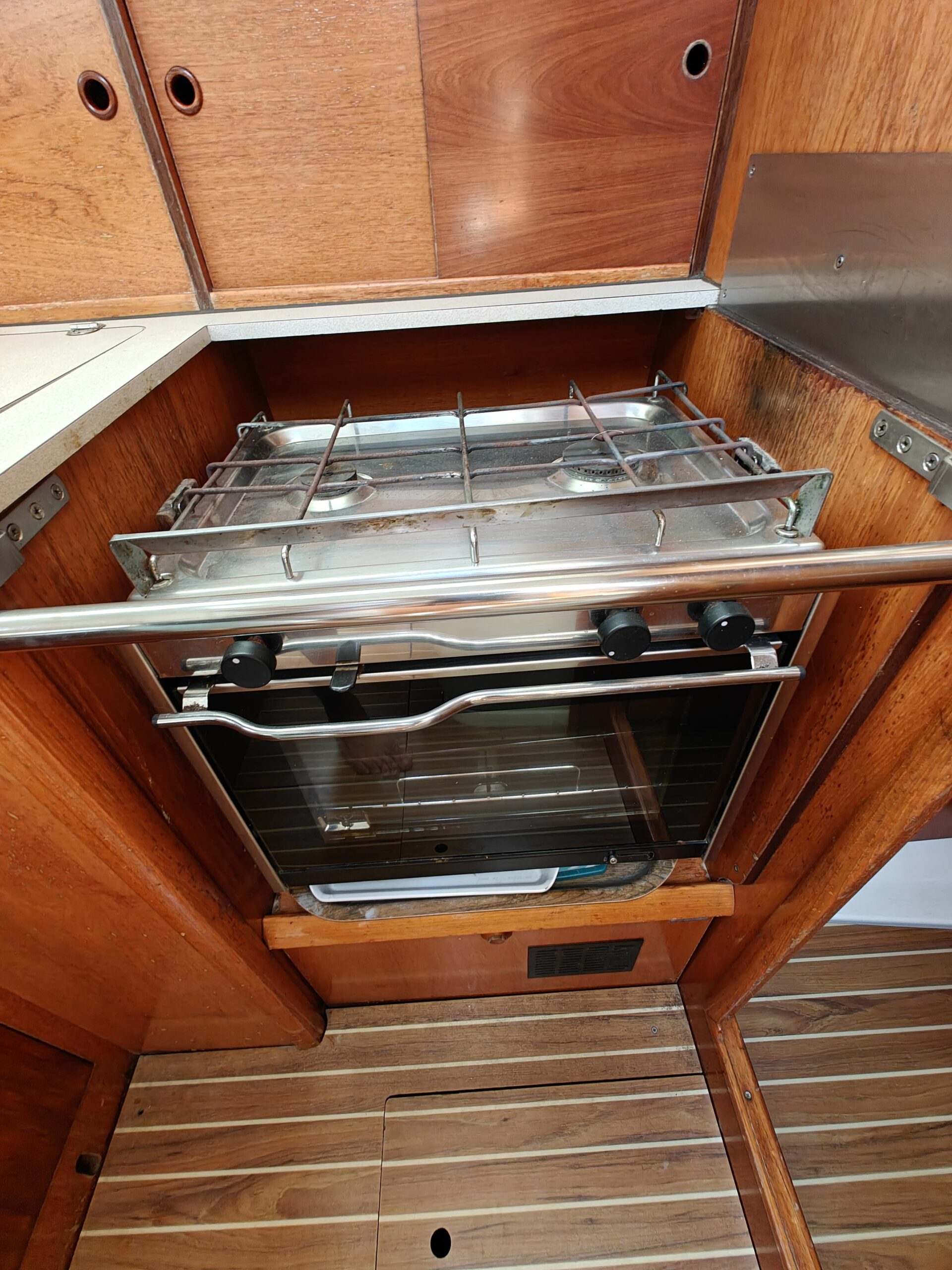 Inside, the bright and inviting saloon is fitted with white leatherette upholstery (2021), while the galley includes an oven, refrigerator (motor replaced 2022), hot water system, and both electric and manual bilge pumps.