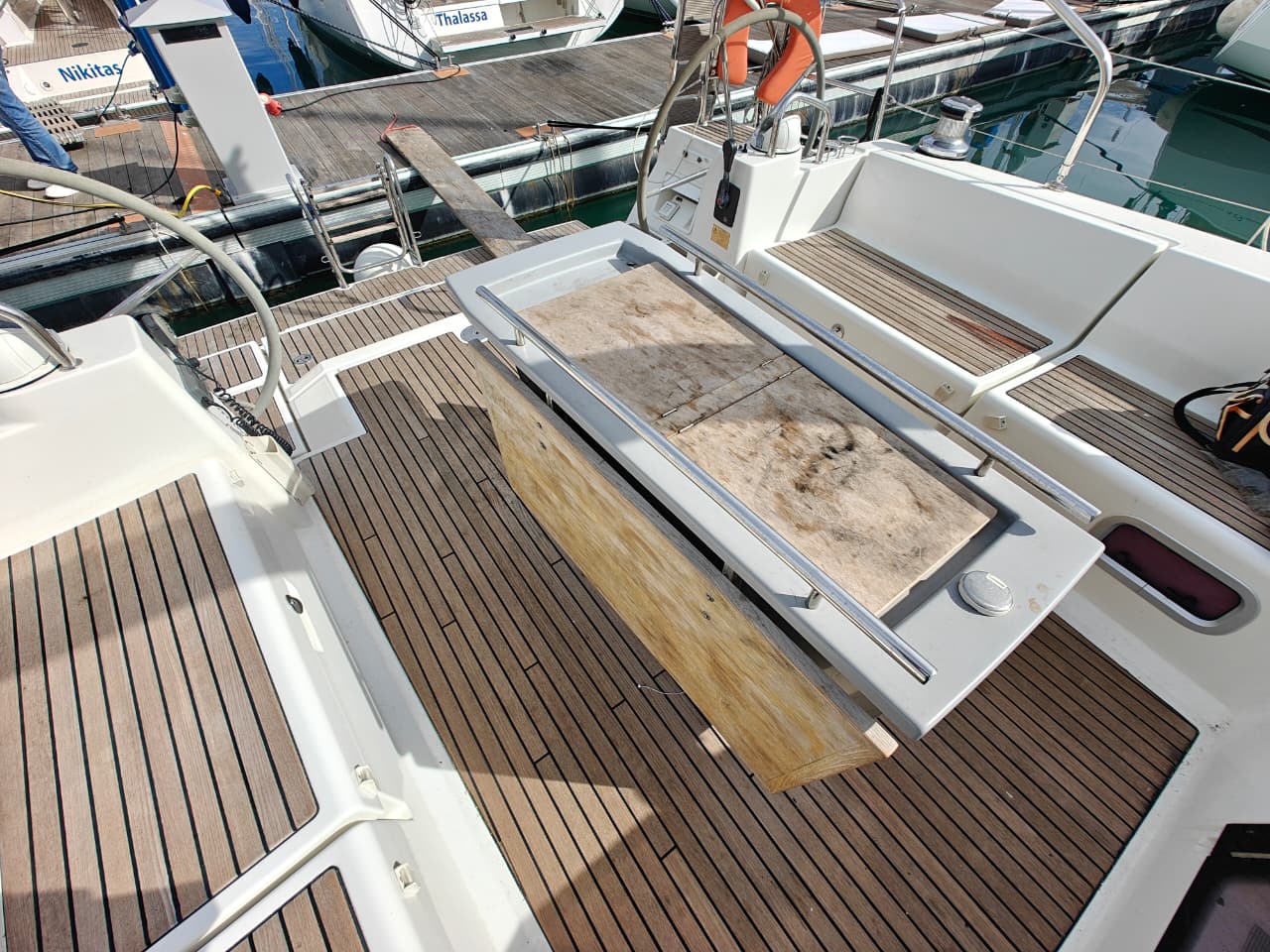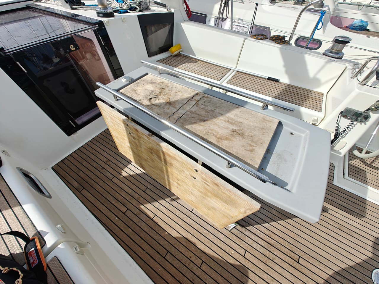 On deck, the Oceanis 45 is set up for both comfort and performance. Twin helm stations, a large cockpit with folding table, and a bimini with sprayhood create a great outdoor living area for sailing or dining at anchor.