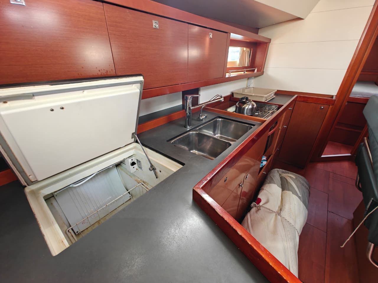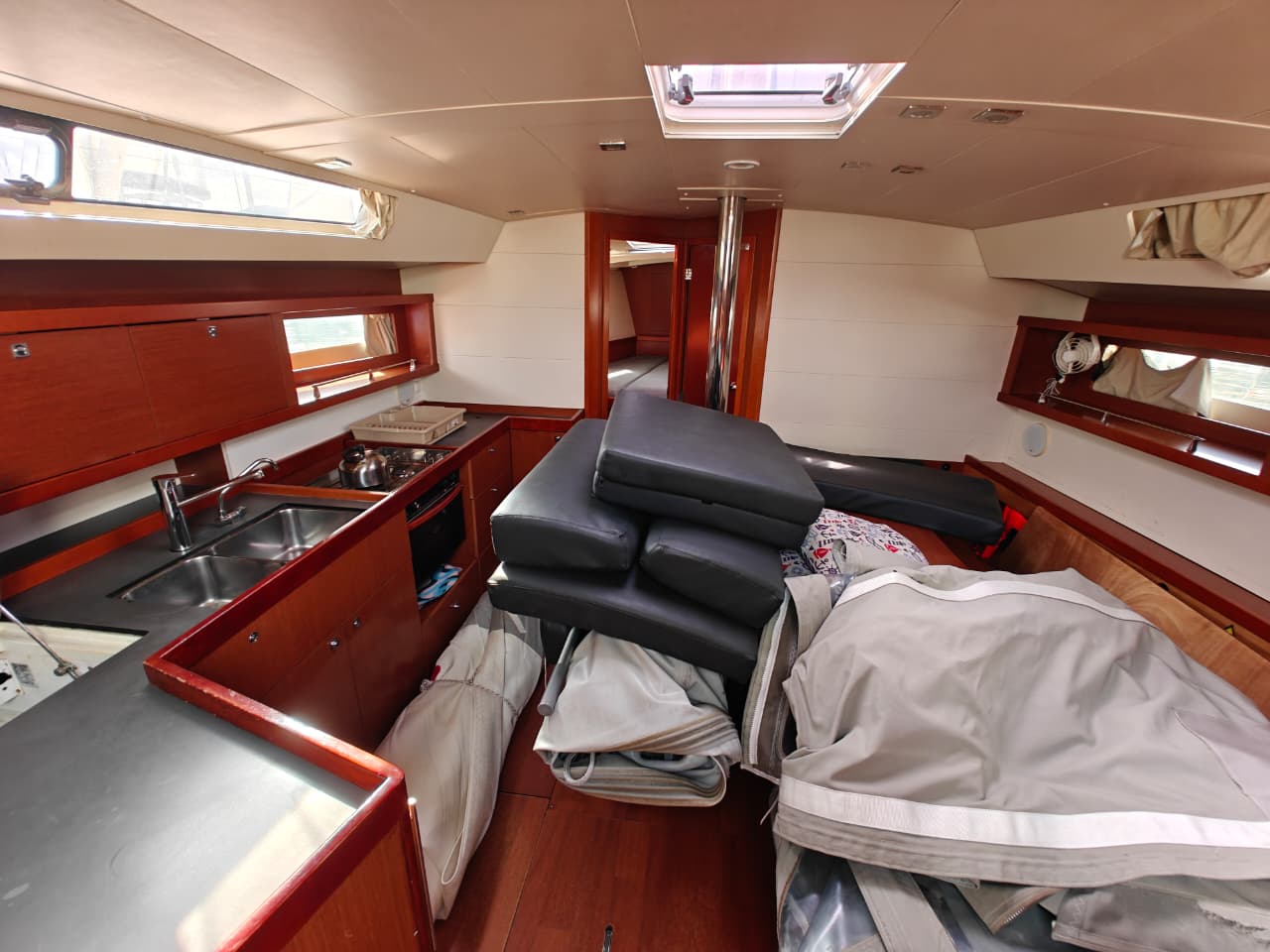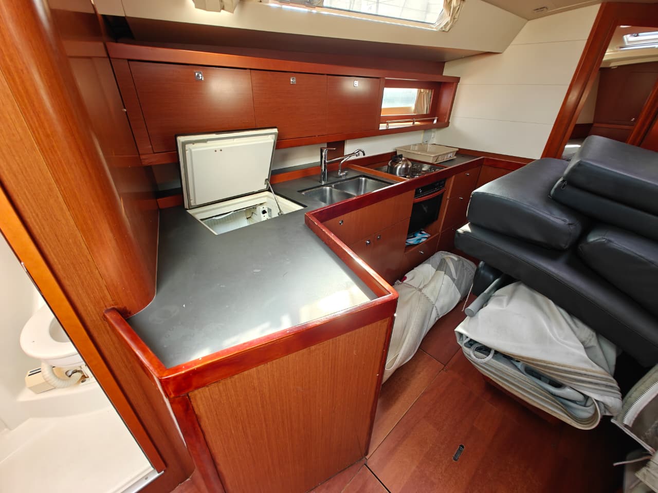 The bright saloon and fully equipped galley, complete with a gas stove, oven, and refrigerator, make her ideal for longer trips or relaxed coastal cruising.