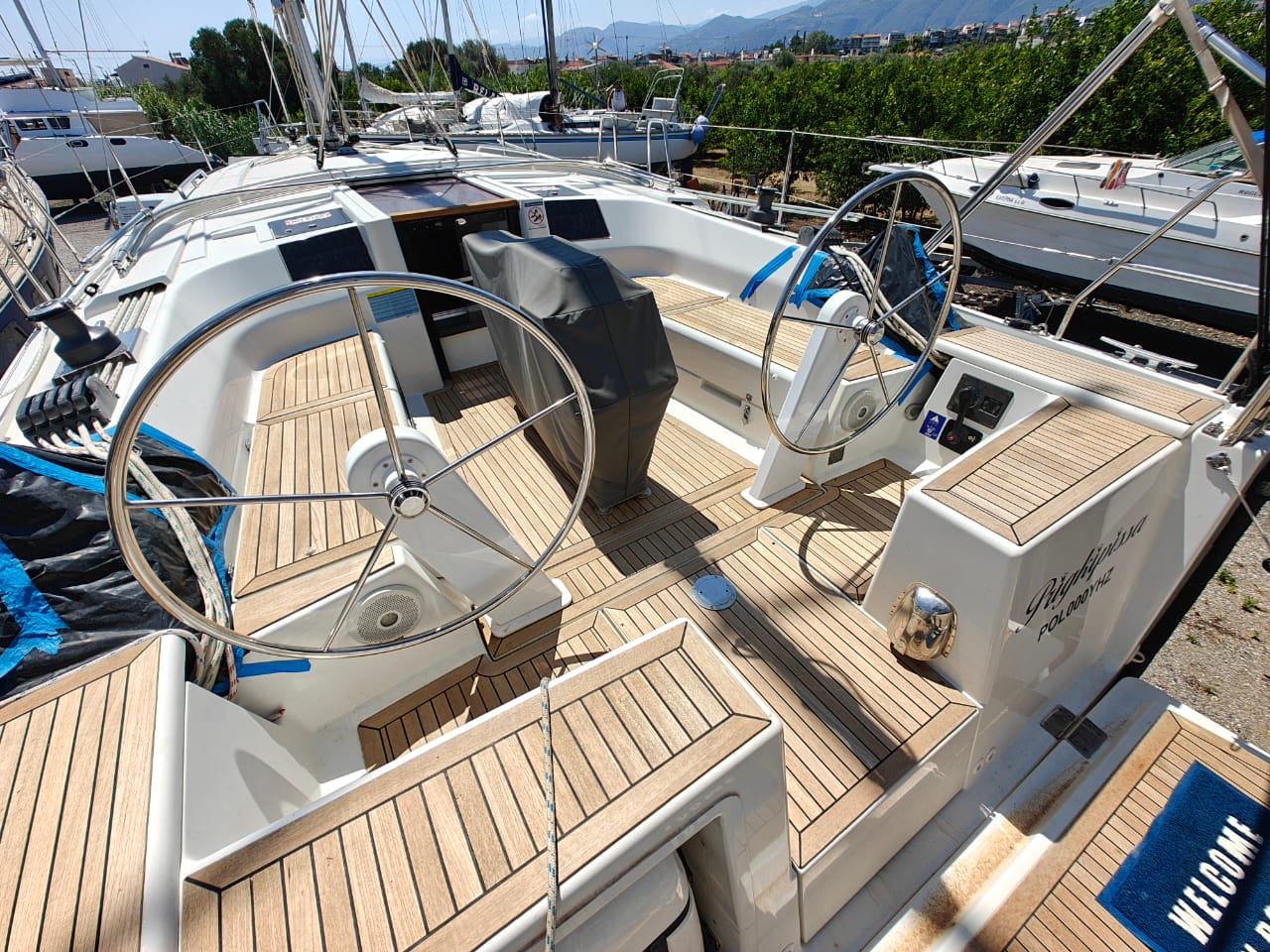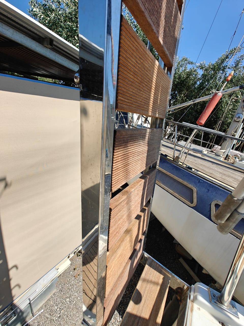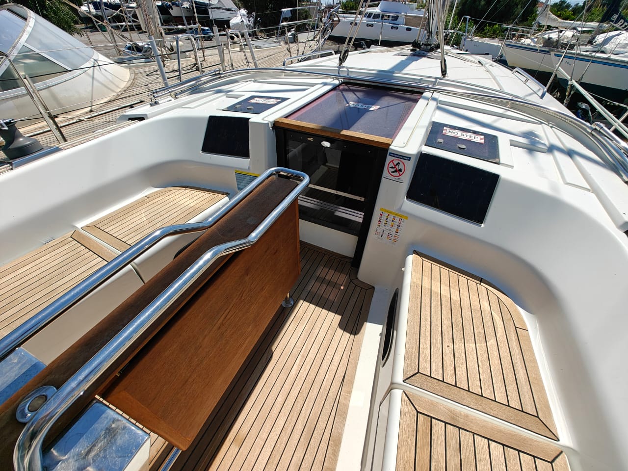 - Deck Features: Teak cockpit and bathing platform, electric windlass (Quick), sprayhood, bimini, folding gangway, dual steering wheels, cockpit cushions, swim ladder