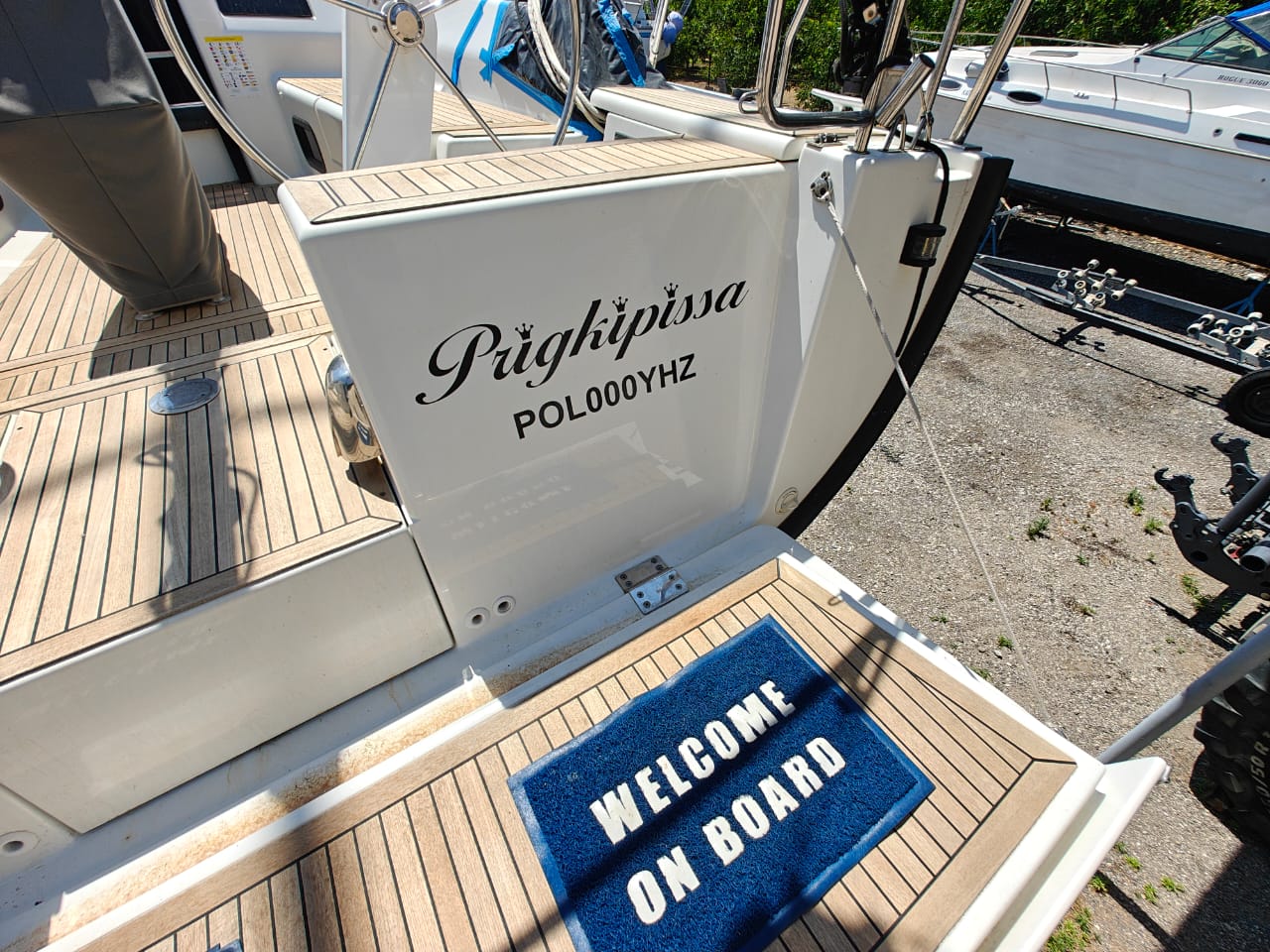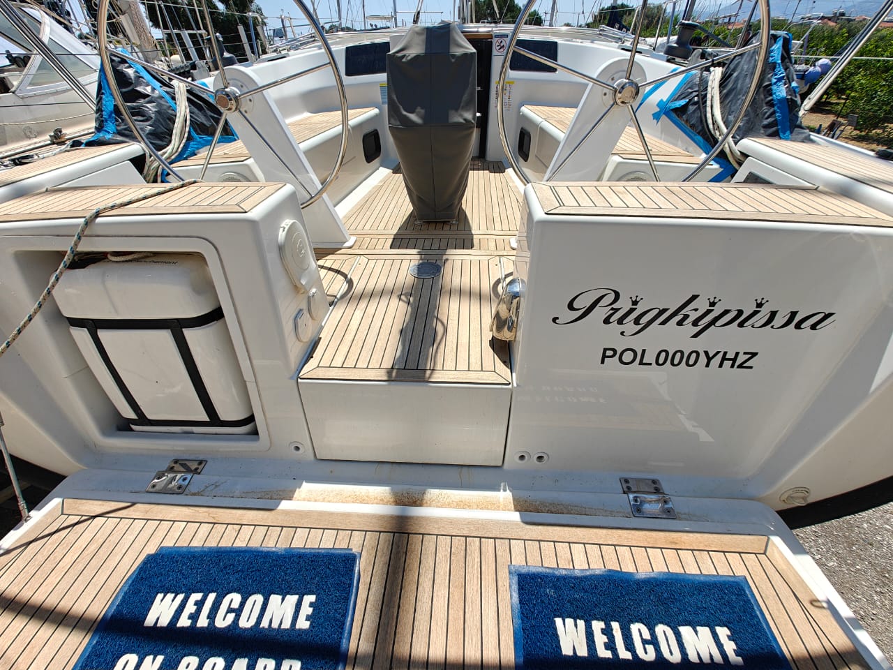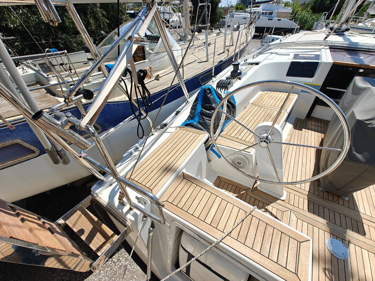 - Deck Features: Teak cockpit and bathing platform, electric windlass (Quick), sprayhood, bimini, folding gangway, dual steering wheels, cockpit cushions, swim ladder