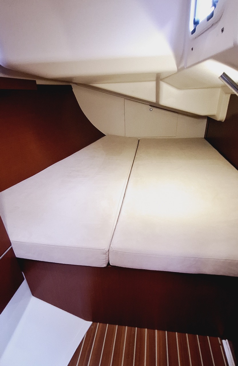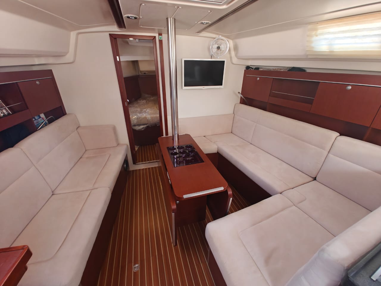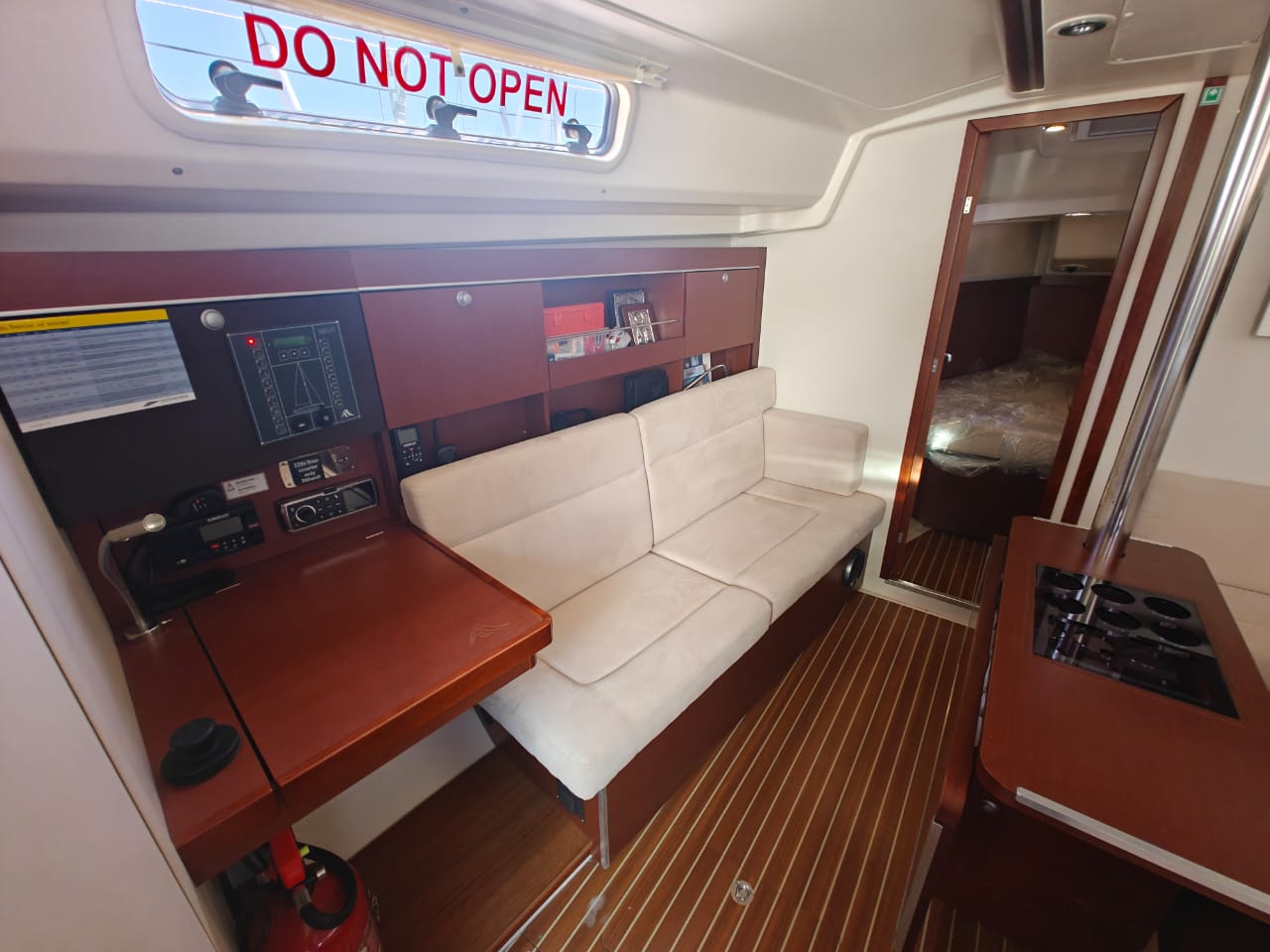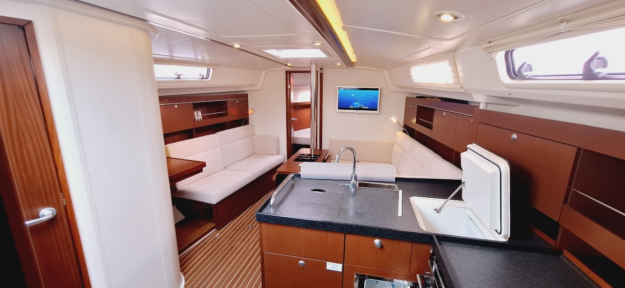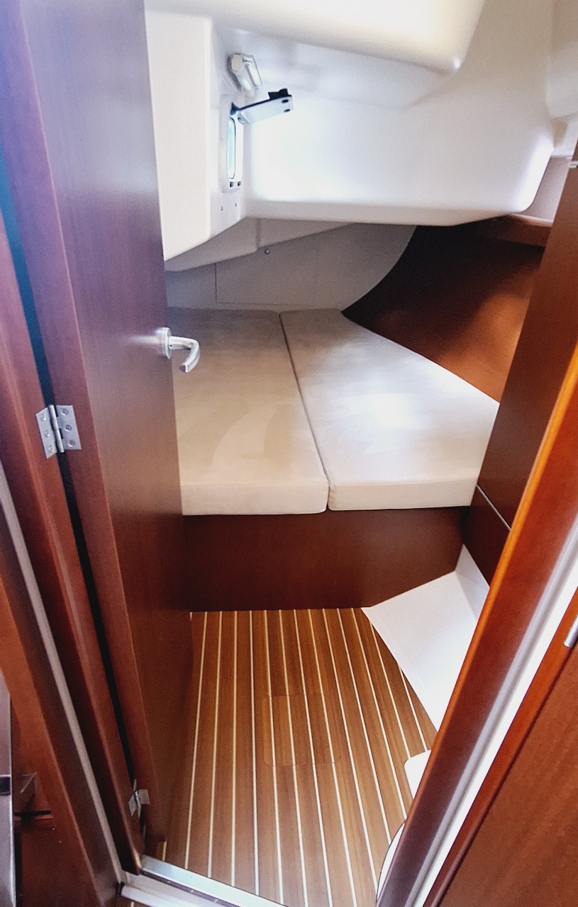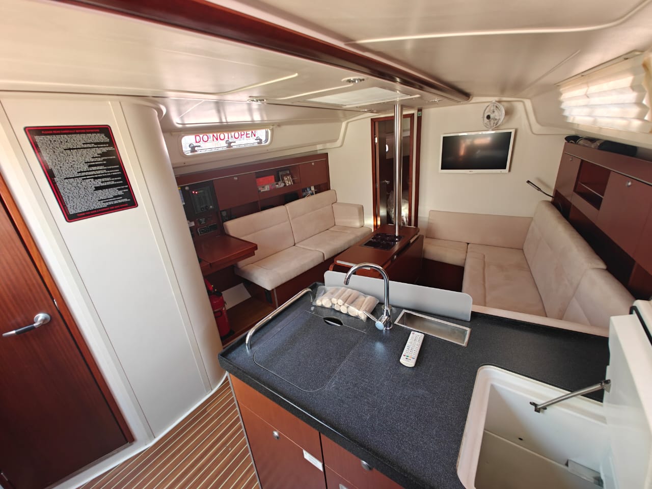 - Accommodation Layout: 3 cabins (2 aft double cabins + forward V‑berth), saloon seating for 8, chart table, 1 head with shower and sink, wardrobes and storage per cabin
