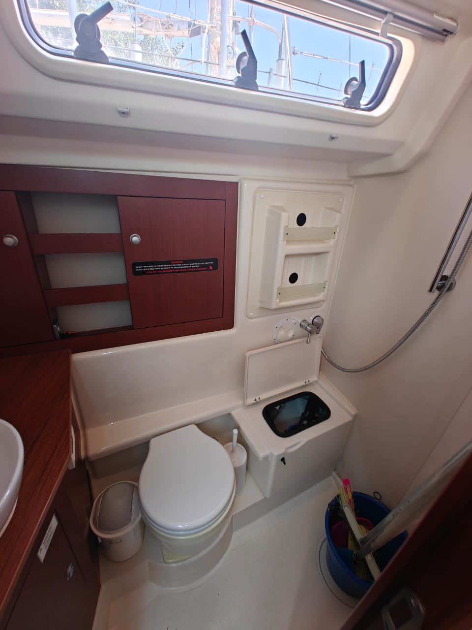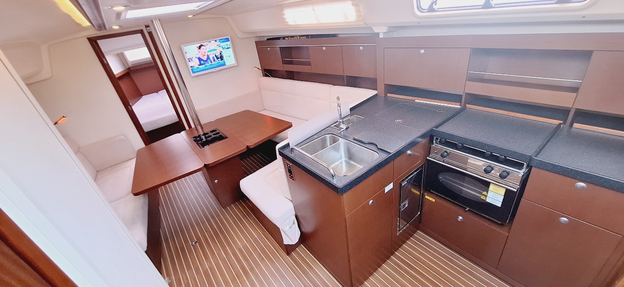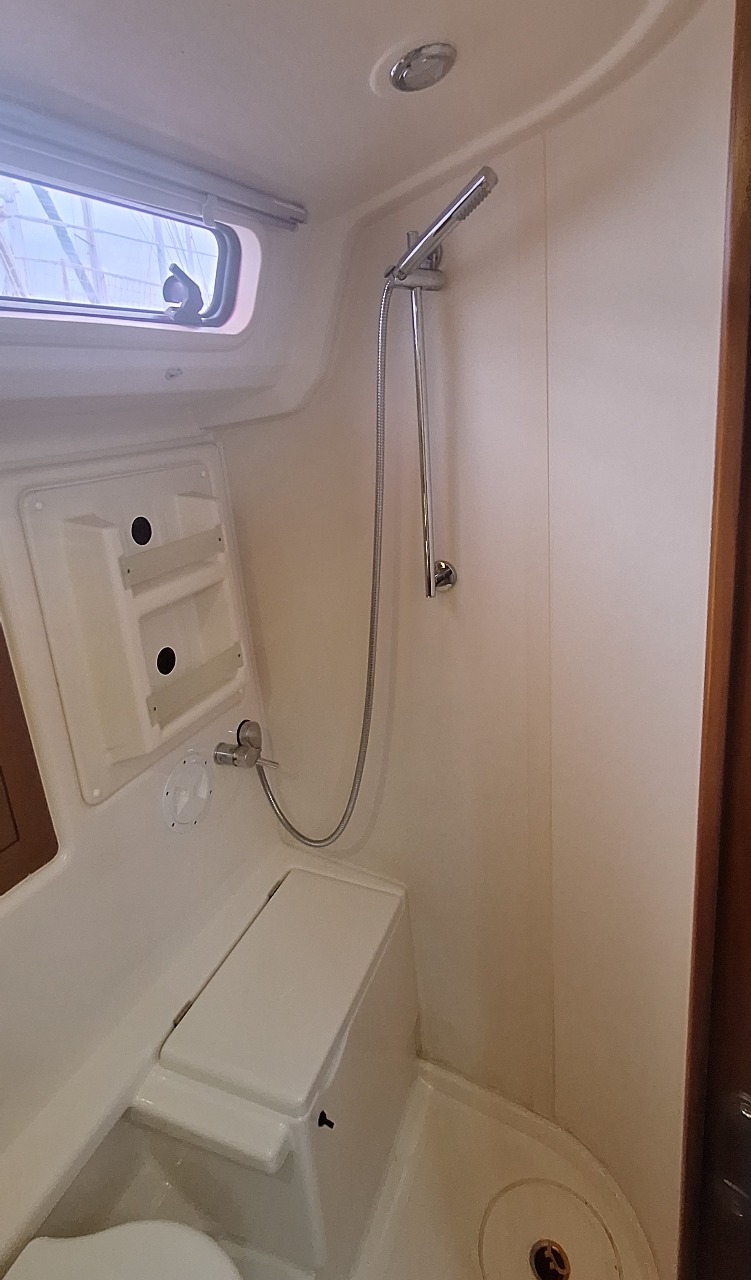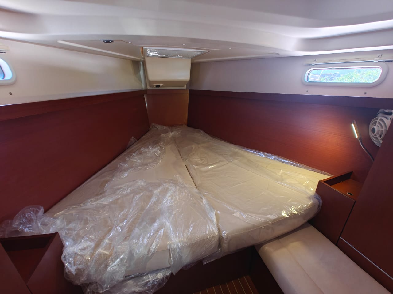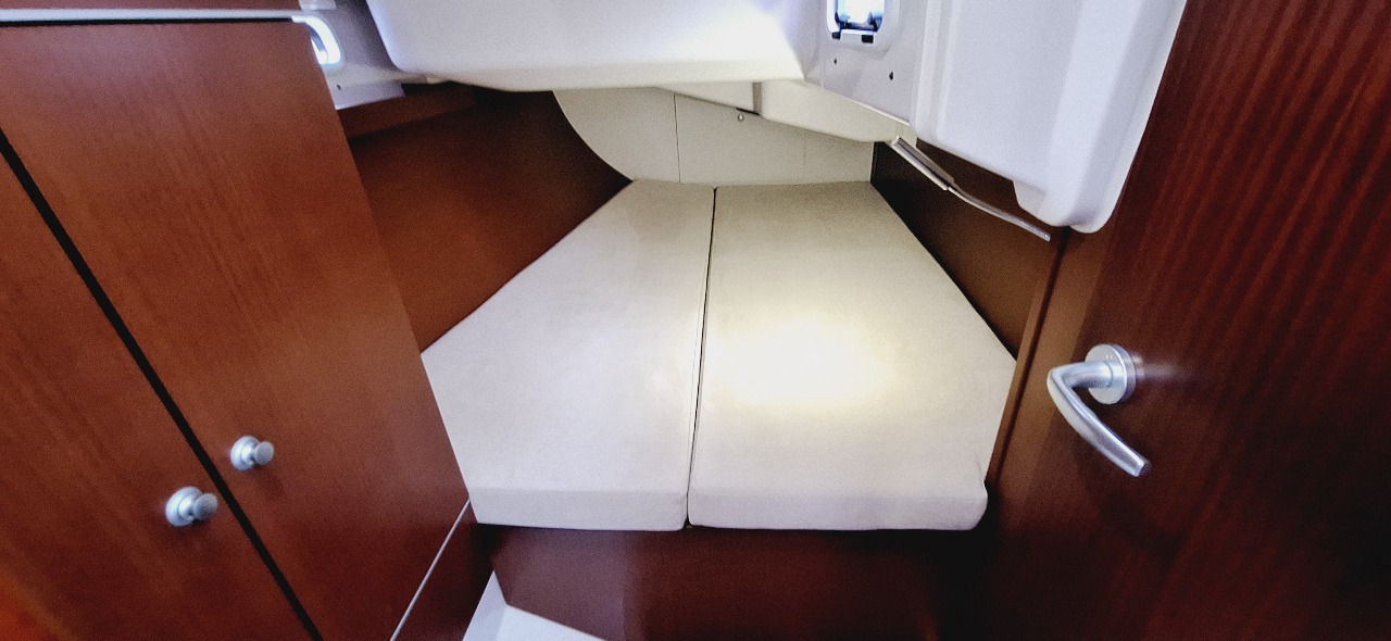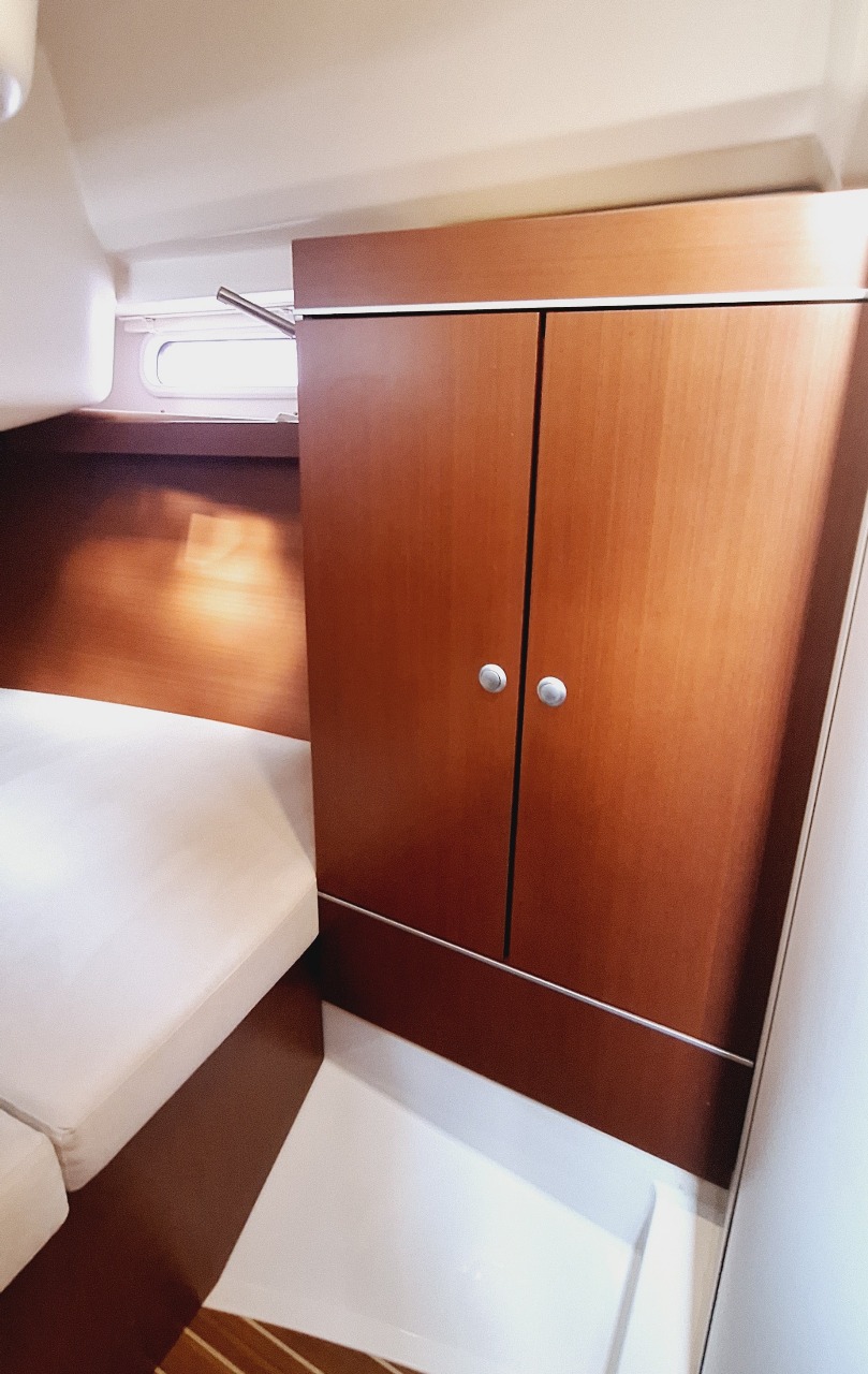 - Accommodation Layout: 3 cabins (2 aft double cabins + forward V‑berth), saloon seating for 8, chart table, 1 head with shower and sink, wardrobes and storage per cabin