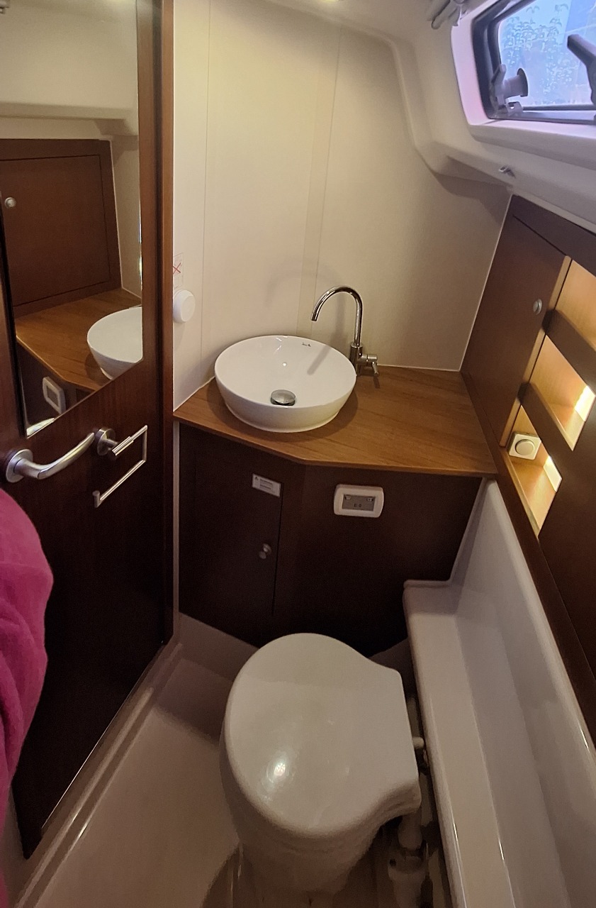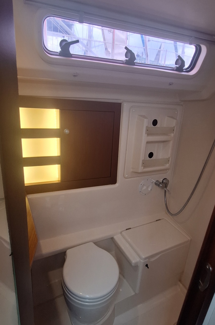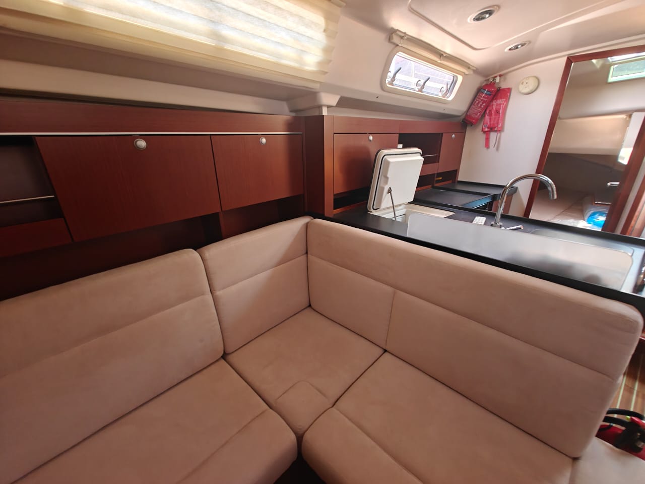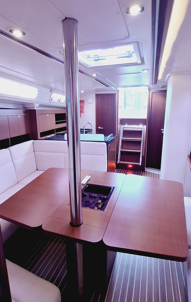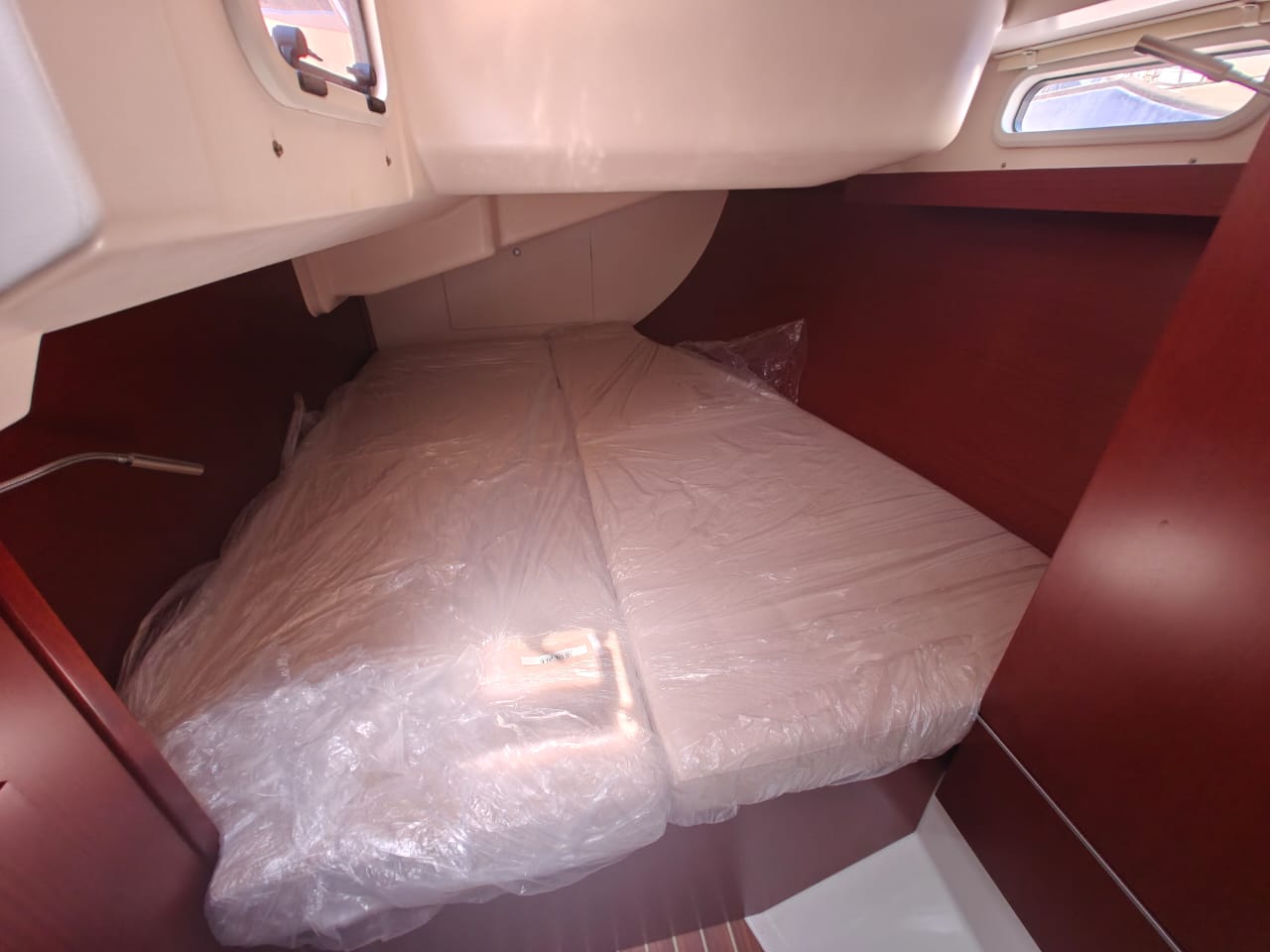 - Accommodation Layout: 3 cabins (2 aft double cabins + forward V‑berth), saloon seating for 8, chart table, 1 head with shower and sink, wardrobes and storage per cabin