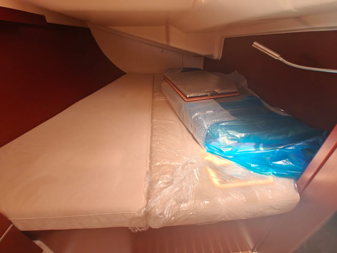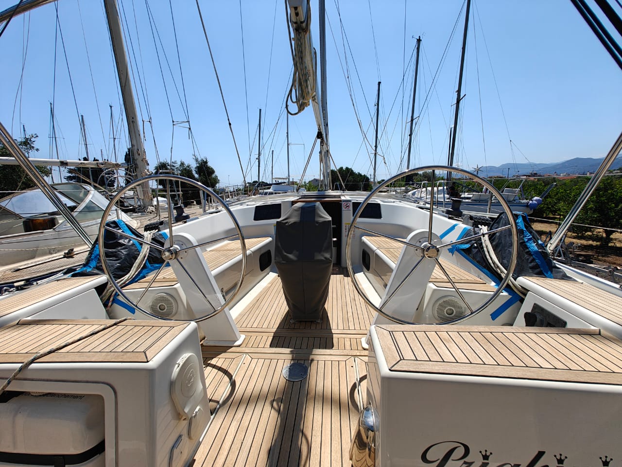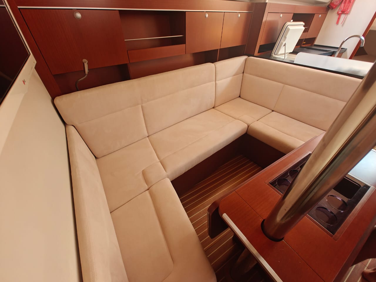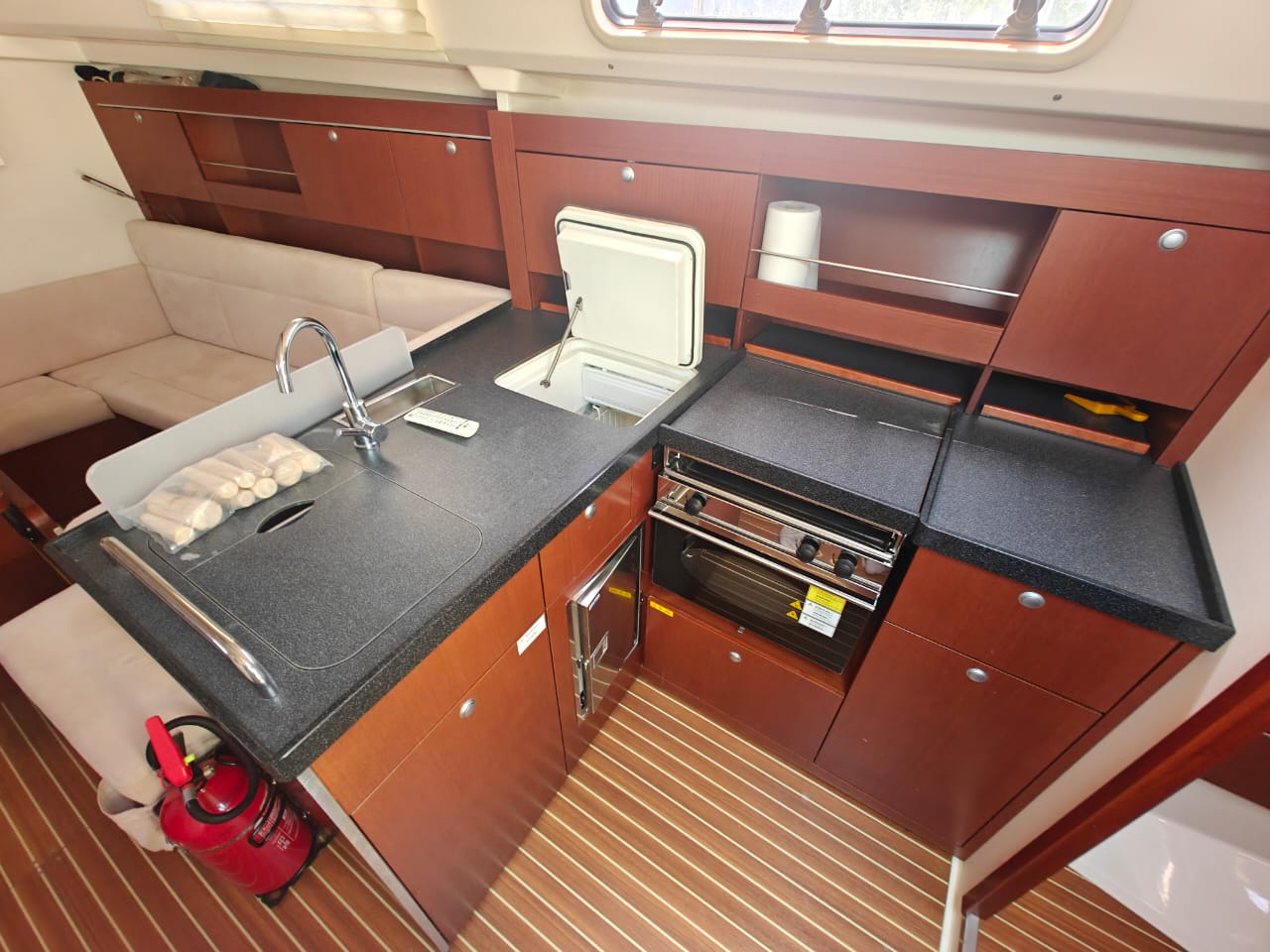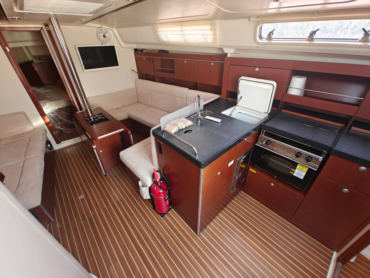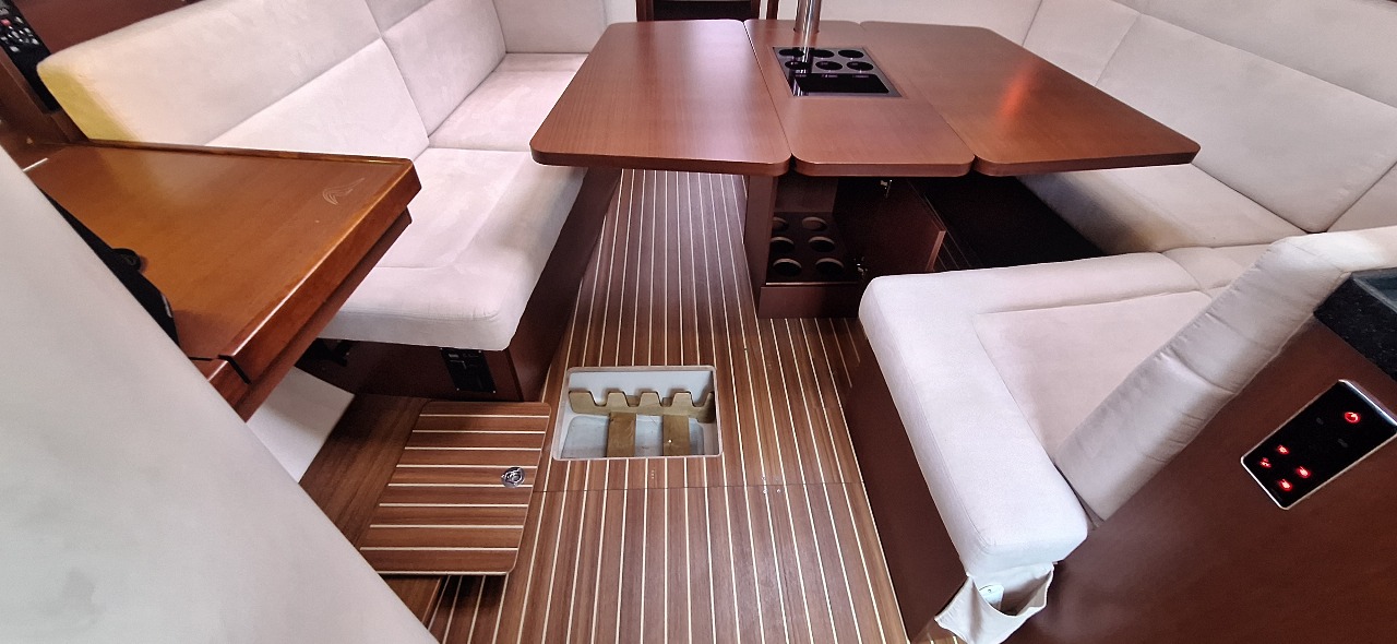 - Accommodation Layout: 3 cabins (2 aft double cabins + forward V‑berth), saloon seating for 8, chart table, 1 head with shower and sink, wardrobes and storage per cabin