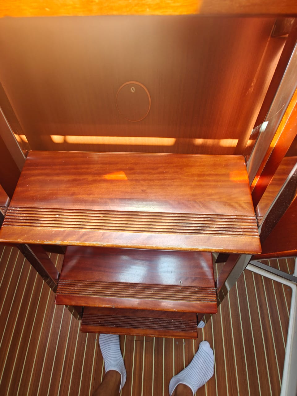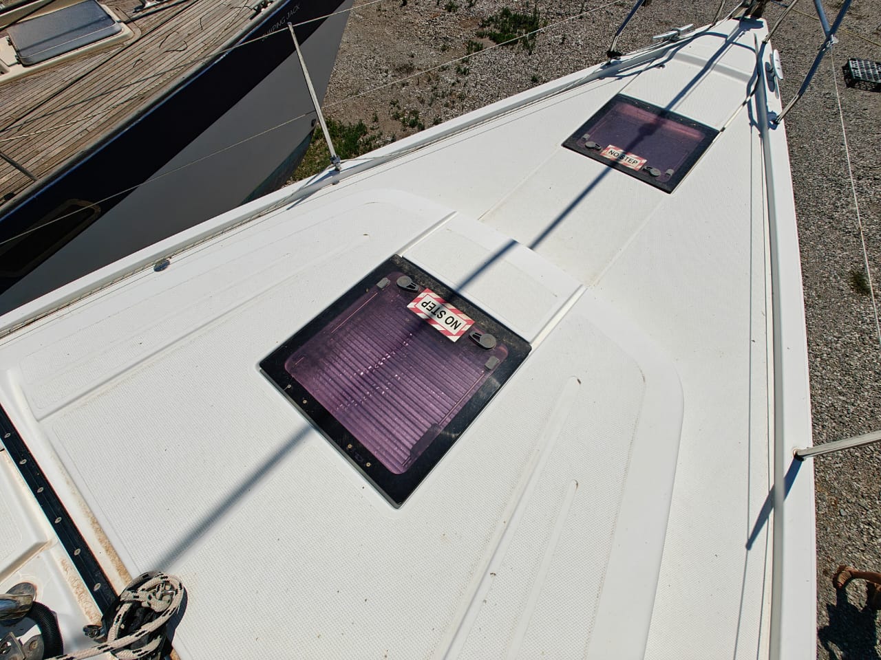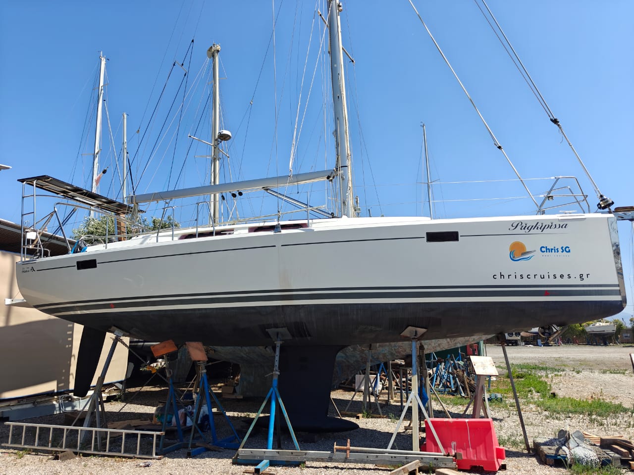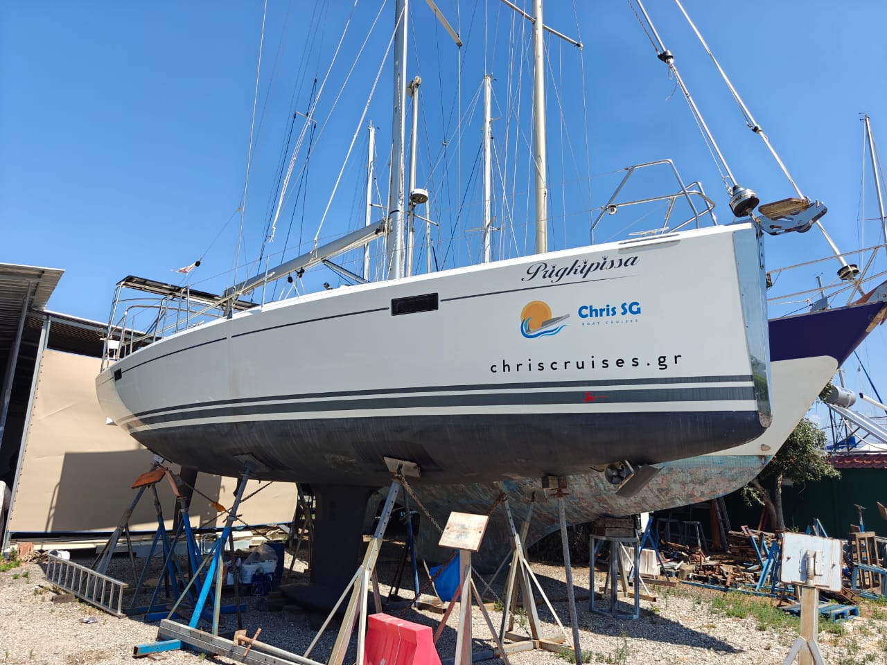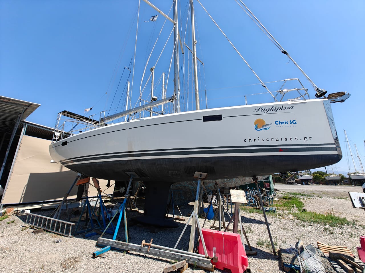 - Accommodation Layout: 3 cabins (2 aft double cabins + forward V‑berth), saloon seating for 8, chart table, 1 head with shower and sink, wardrobes and storage per cabin
