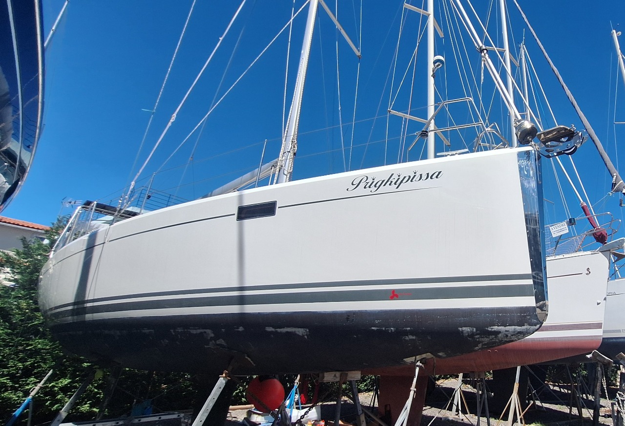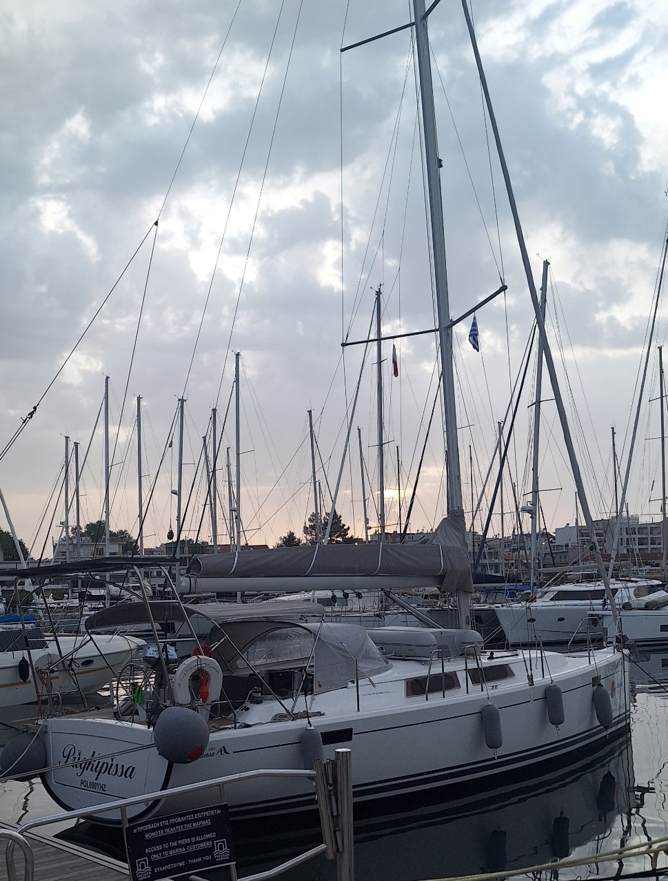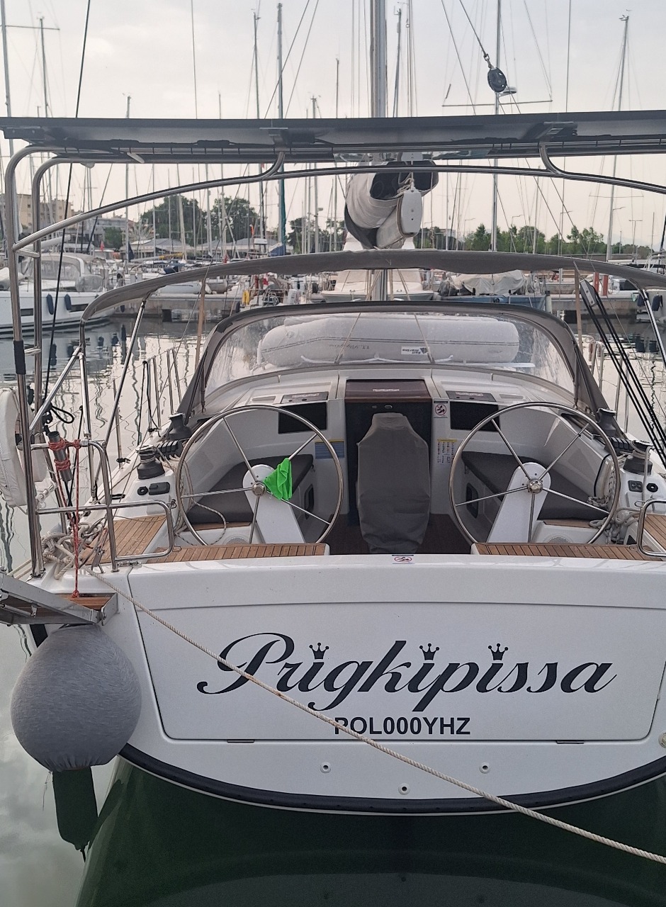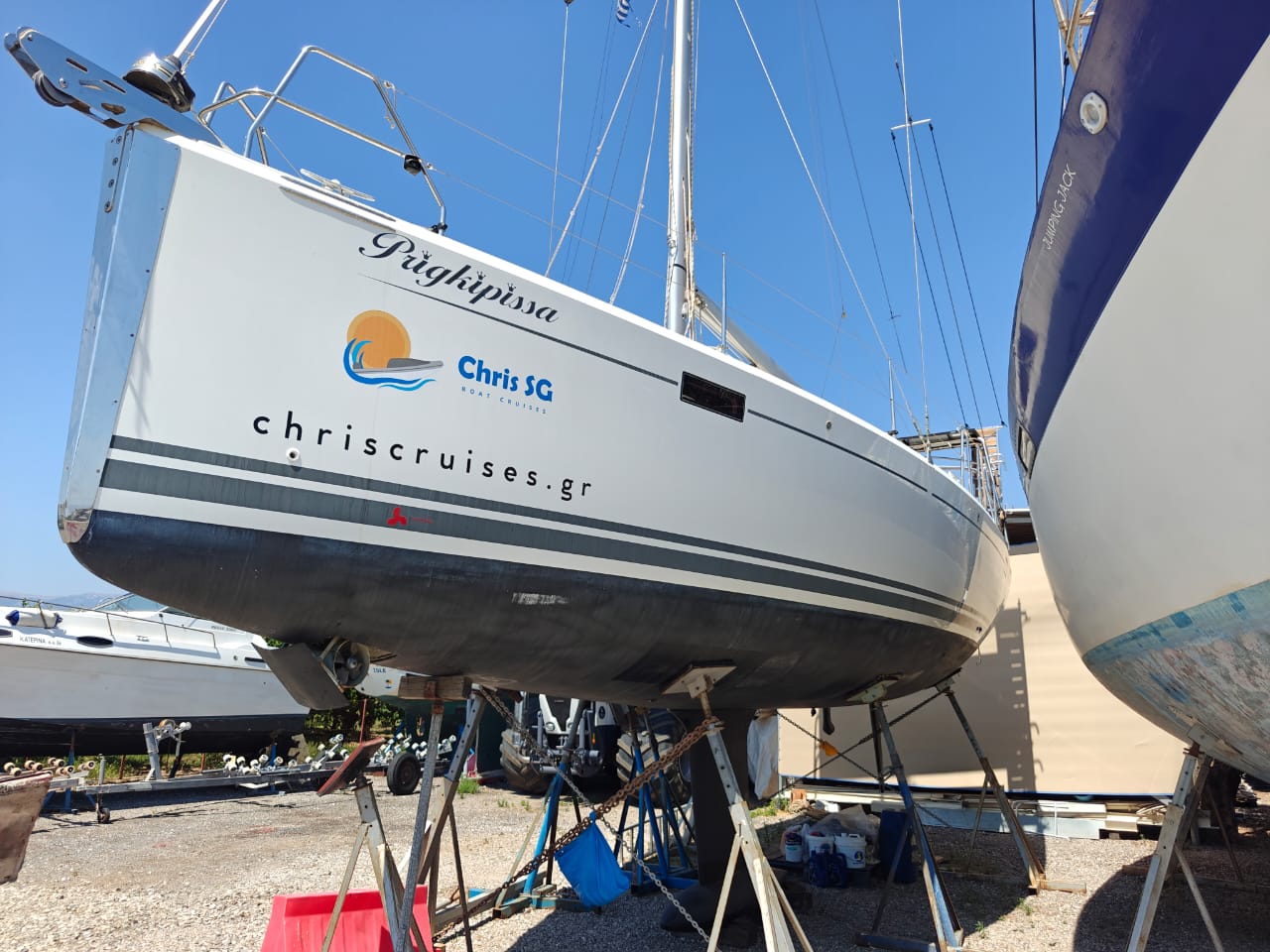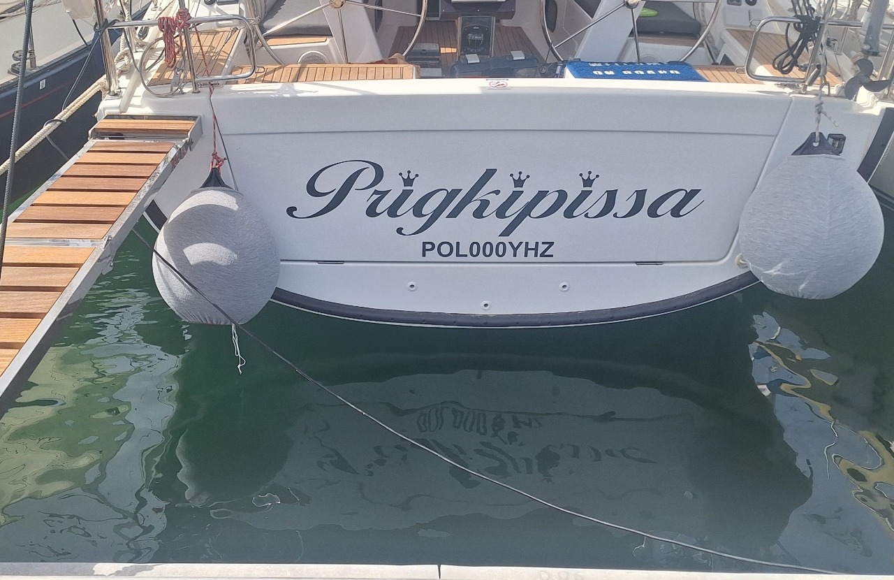 - Accommodation Layout: 3 cabins (2 aft double cabins + forward V‑berth), saloon seating for 8, chart table, 1 head with shower and sink, wardrobes and storage per cabin