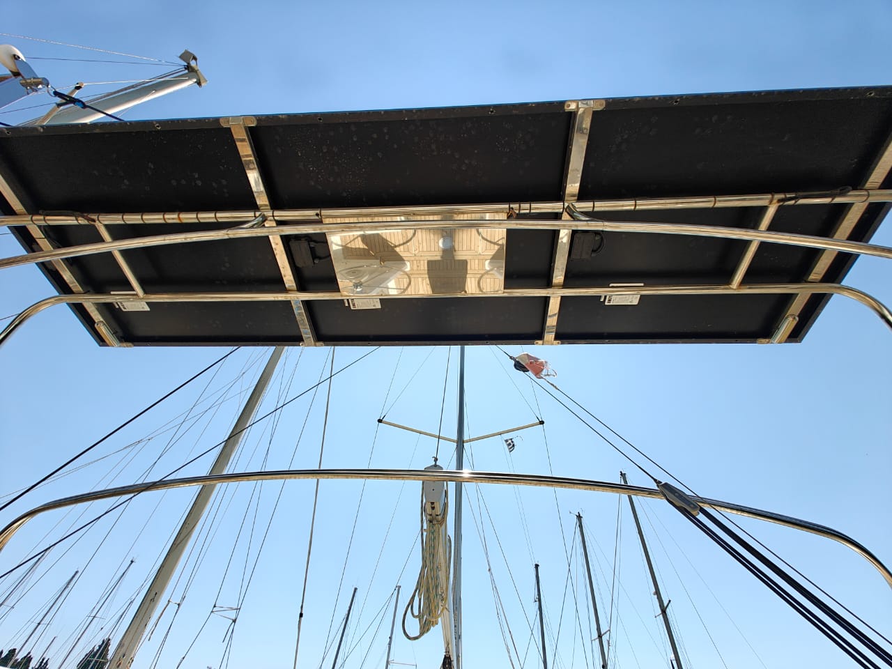 A biological waste treatment system, heavy-duty stainless steel rollbar, 555W solar panels, and a full set of new AGM Carbon North Batt batteries (service, engine, and bow thruster) ensure energy independence and environmental efficiency.