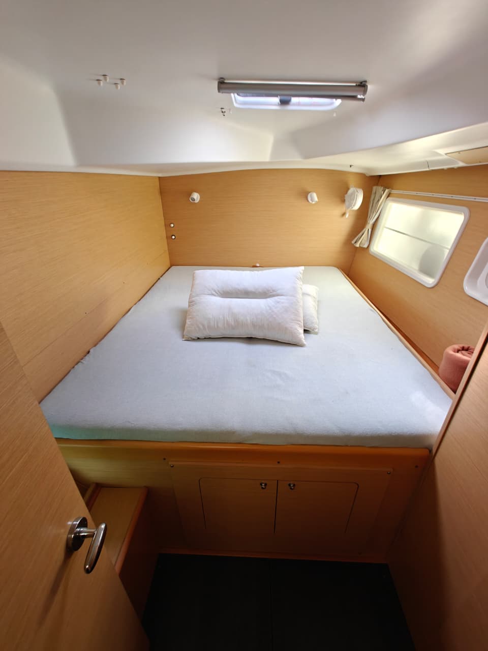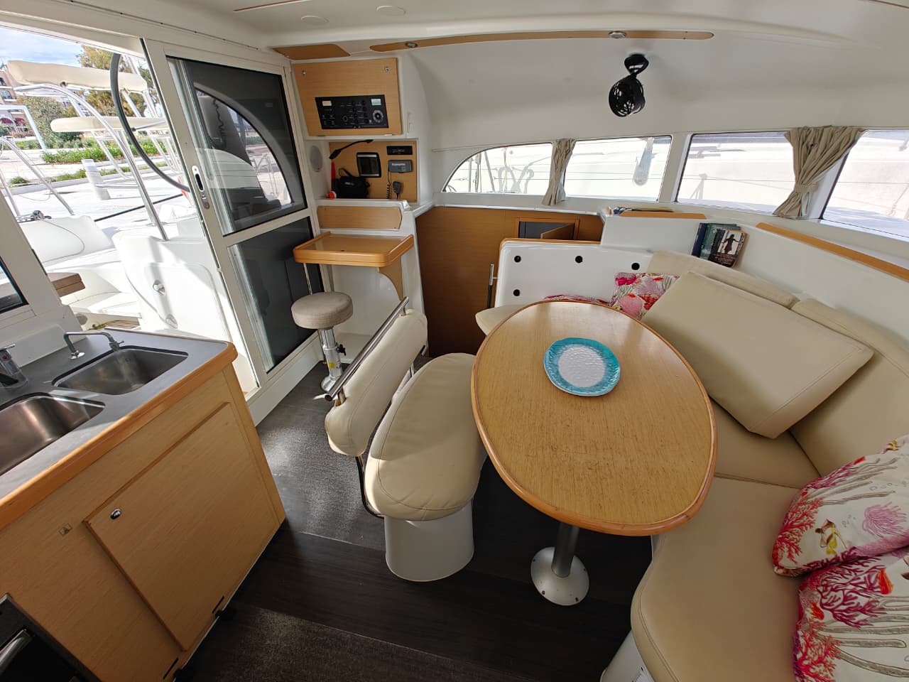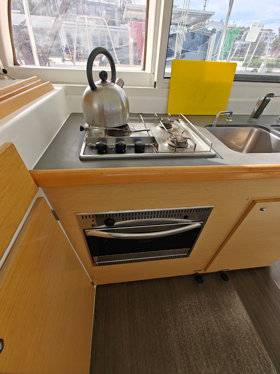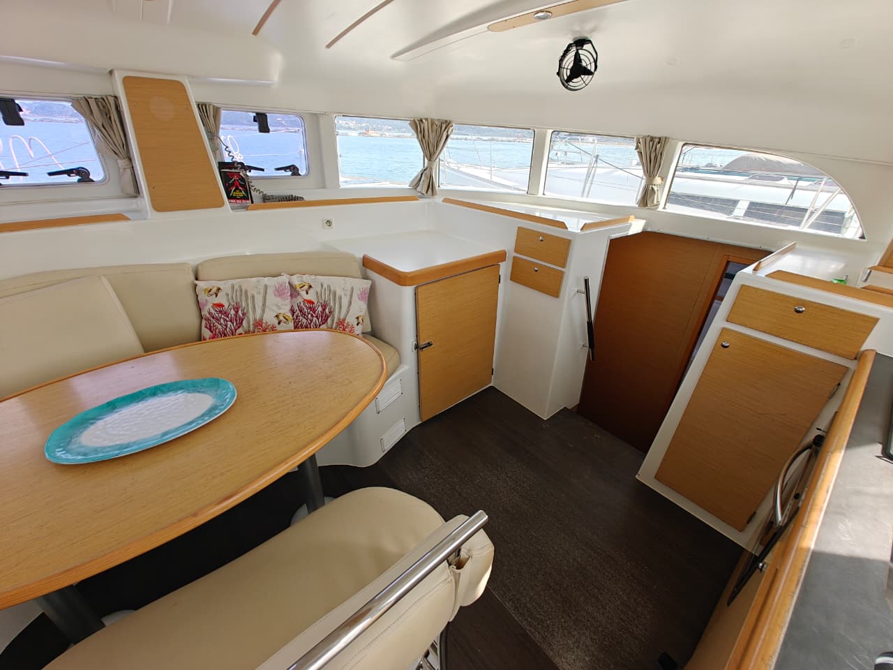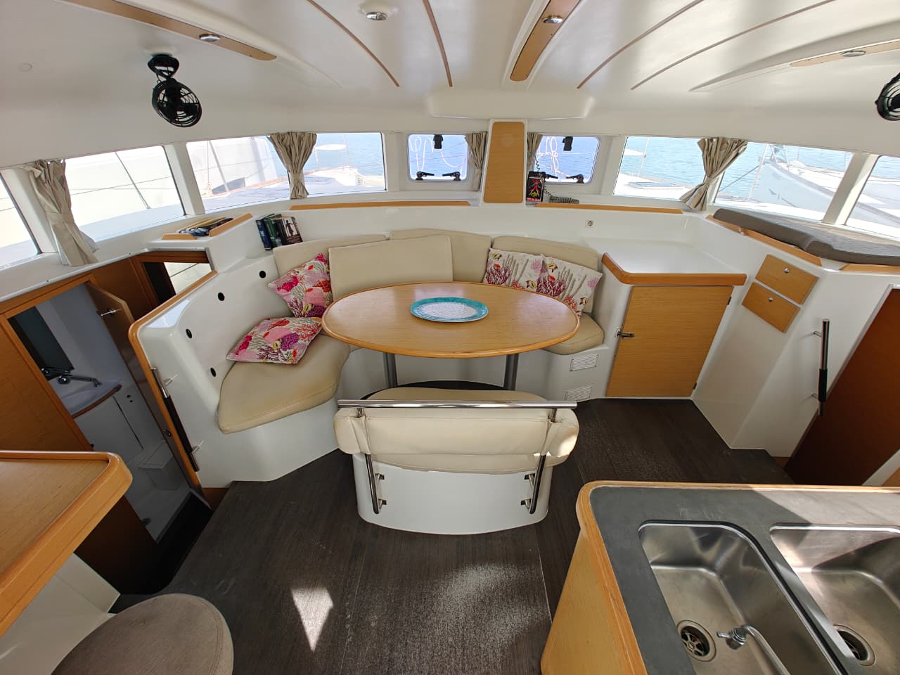 Below deck, the Lagoon 380 offers a bright and airy interior with 4 double cabins plus 2 single berths and 2 electric heads with showers, making it ideal for family cruising or charter use. The galley is fully equipped with a gas cooker, oven, refrigerator, hot water system, and ample kitchen utensils, ensuring all the comforts of home at sea.