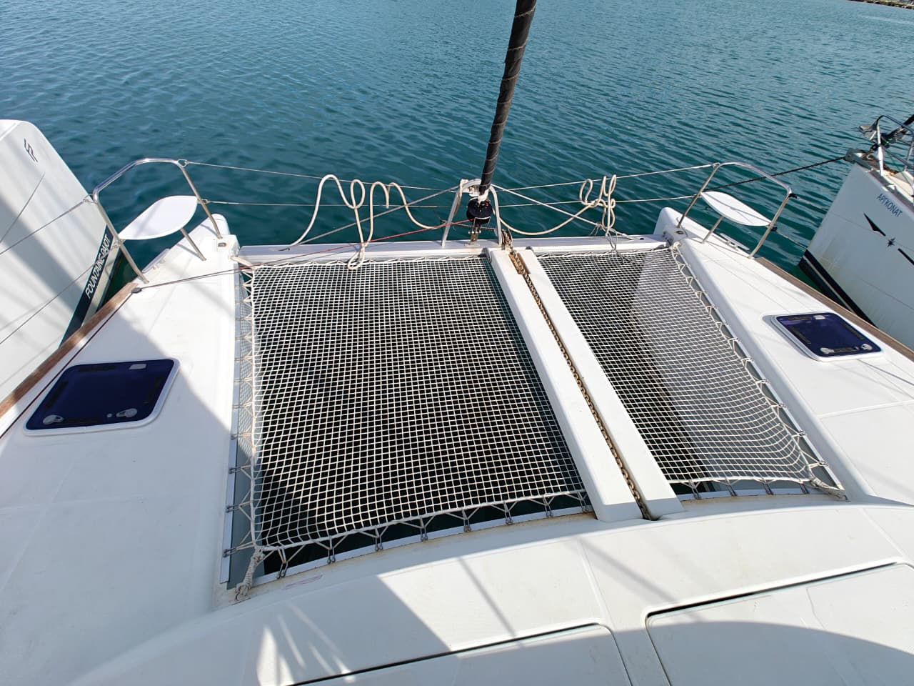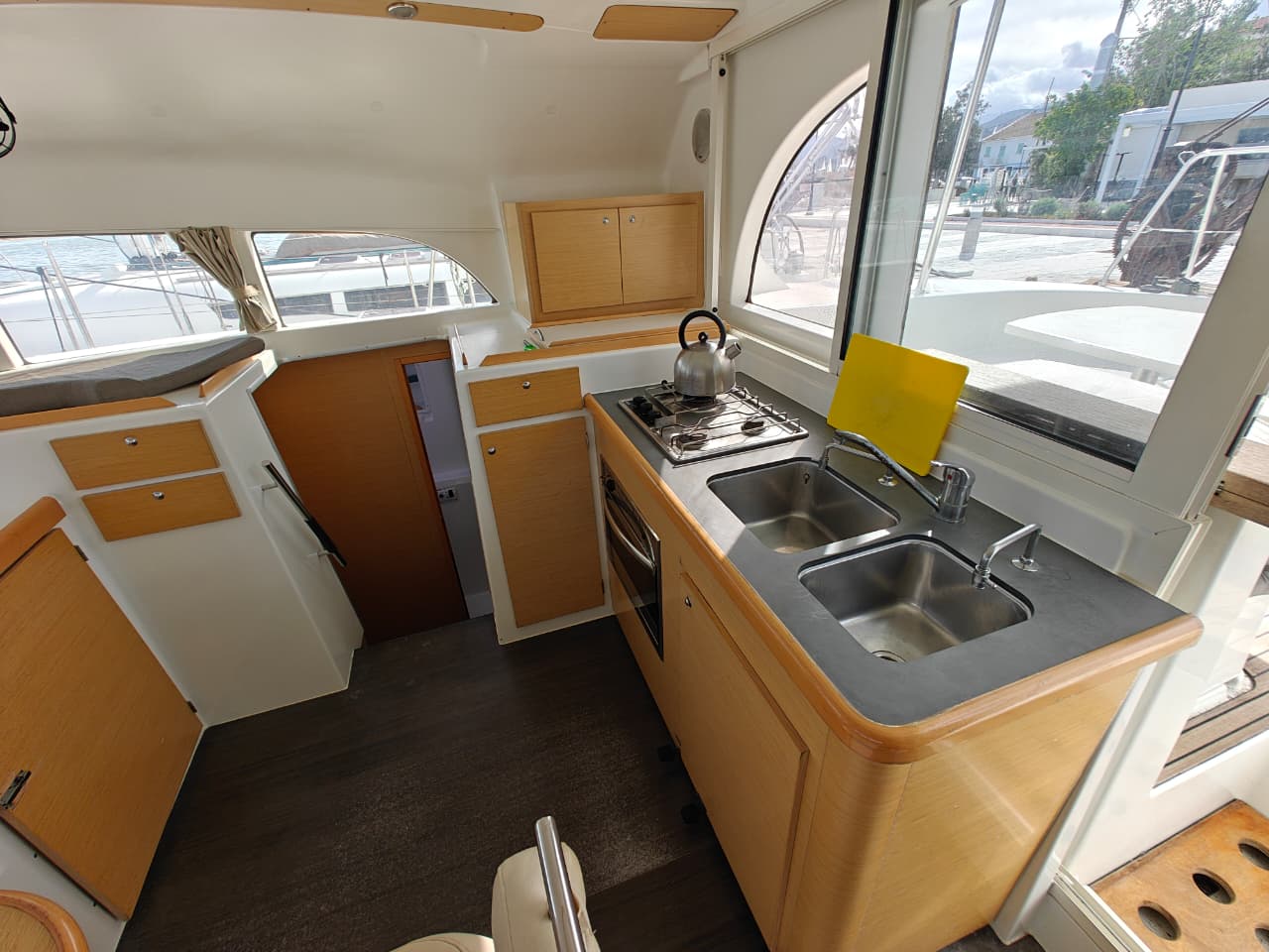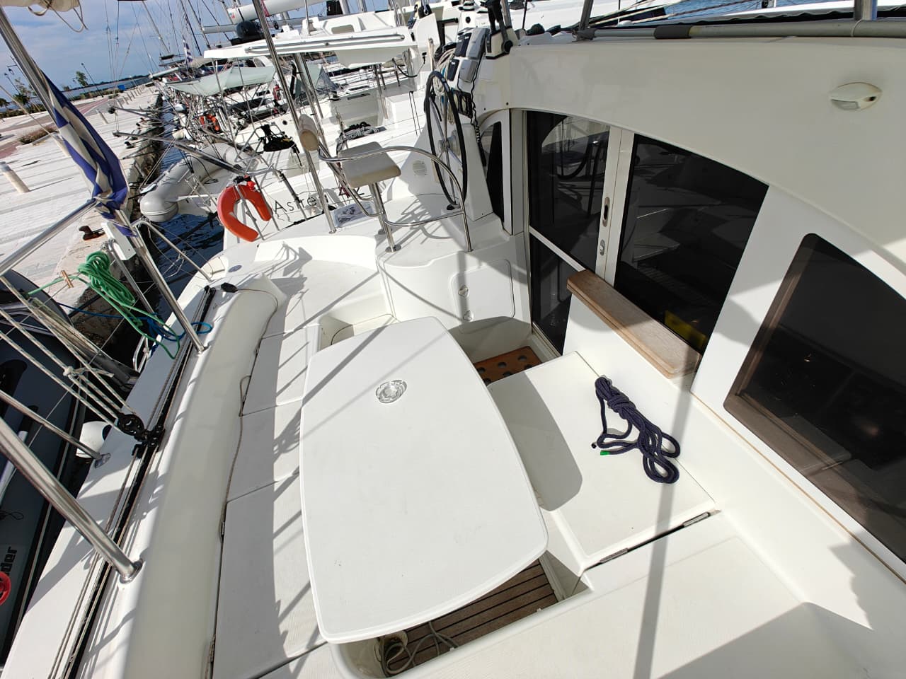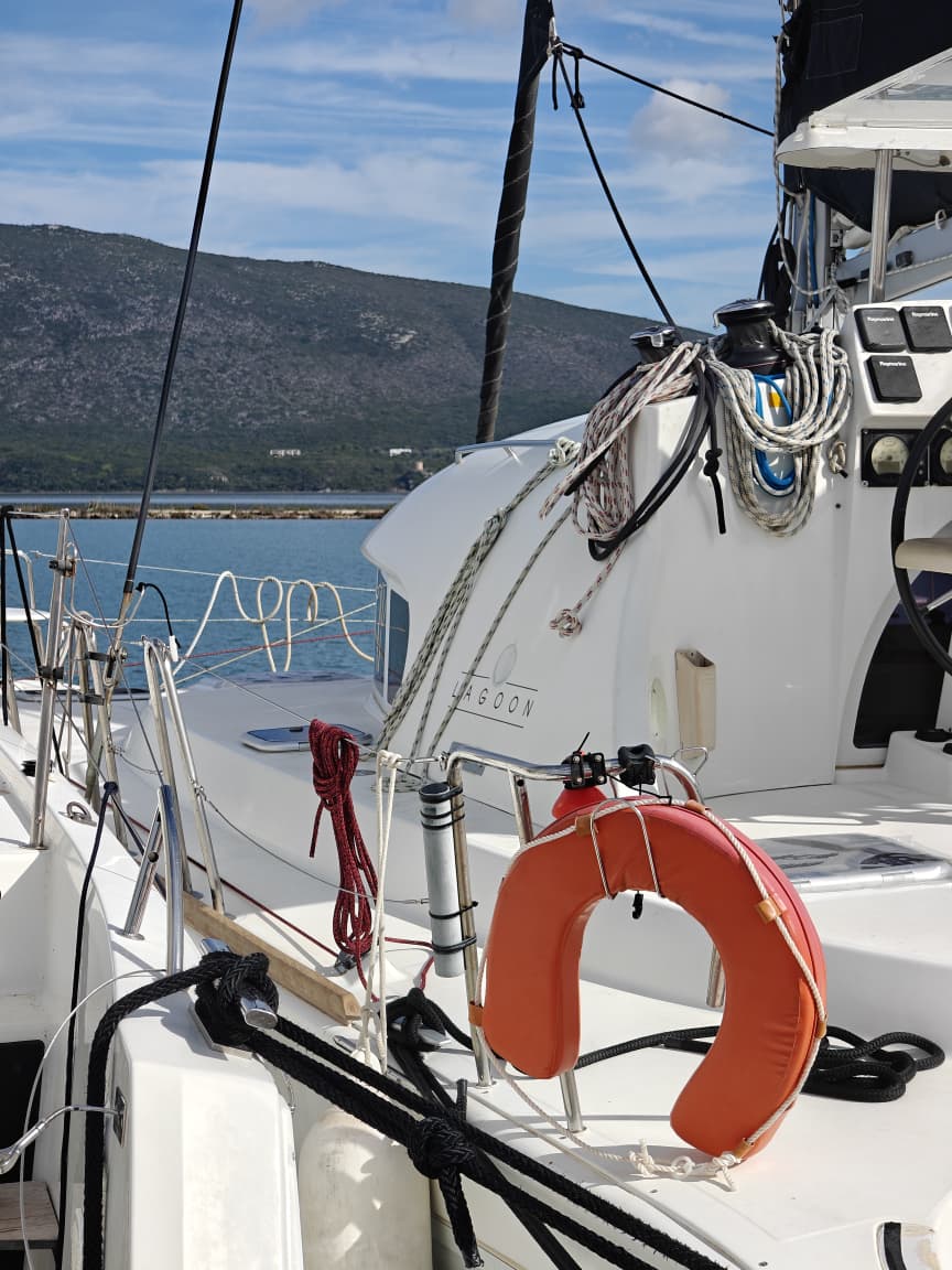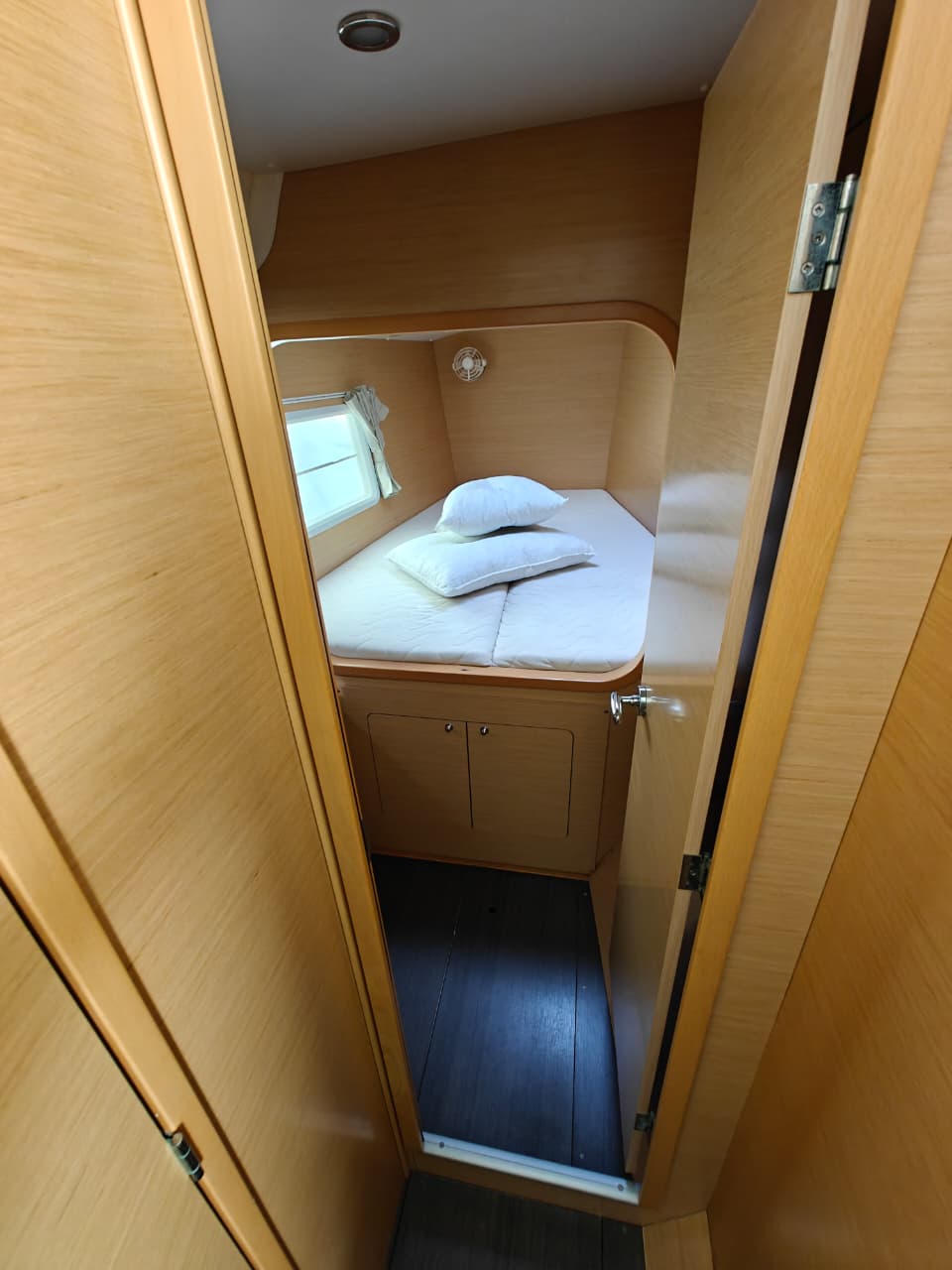 Below deck, the Lagoon 380 offers a bright and airy interior with 4 double cabins plus 2 single berths and 2 electric heads with showers, making it ideal for family cruising or charter use. The galley is fully equipped with a gas cooker, oven, refrigerator, hot water system, and ample kitchen utensils, ensuring all the comforts of home at sea.