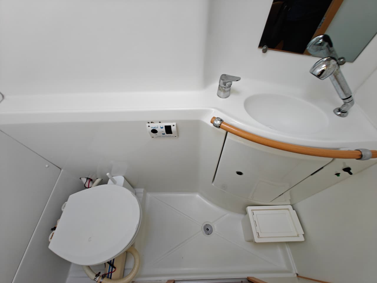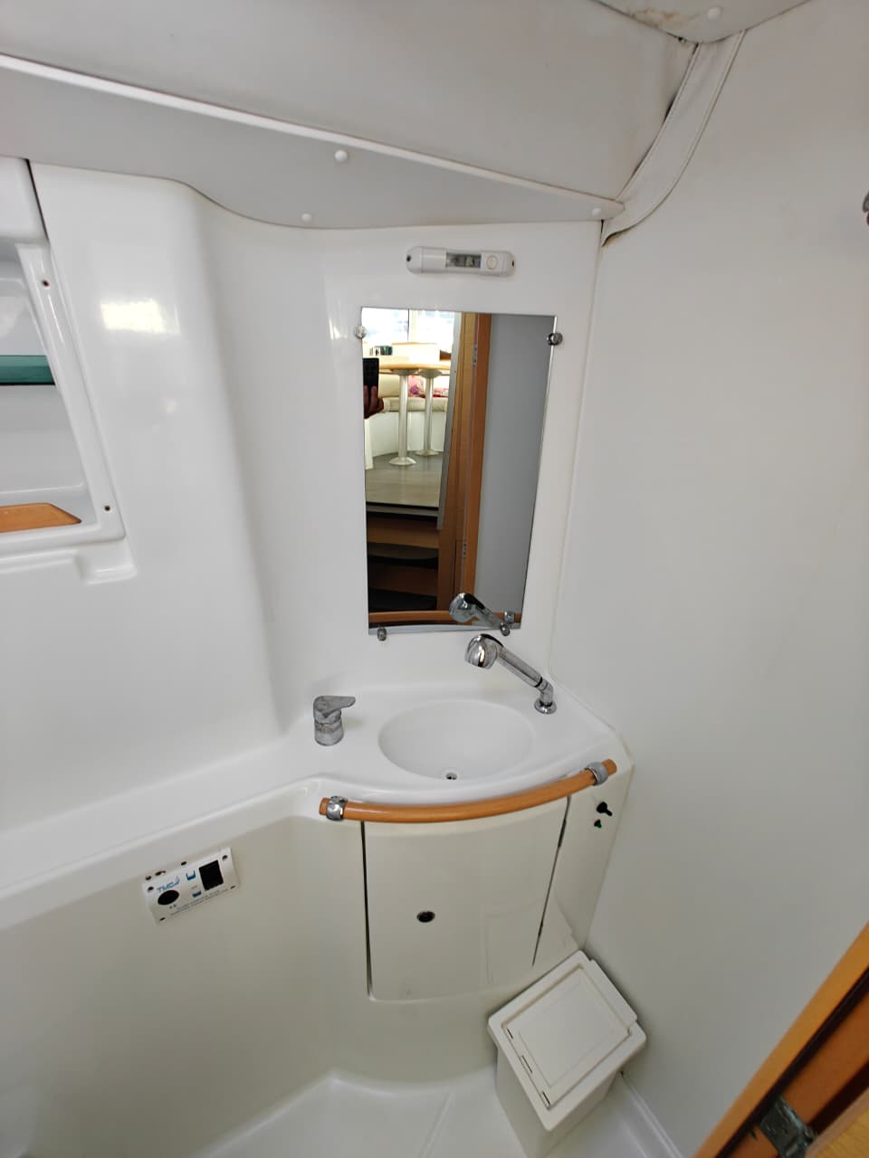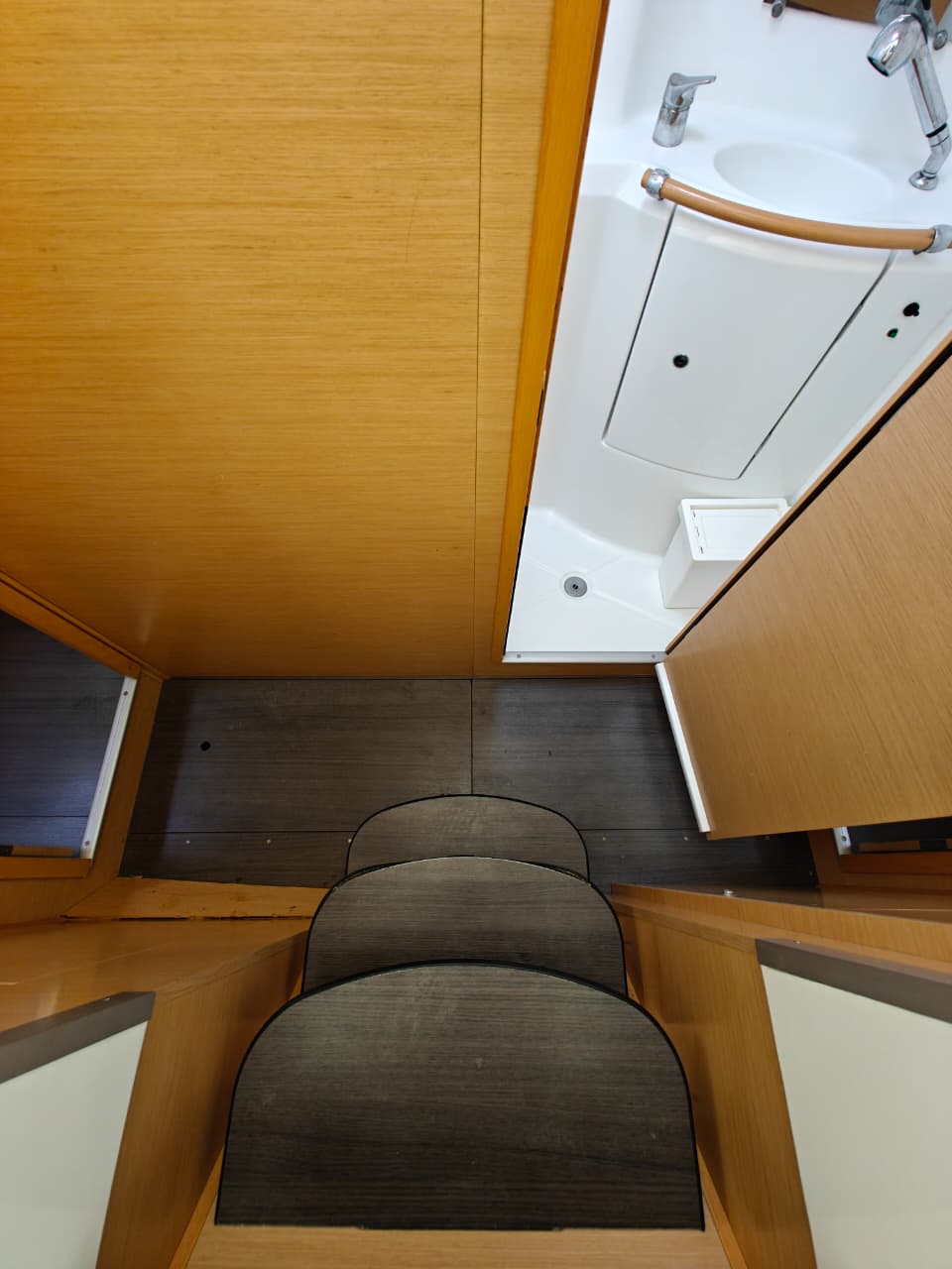 The deck is thoughtfully equipped with a bimini top, sprayhood, electric anchor windlass, cockpit table, swimming ladder, and outside shower, all designed to enhance onboard comfort and convenience. A gangway, bosun’s chair, and main deck compass further add to the vessel’s practicality and safety.