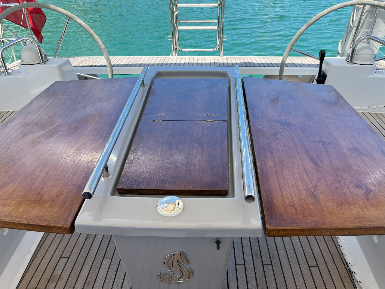 Two Solbianflex solar panels discreetly mounted on the coachroof supply ample power at anchor, while the spacious cockpit- with its folding bathing platform, large lockers, and dual helm stations-offers safety and practicality.