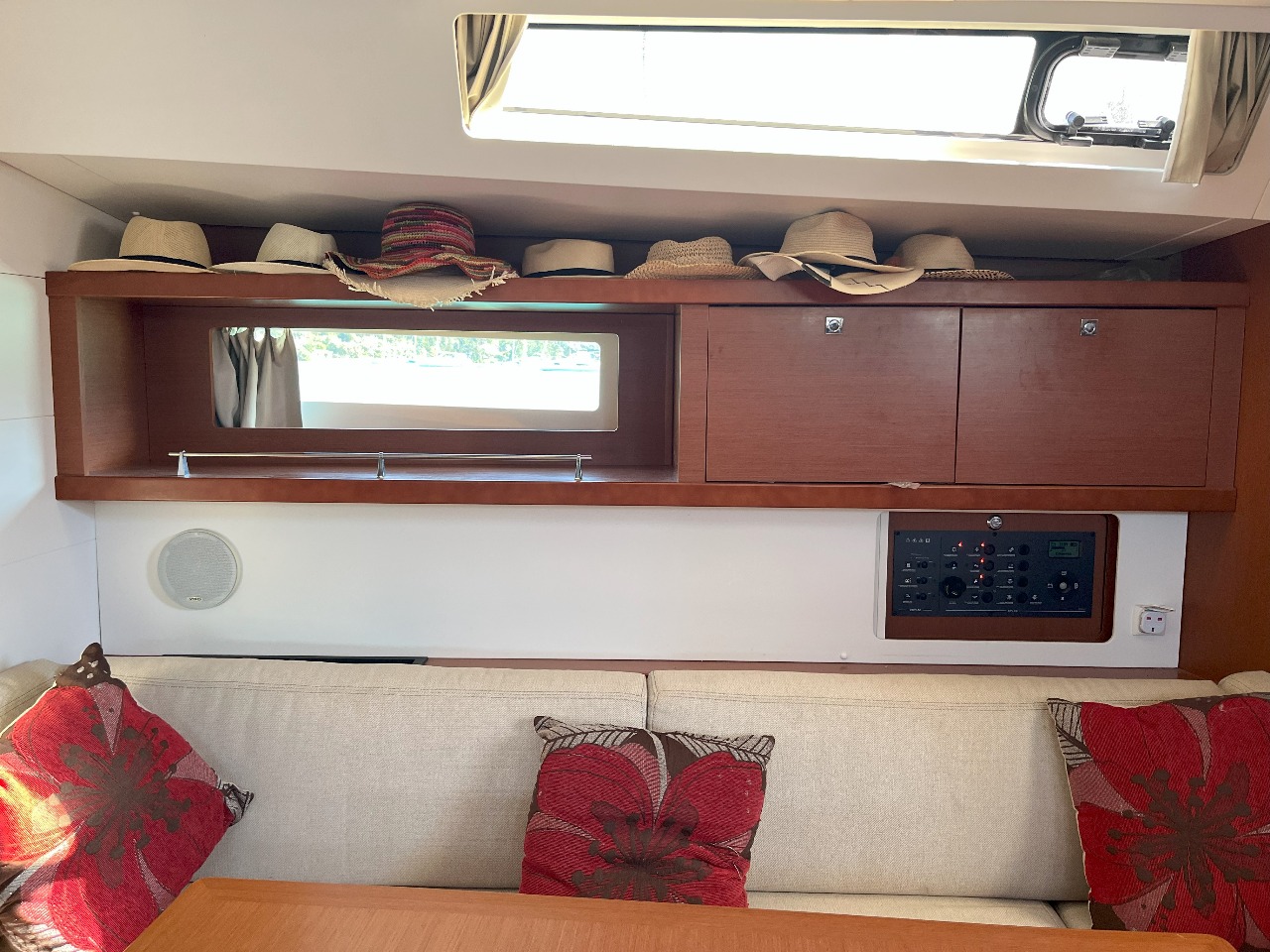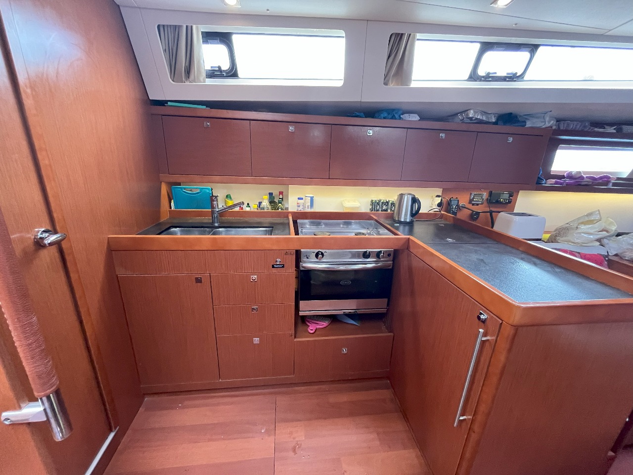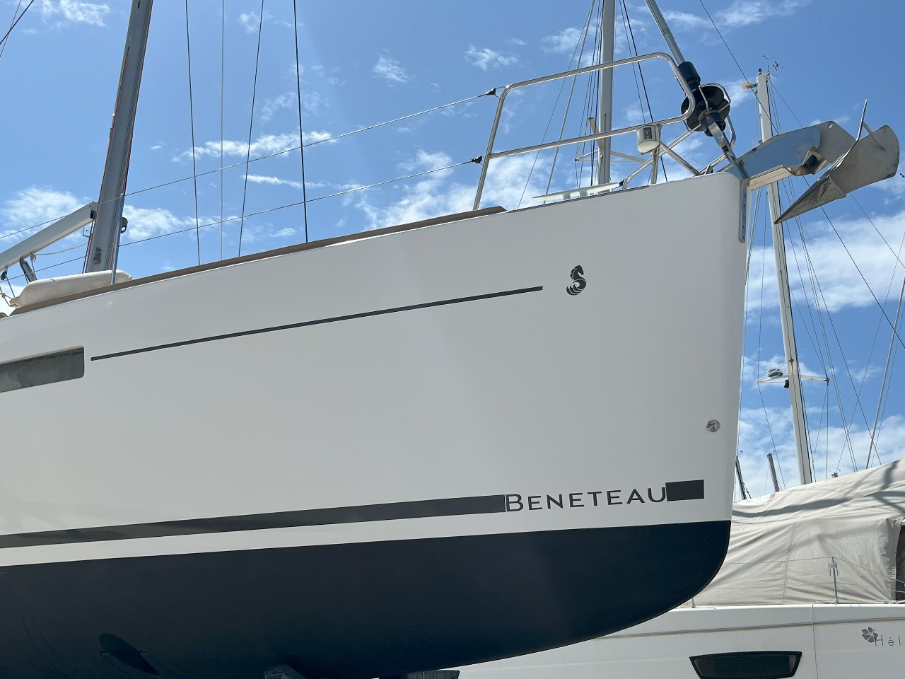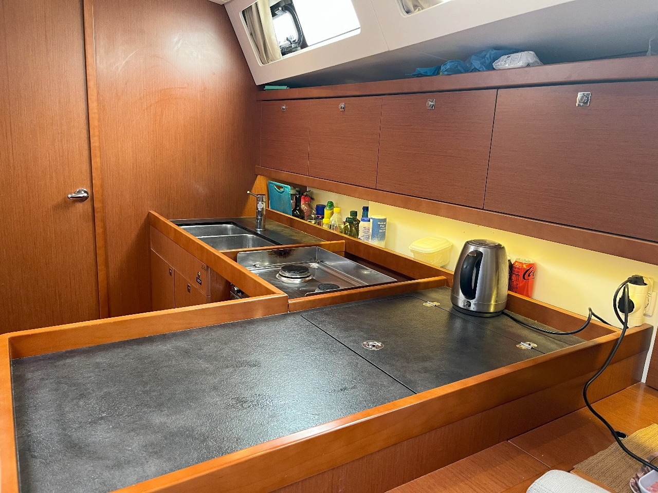 Below deck, the yacht boasts the highest specification available from Beneteau at the time of purchase, including air-conditioning, refined interior finishes, hidden lighting, and even dedicated wine lockers.