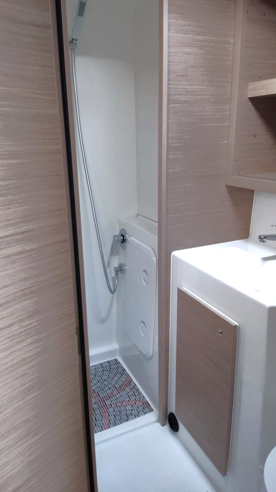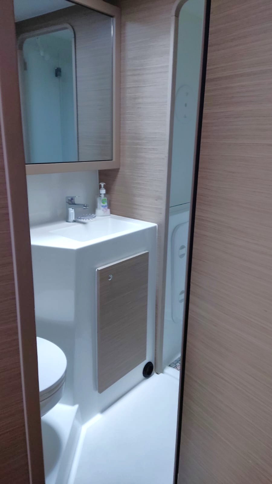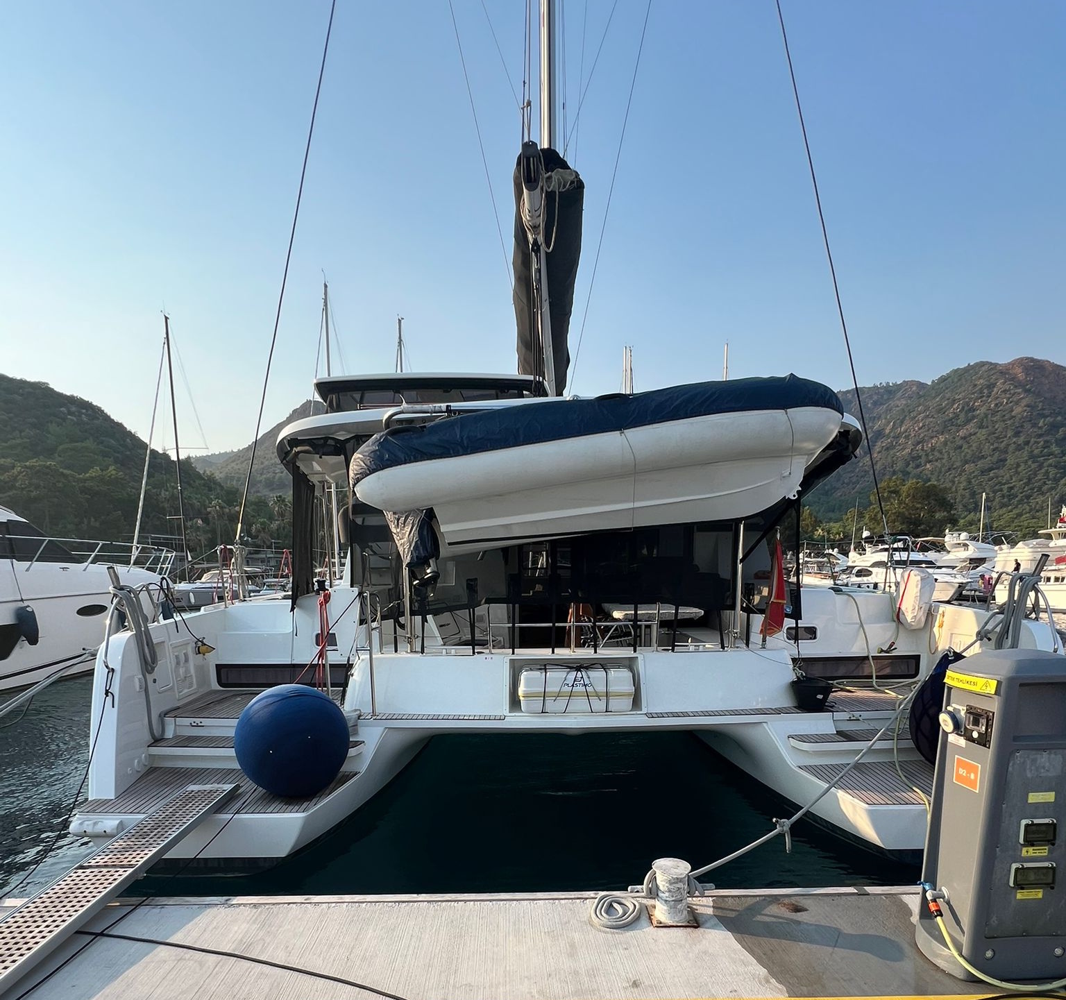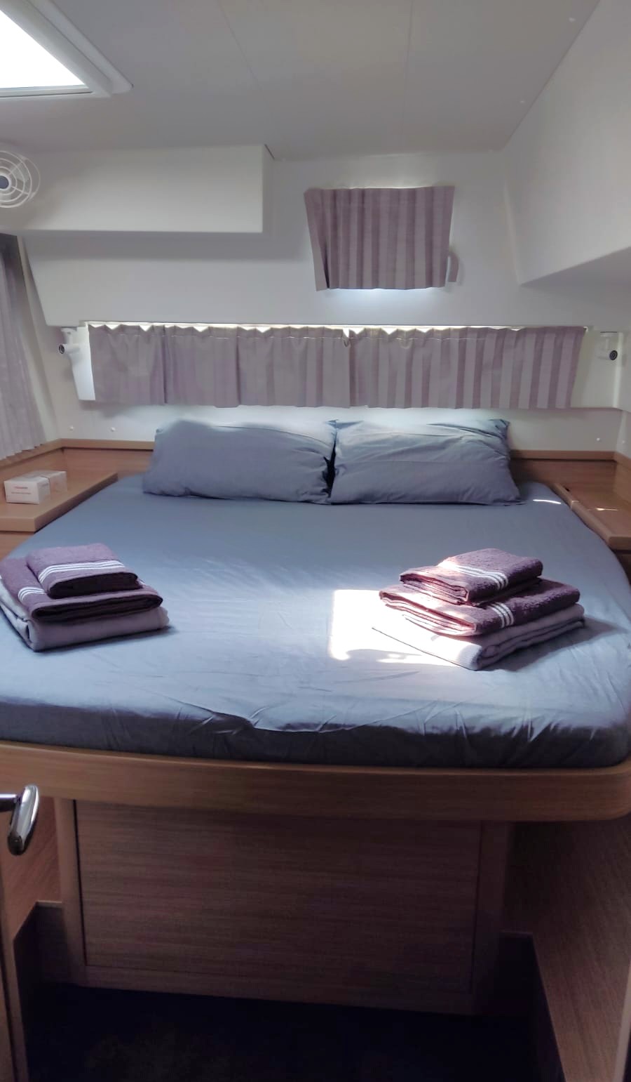 Powered by twin Yanmar 4JH57 engines (2 x 57 HP), she cruises efficiently at 7 knots with a maximum speed of 9 knots. The 55 m² mainsail and Code 0 system provide strong sailing performance in various wind conditions, while the inclusion of a watermaker, air conditioning, heating, and solar panels ensures autonomy and comfort on extended voyages.