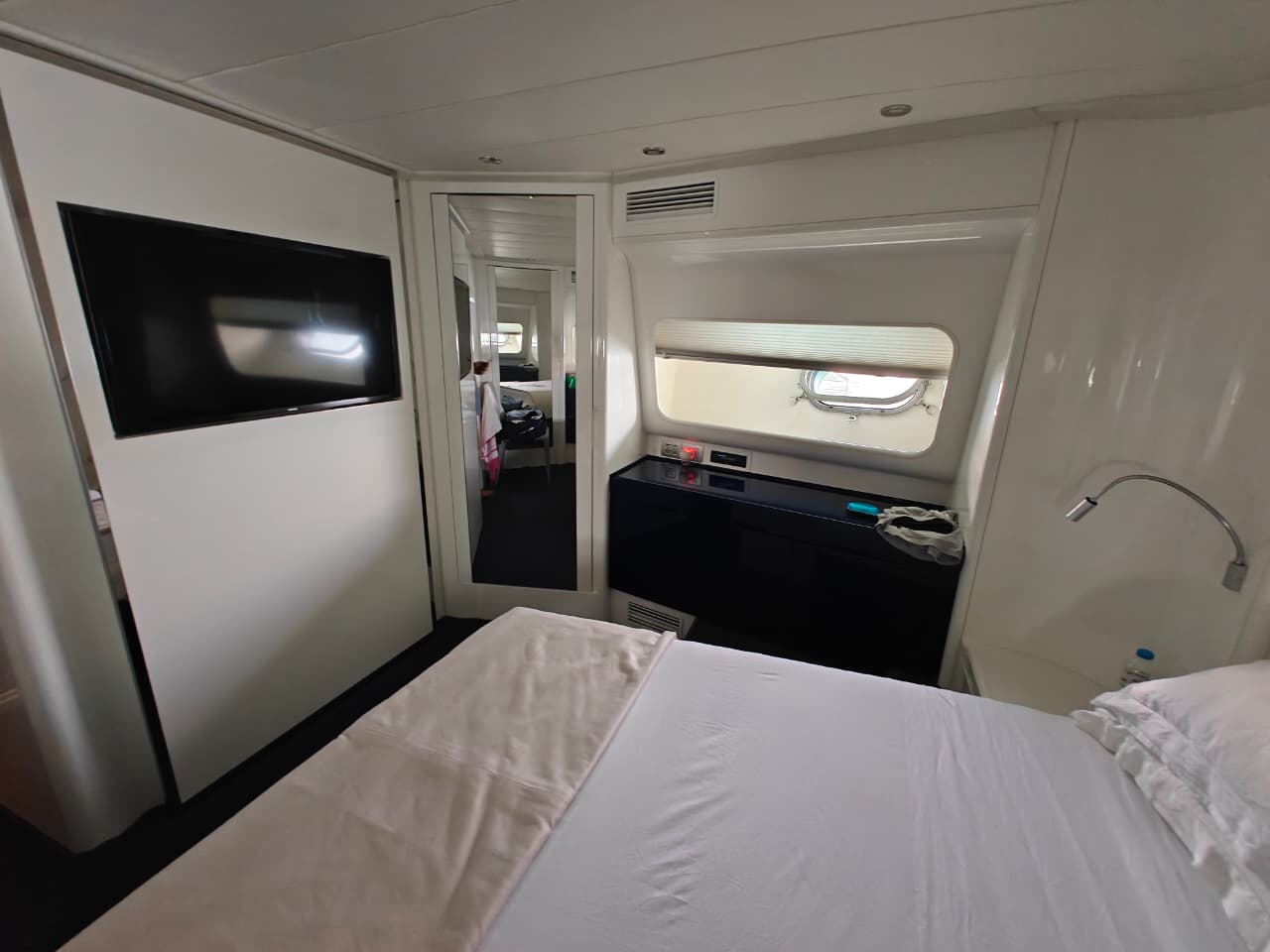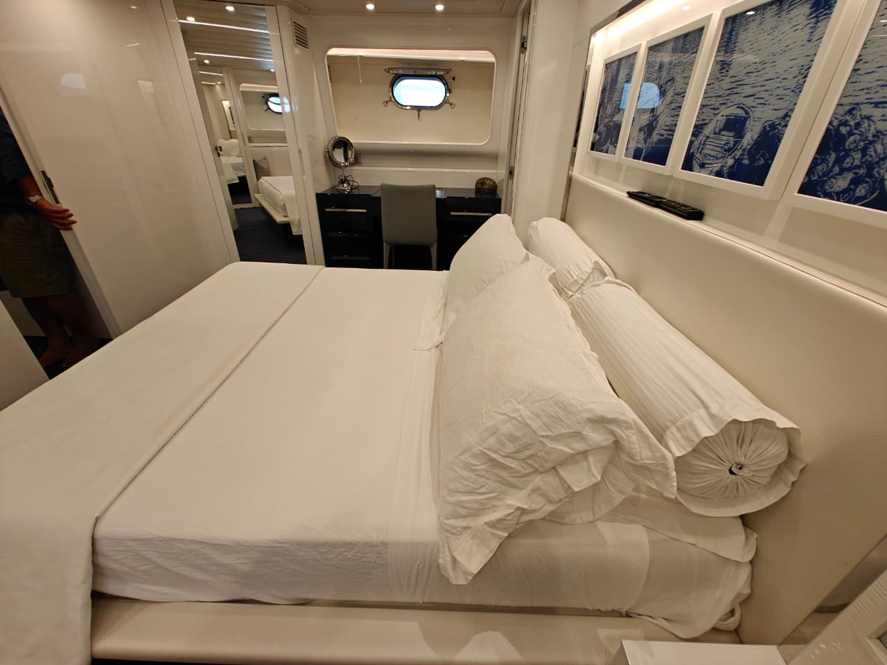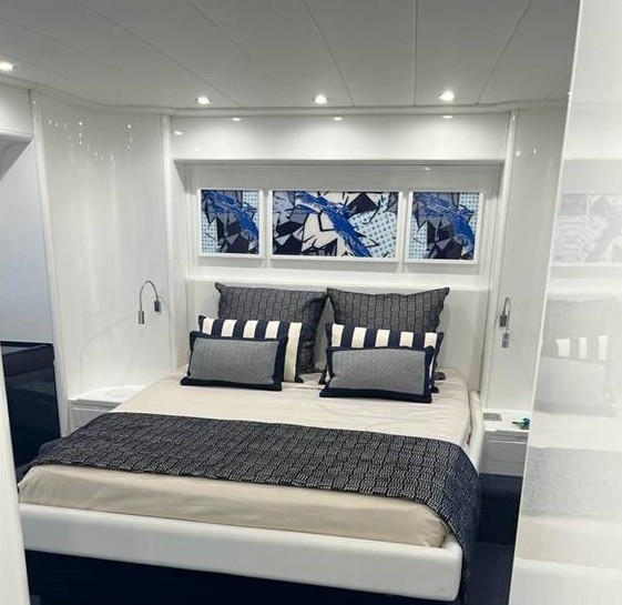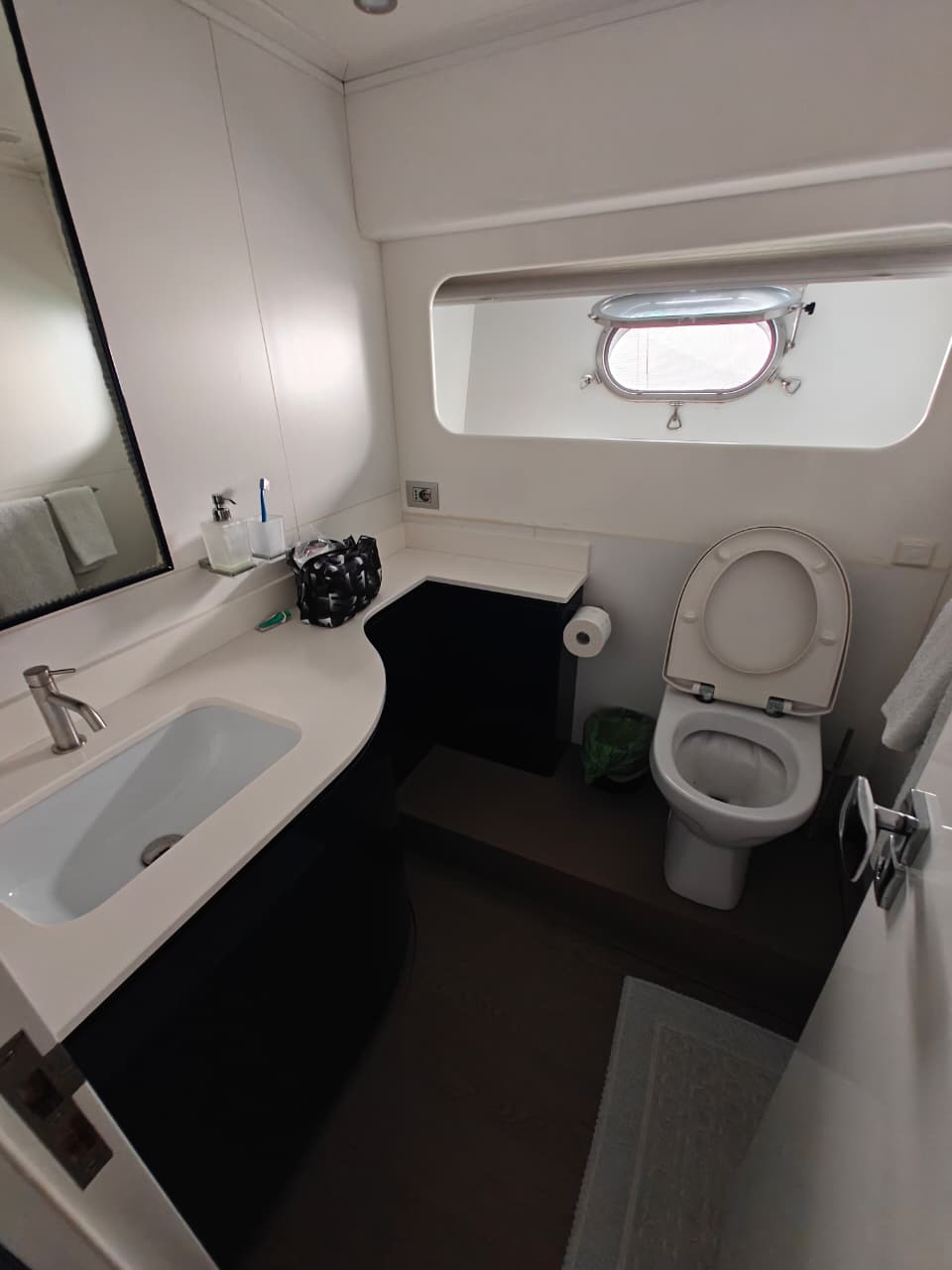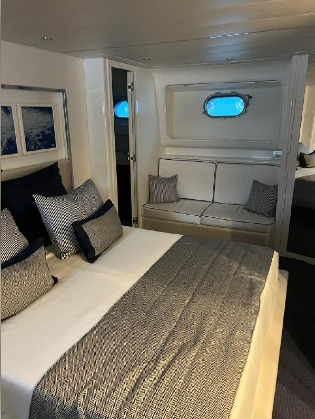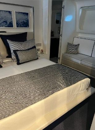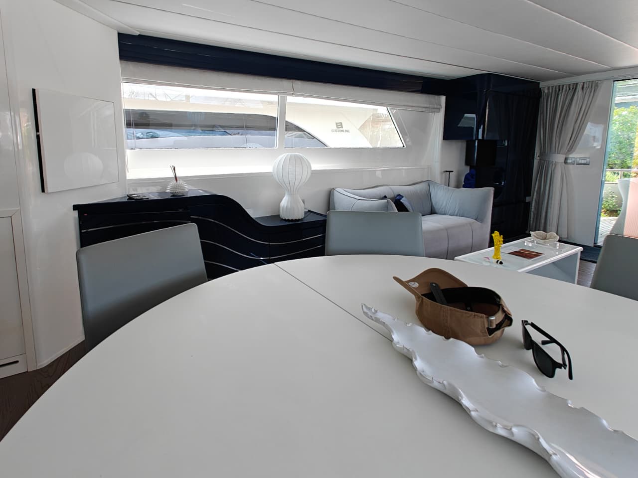 Designed for both comfort and functionality, the yacht offers an inviting layout with three main guest cabins: a full-beam master suite with two bathrooms, a VIP double cabin with en-suite shower, and a triple cabin with Pullman beds and separate facilities. Crew accommodations are generous, featuring two dedicated crew cabins and a separate bathroom.