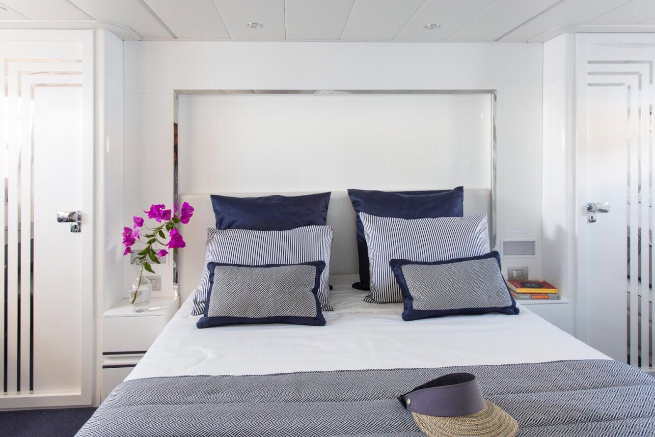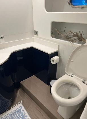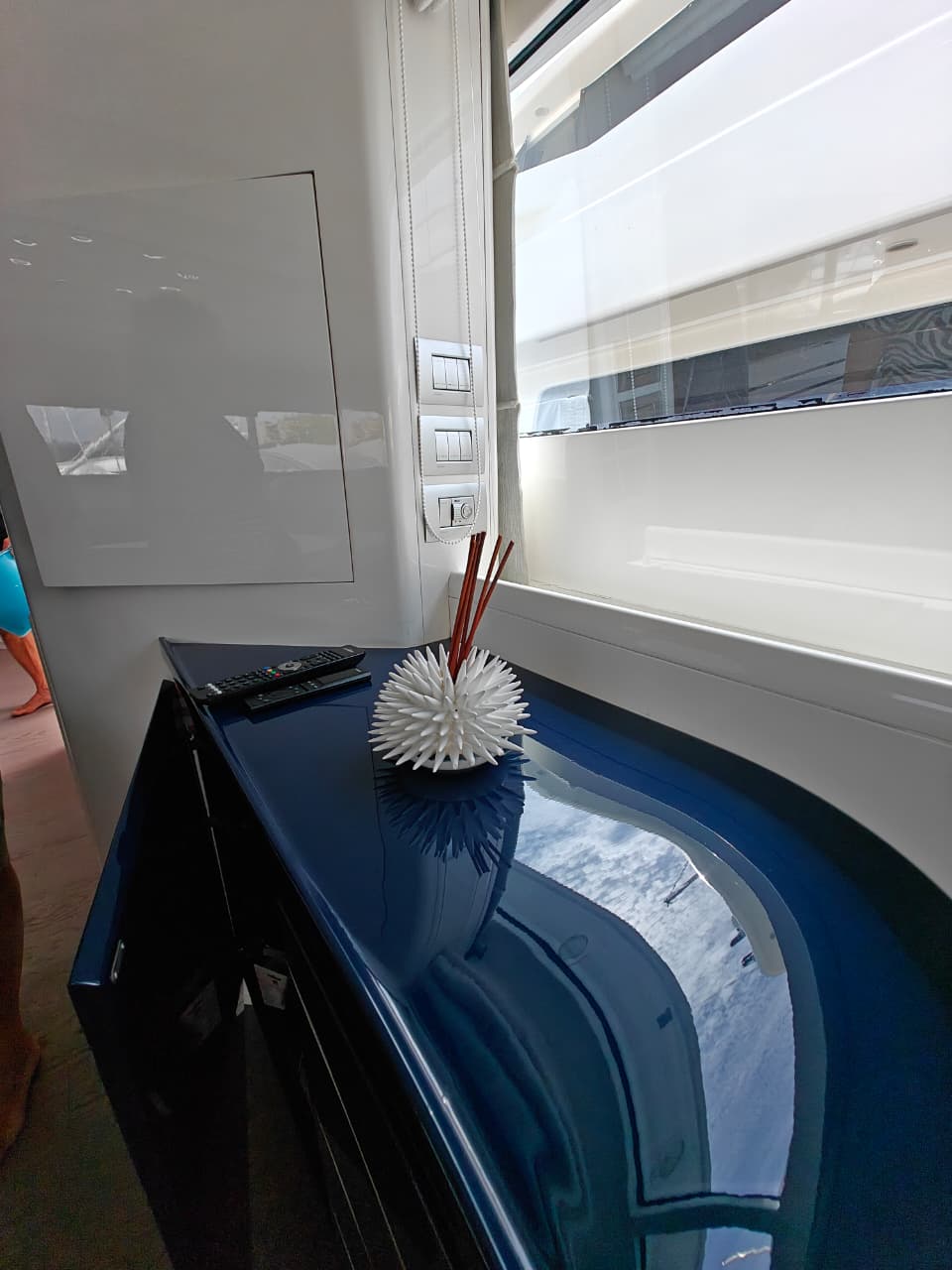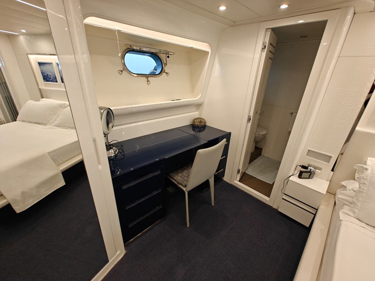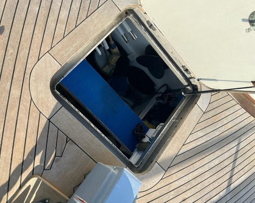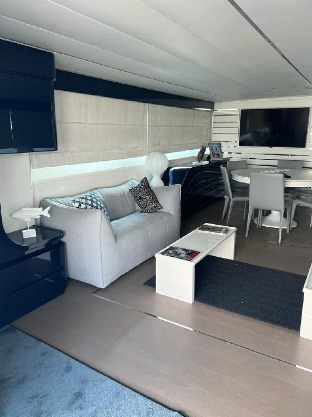 Designed for both comfort and functionality, the yacht offers an inviting layout with three main guest cabins: a full-beam master suite with two bathrooms, a VIP double cabin with en-suite shower, and a triple cabin with Pullman beds and separate facilities. Crew accommodations are generous, featuring two dedicated crew cabins and a separate bathroom.