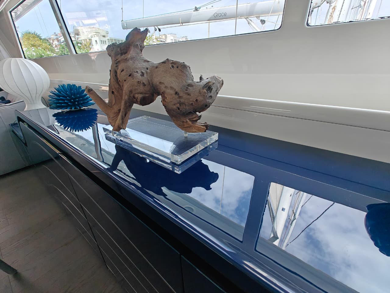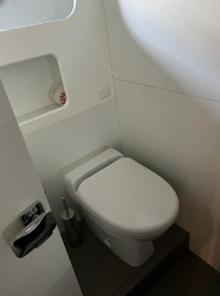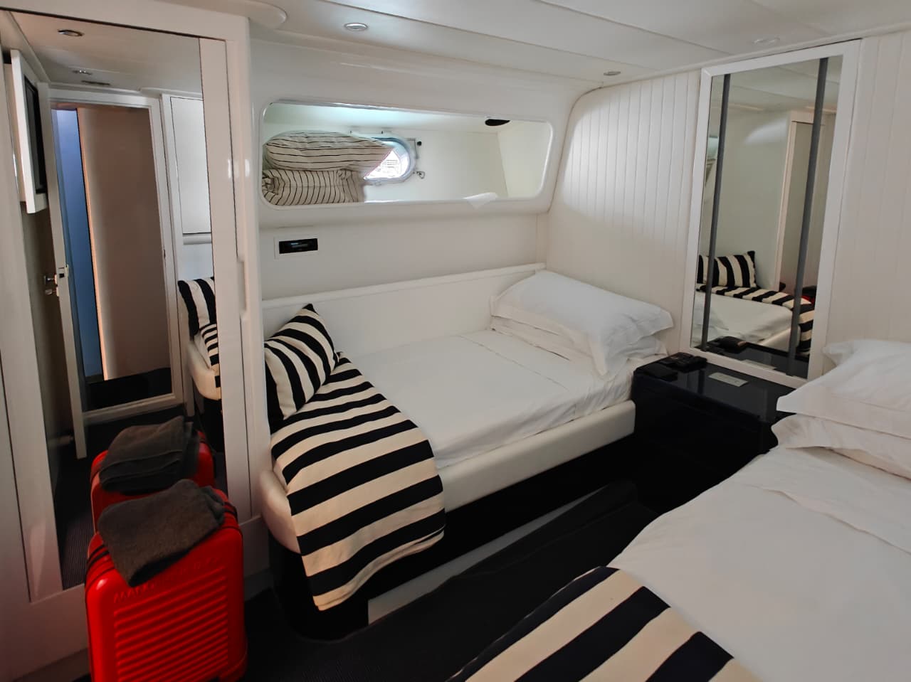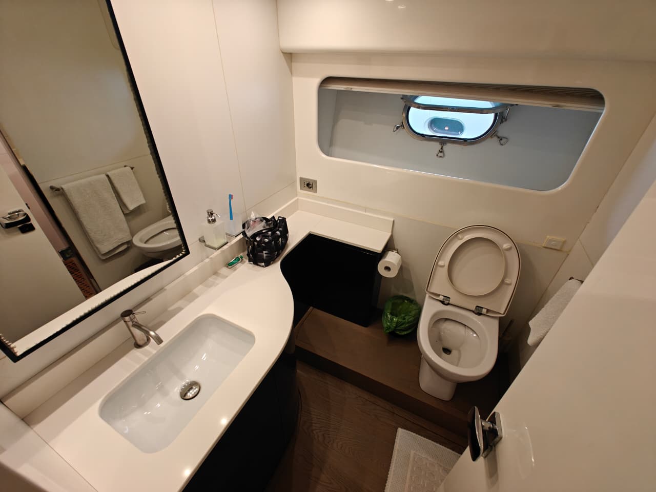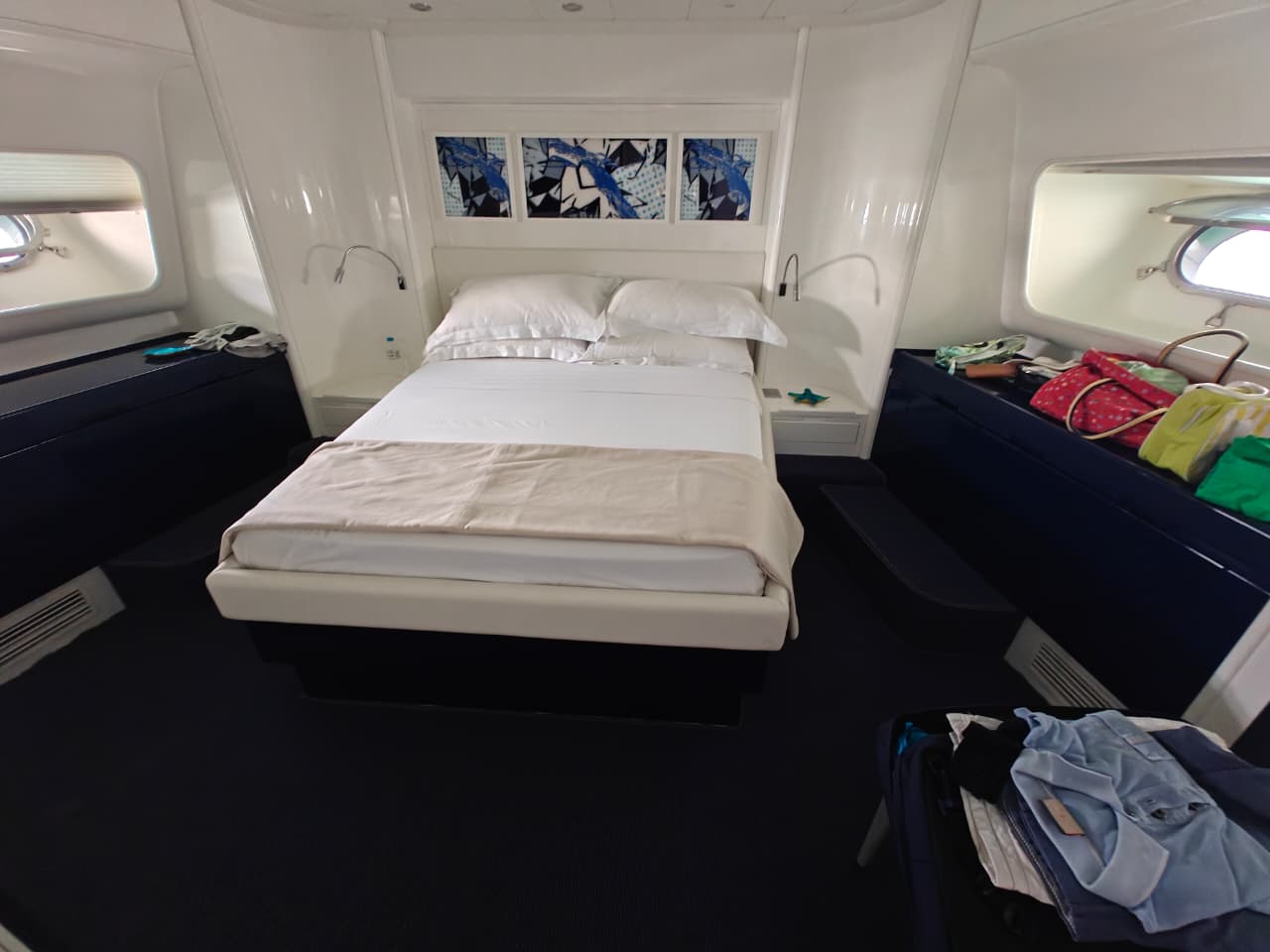 Designed for both comfort and functionality, the yacht offers an inviting layout with three main guest cabins: a full-beam master suite with two bathrooms, a VIP double cabin with en-suite shower, and a triple cabin with Pullman beds and separate facilities. Crew accommodations are generous, featuring two dedicated crew cabins and a separate bathroom.