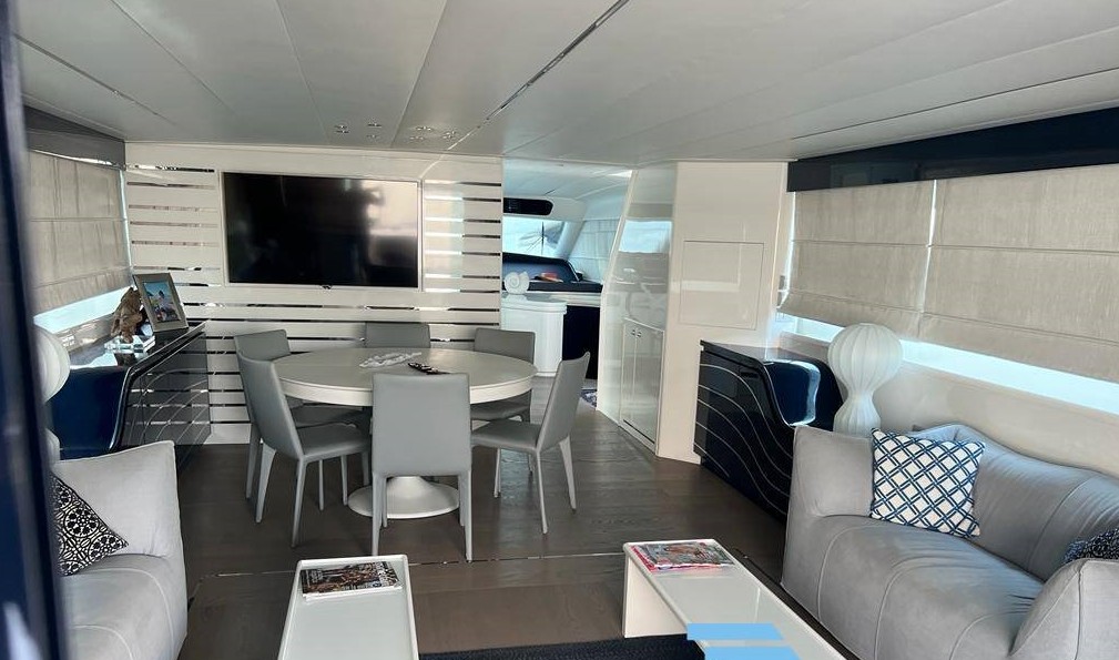 The main deck includes a bright salon with leather seating, a formal dining area, and a fully equipped galley, while the flybridge hosts a bar, grill, and lounge area under a bimini top.