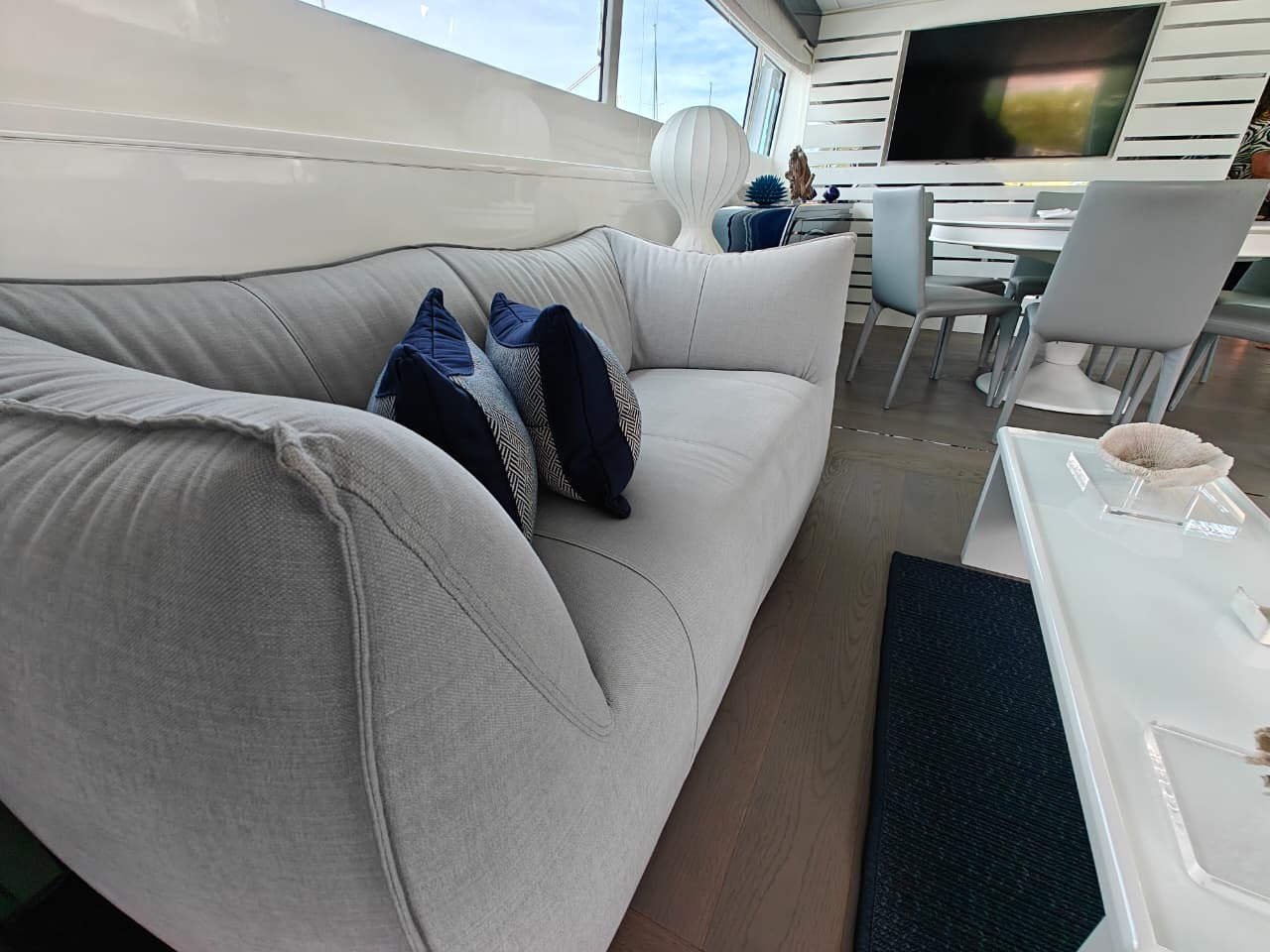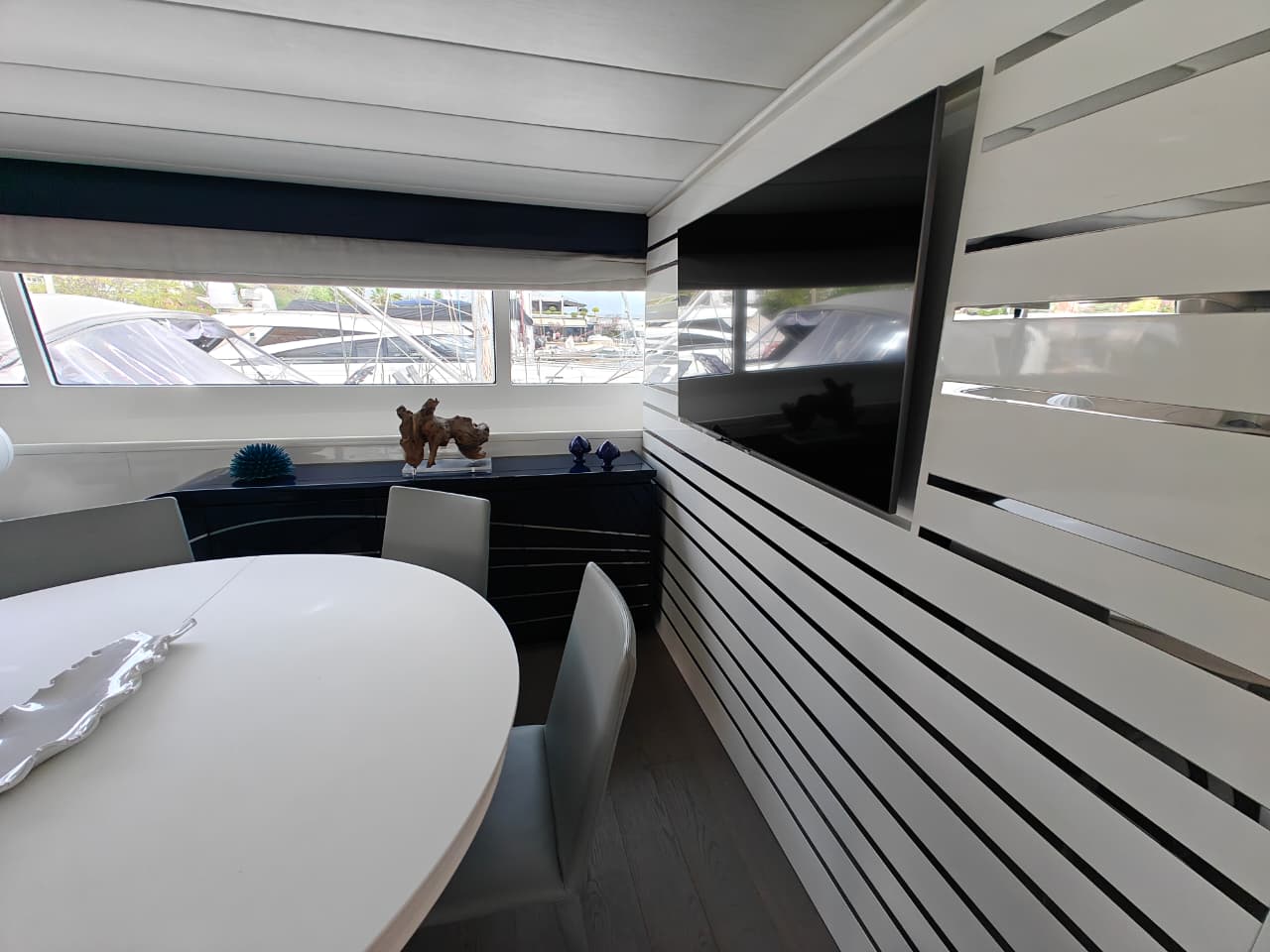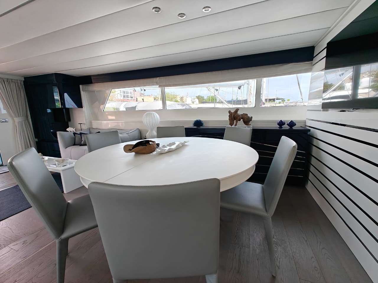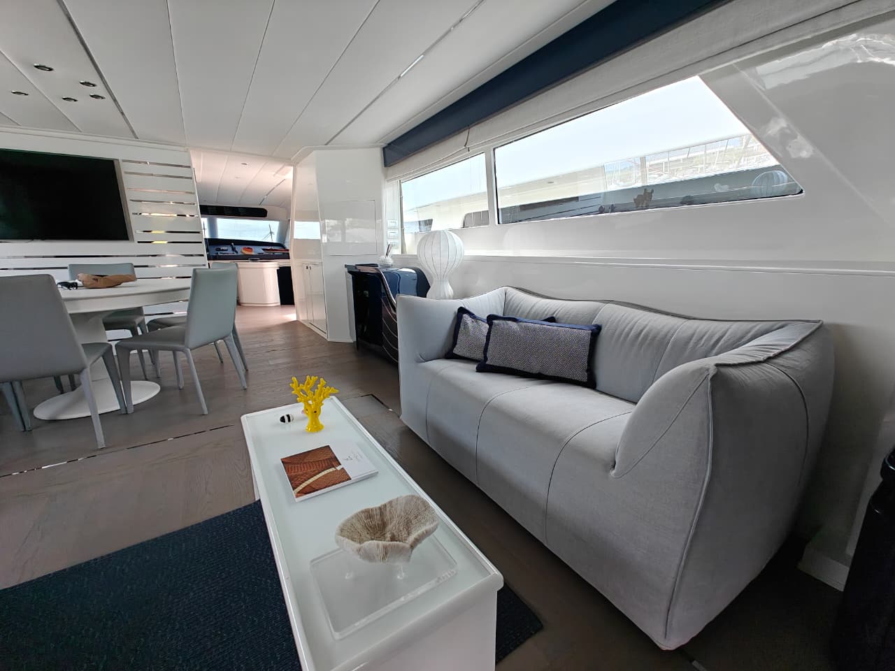 Elegant interiors with refined finishes, light leather sofas, parquet flooring in the salon and dining area, and carpet in the cabins.
