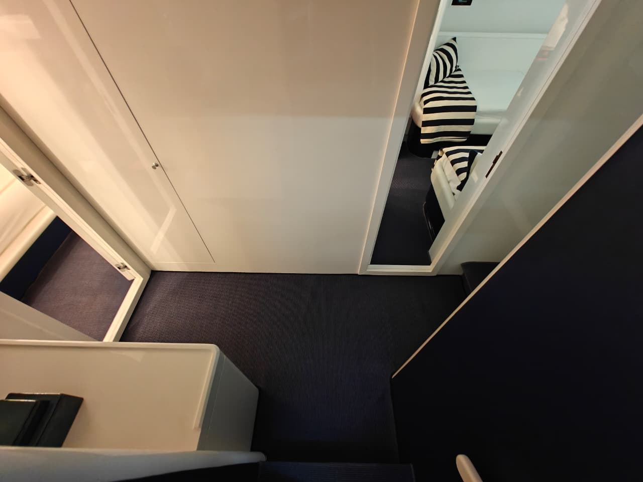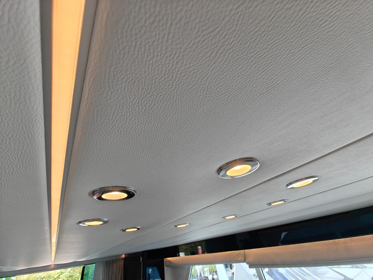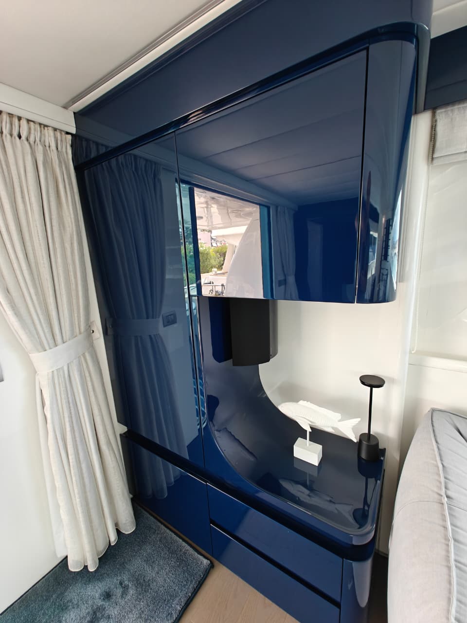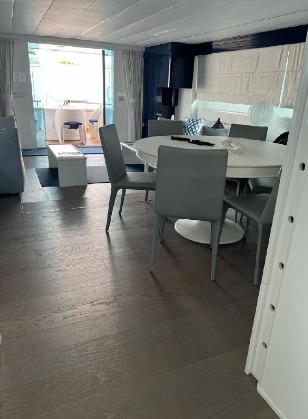 Elegant interiors with refined finishes, light leather sofas, parquet flooring in the salon and dining area, and carpet in the cabins.