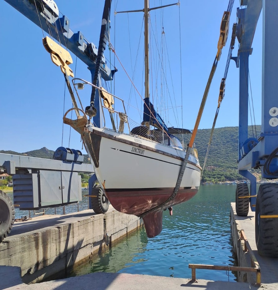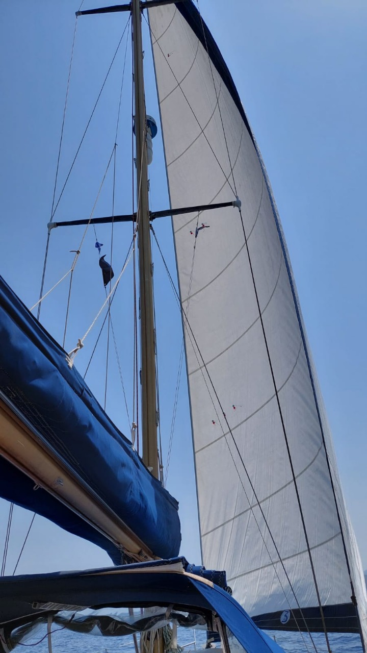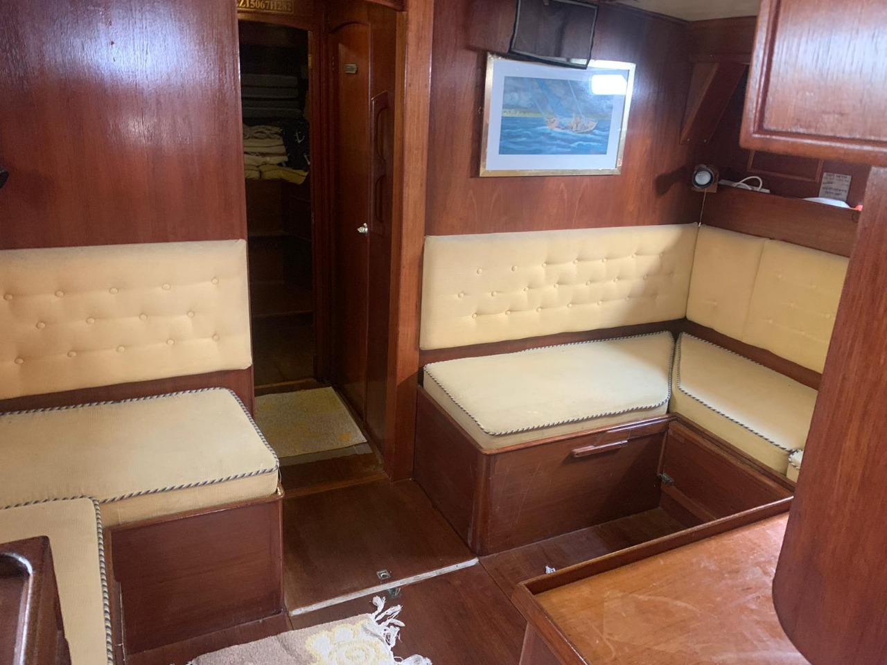 Her rig is a sloop with aluminium spars and roller furling, and she carries a full suite of sails including mainsail, genoa, and storm jib, with rigging last replaced in 2012 and sheets renewed as recently as 2022.