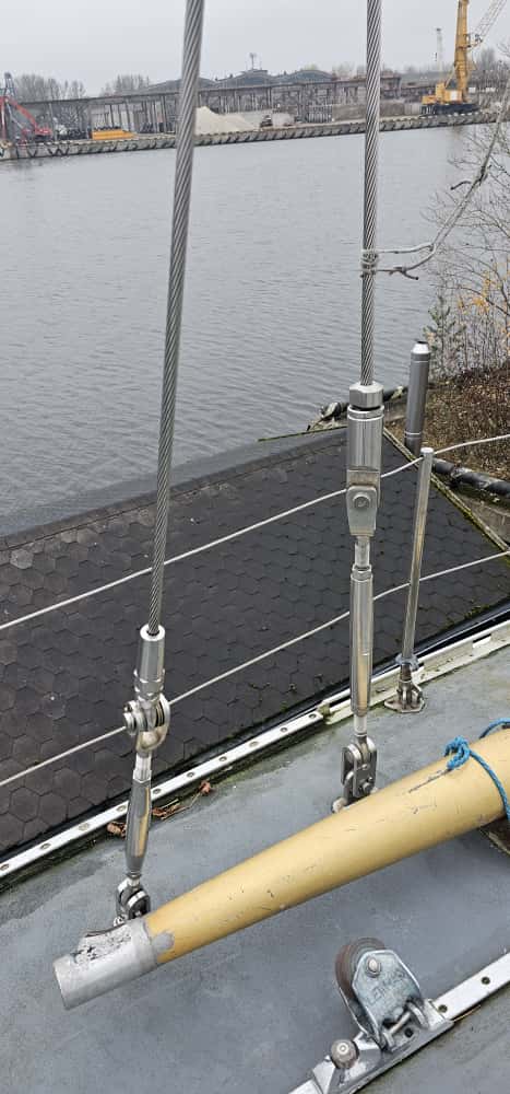 - Main halyards (main/jib): steel wire 6 mm, spare halyards (soft)
