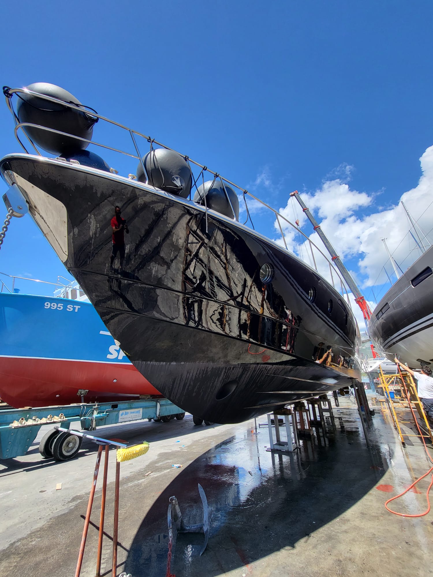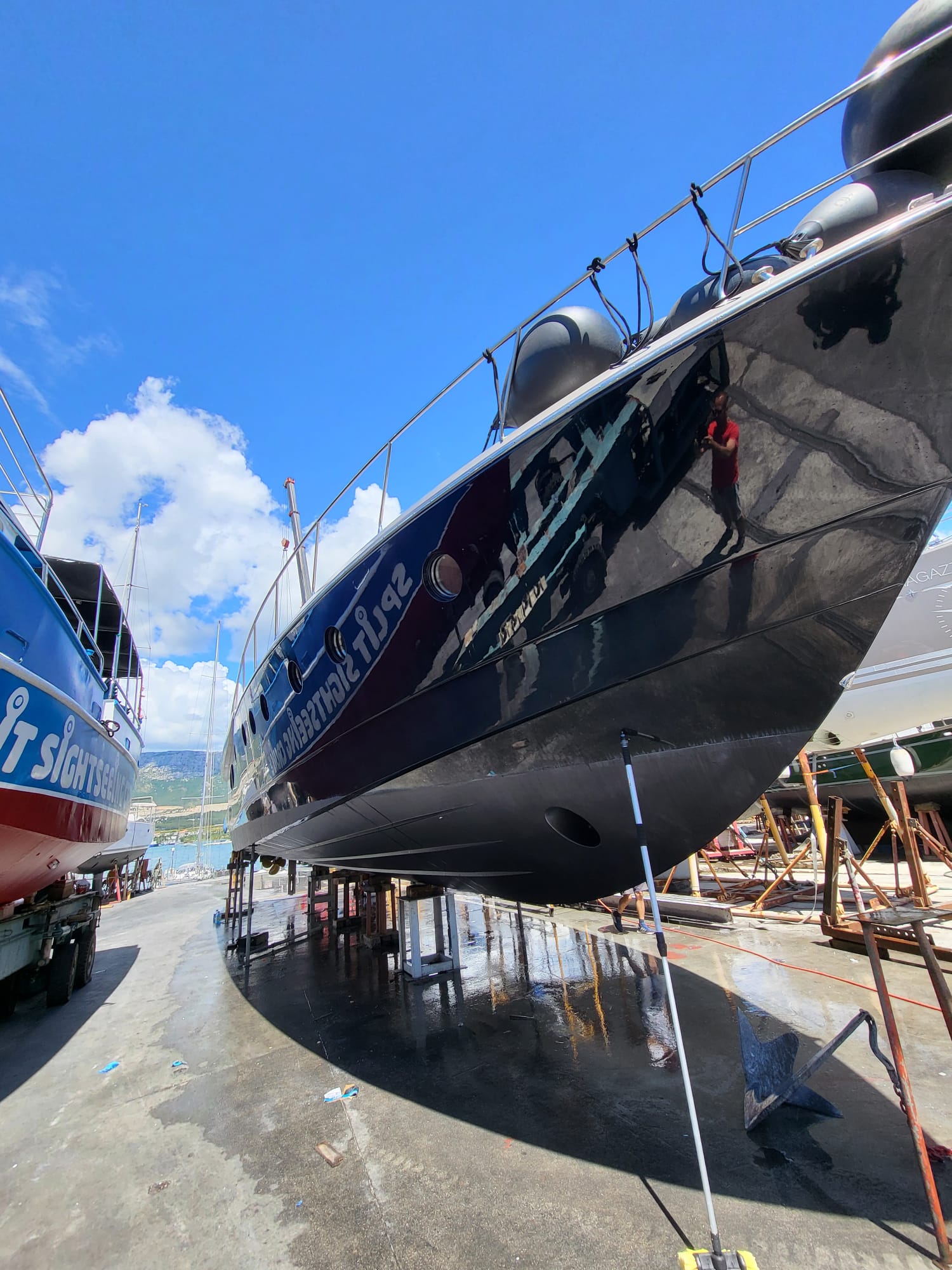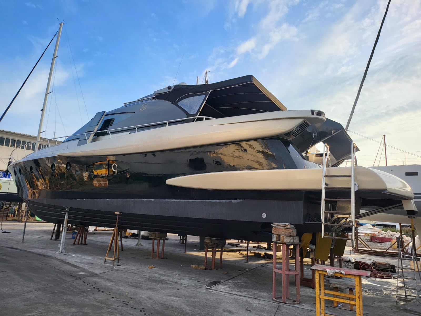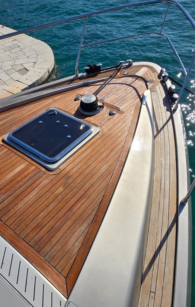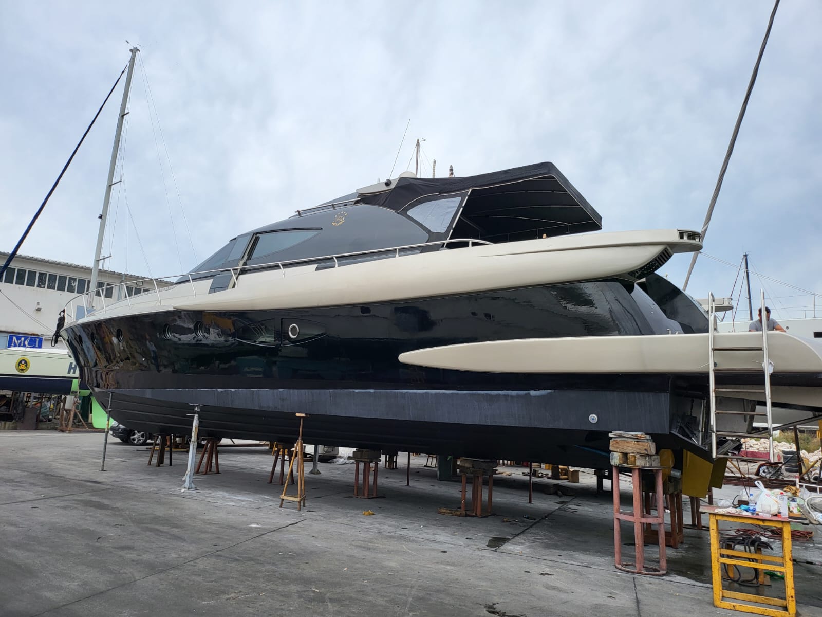 The salon offers a convertible dinette, four TVs, SAT antenna, and air conditioning throughout. Teak decks, new exterior cushions, and a bow sunbathing area with awning create inviting outdoor spaces, while the hydraulic gangway, dinghy garage, and tender Higfield 2.5m add to her practicality.