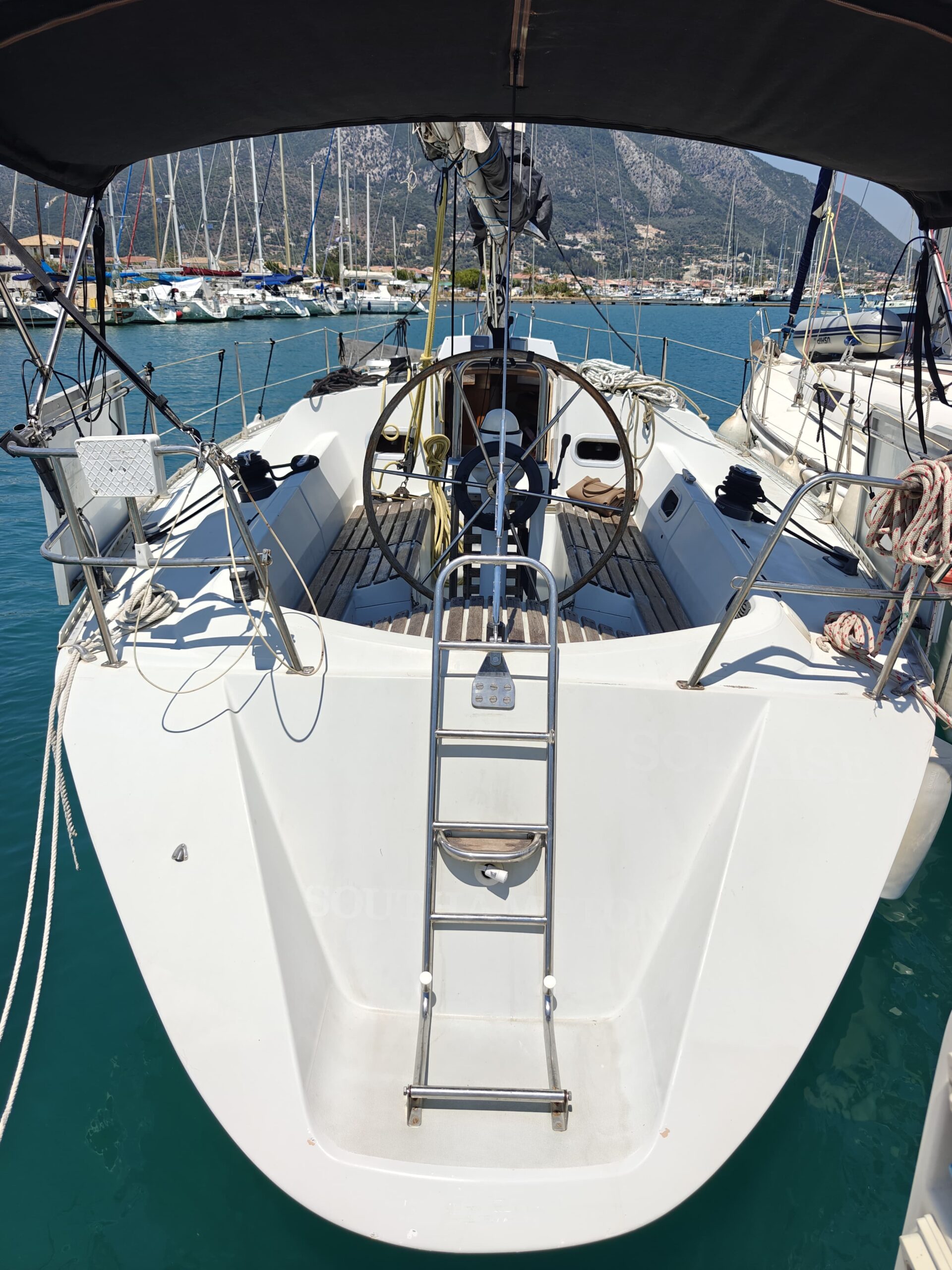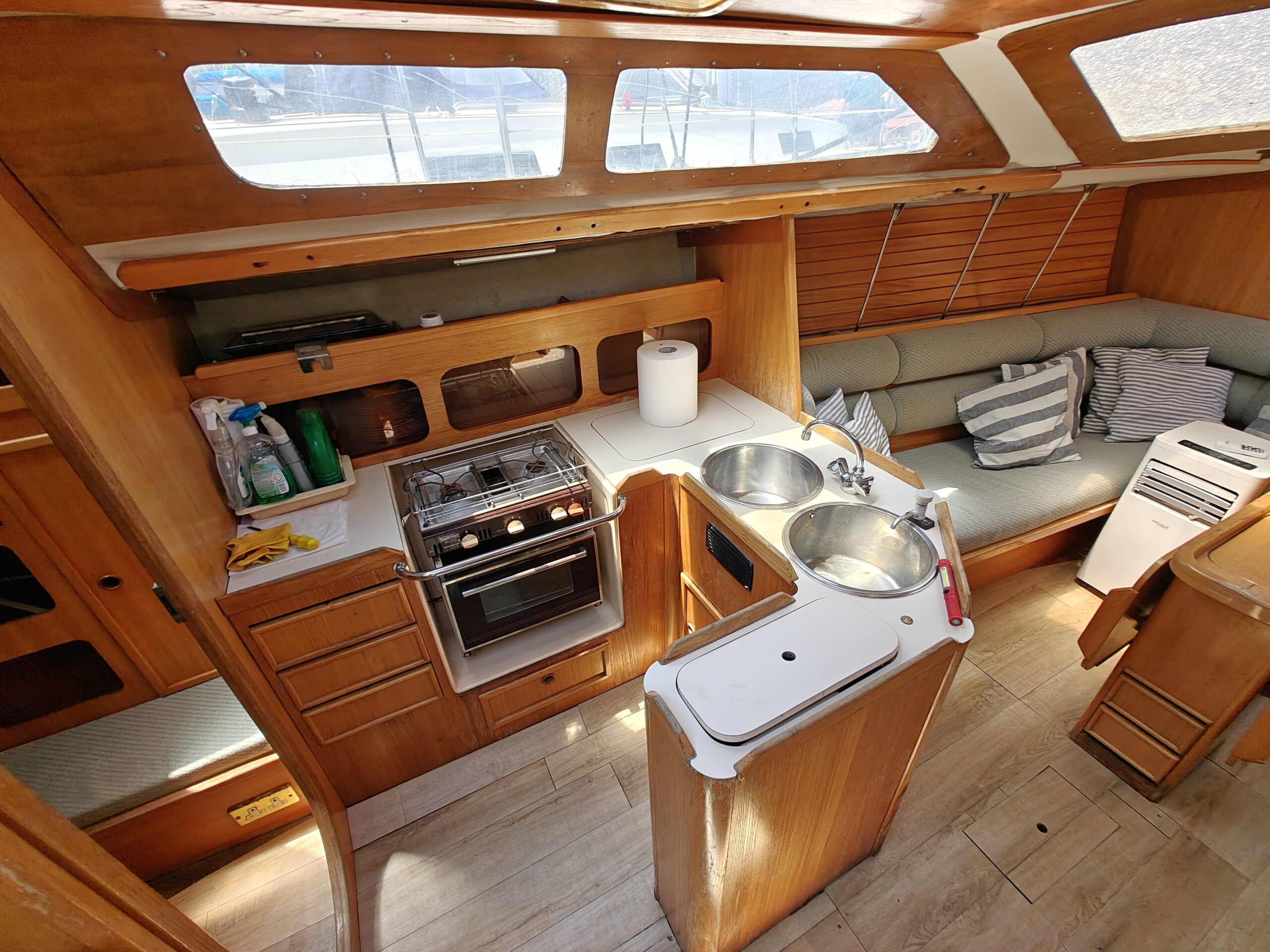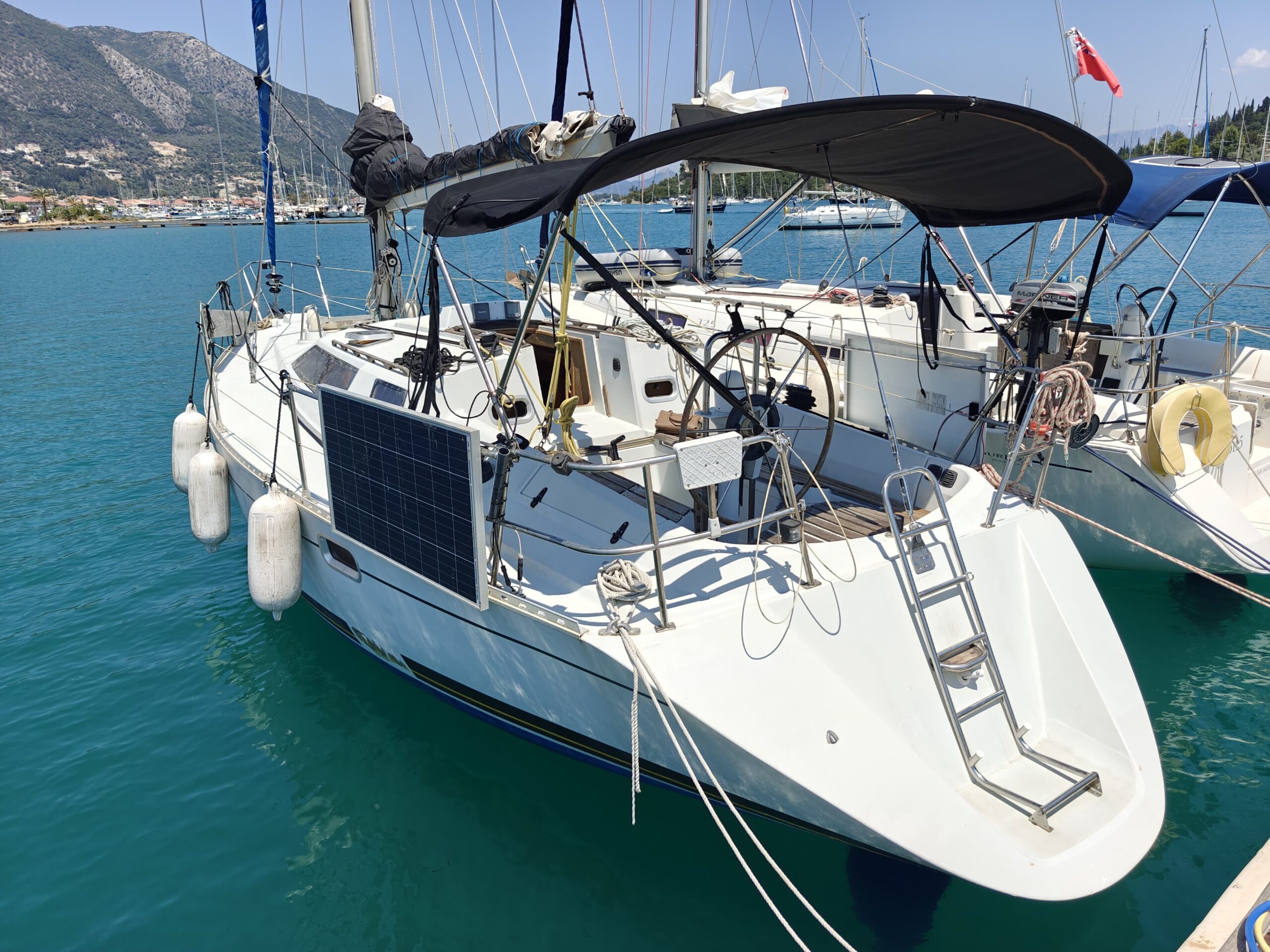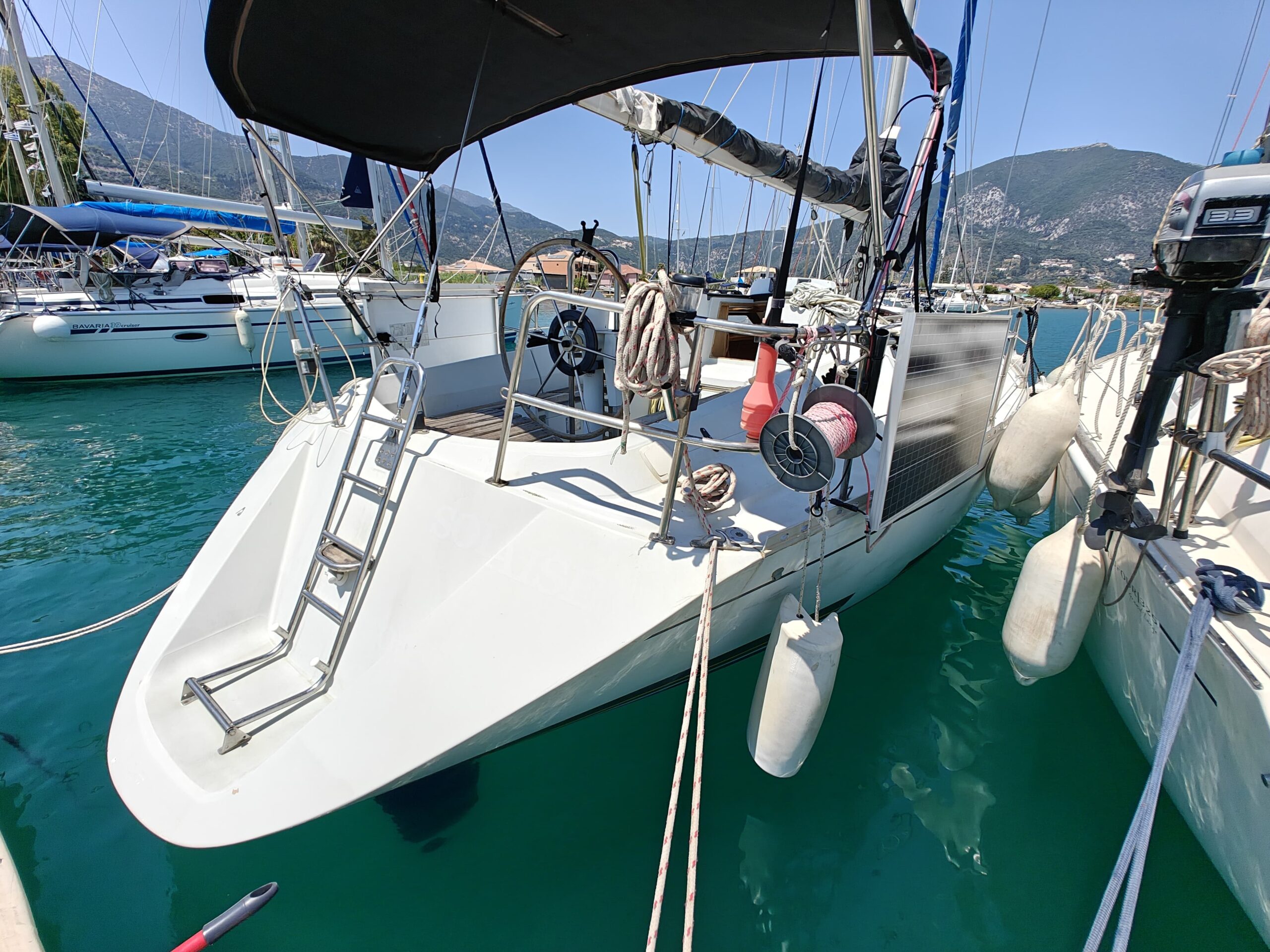 With a bimini prepped for panel installation and a Plastimo gas kitchen setup with oven and grill, this yacht is ready for extended cruising.