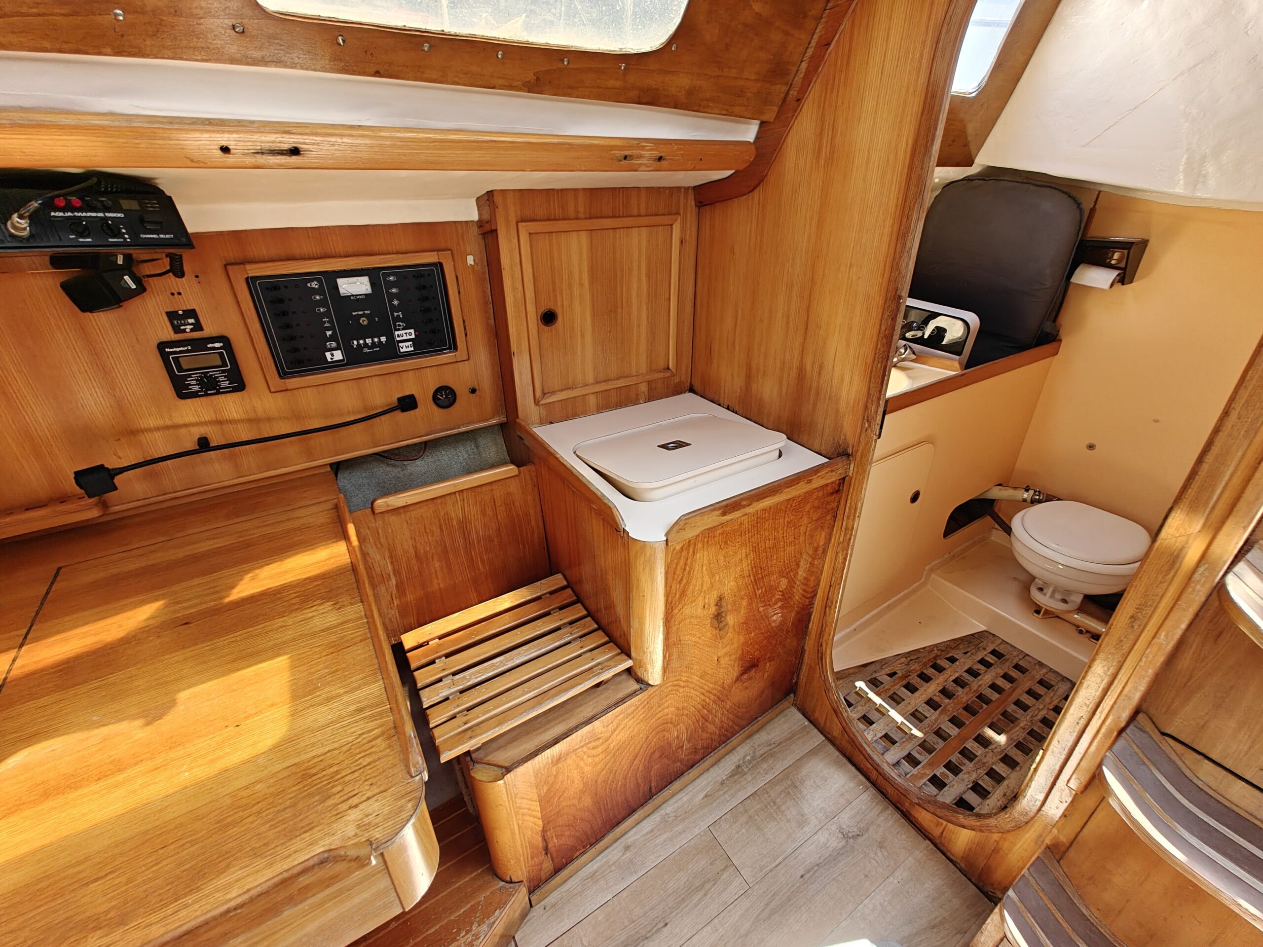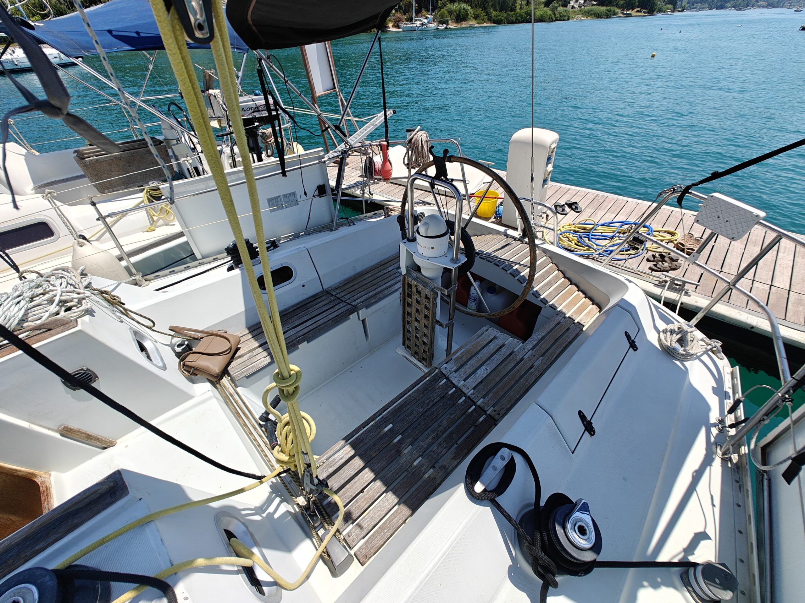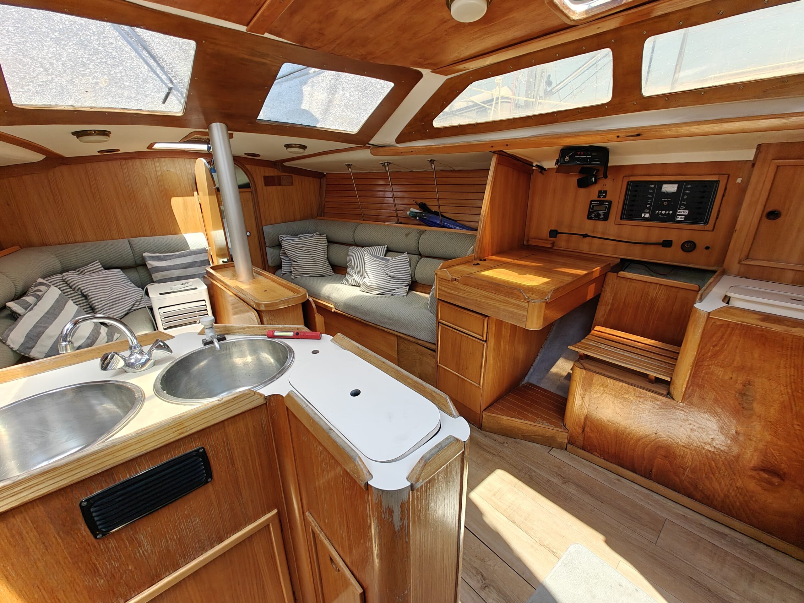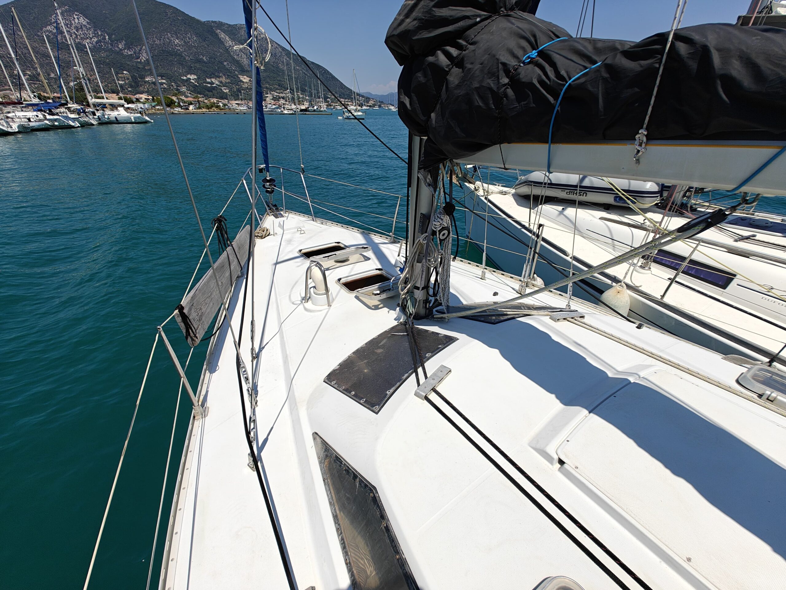 Sailing gear has been modernized with a new jib, furler, baby stay cable, and refreshed lines for the genoa and reefing systems. The sails are in great shape, genoa in perfect condition, mainsail in good condition, handled easily via four Harken winches, and supported by an Autohelm 4000 autopilot.