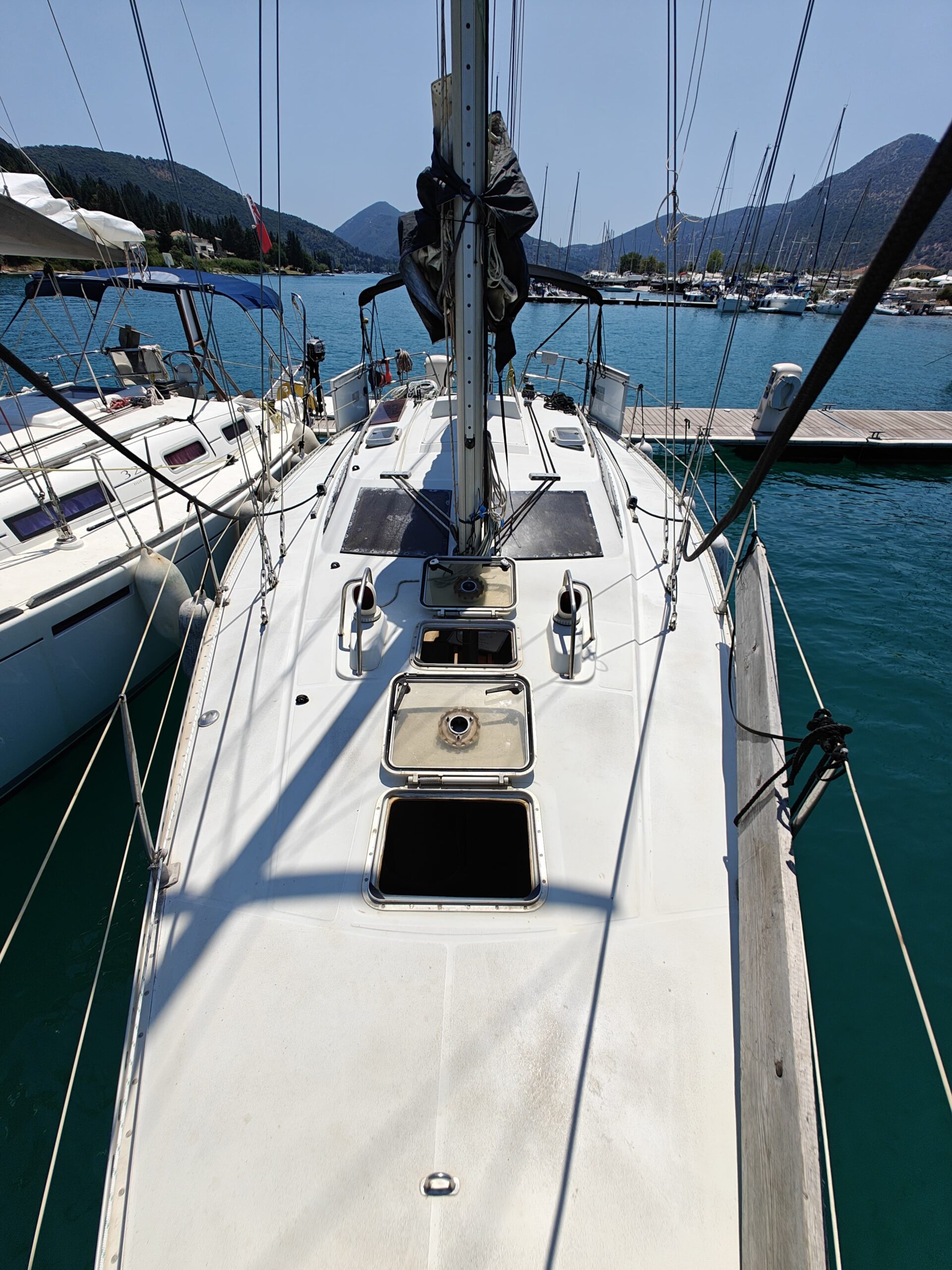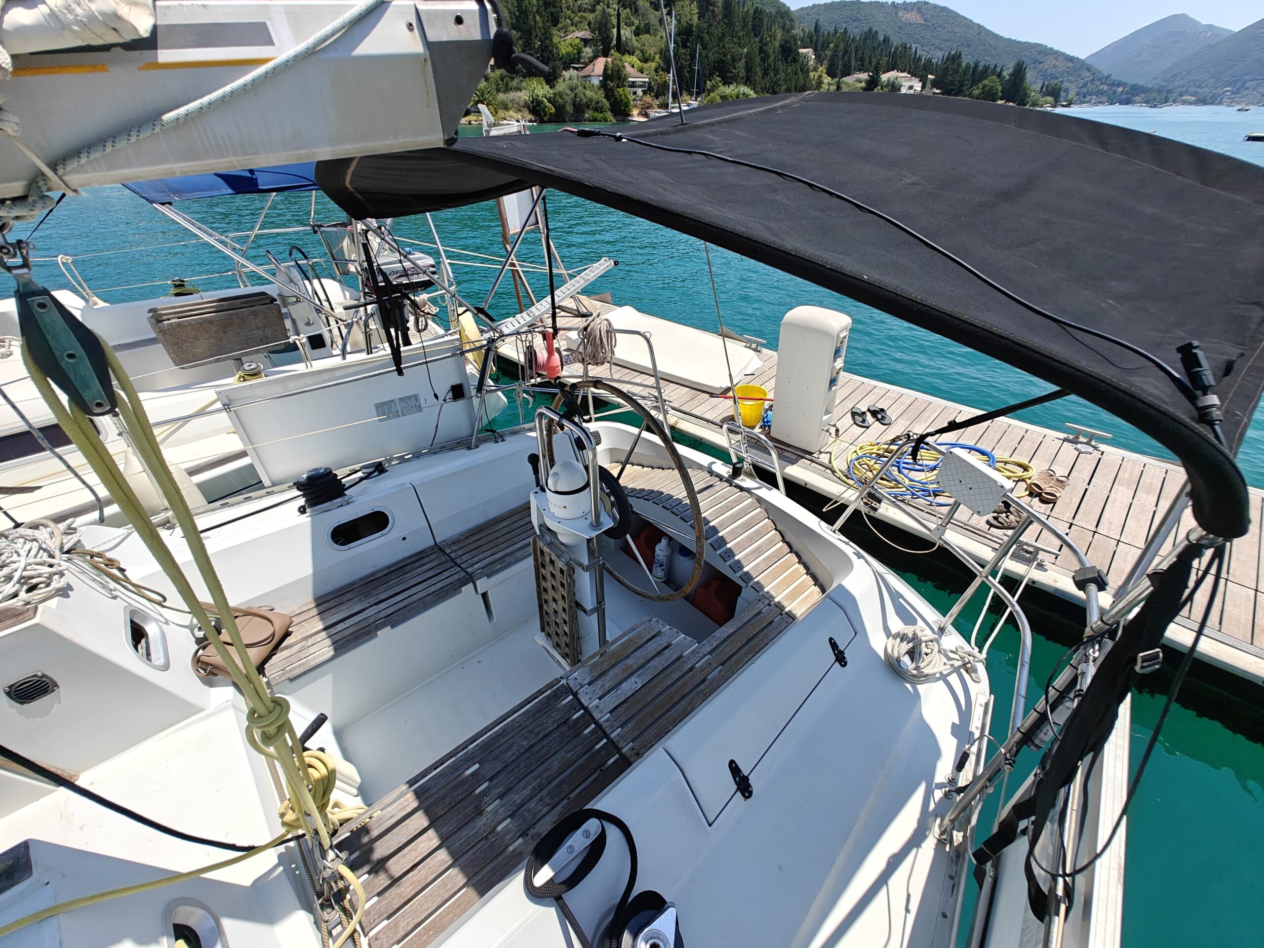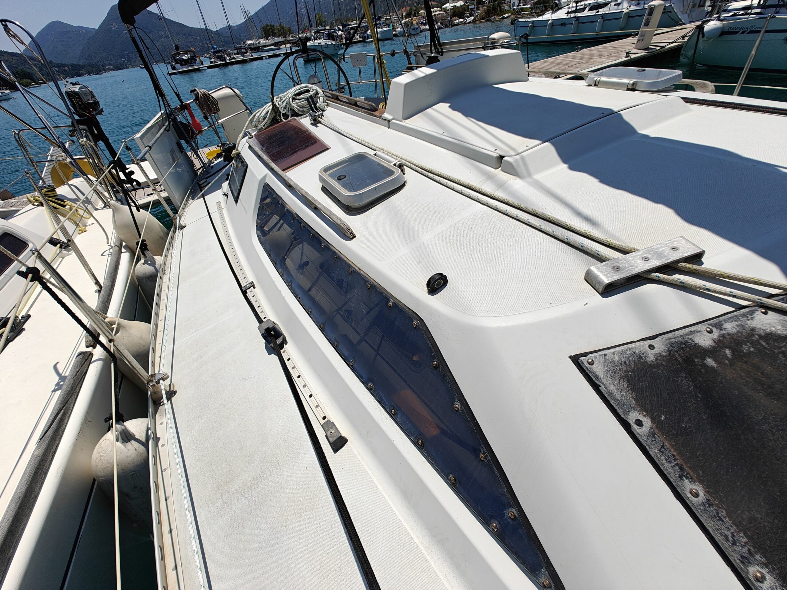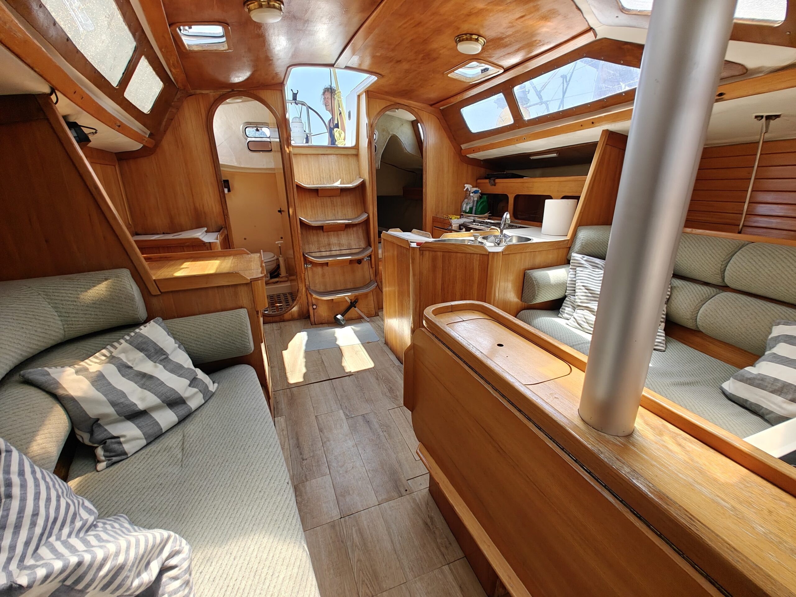 Sailing gear has been modernized with a new jib, furler, baby stay cable, and refreshed lines for the genoa and reefing systems. The sails are in great shape, genoa in perfect condition, mainsail in good condition, handled easily via four Harken winches, and supported by an Autohelm 4000 autopilot.