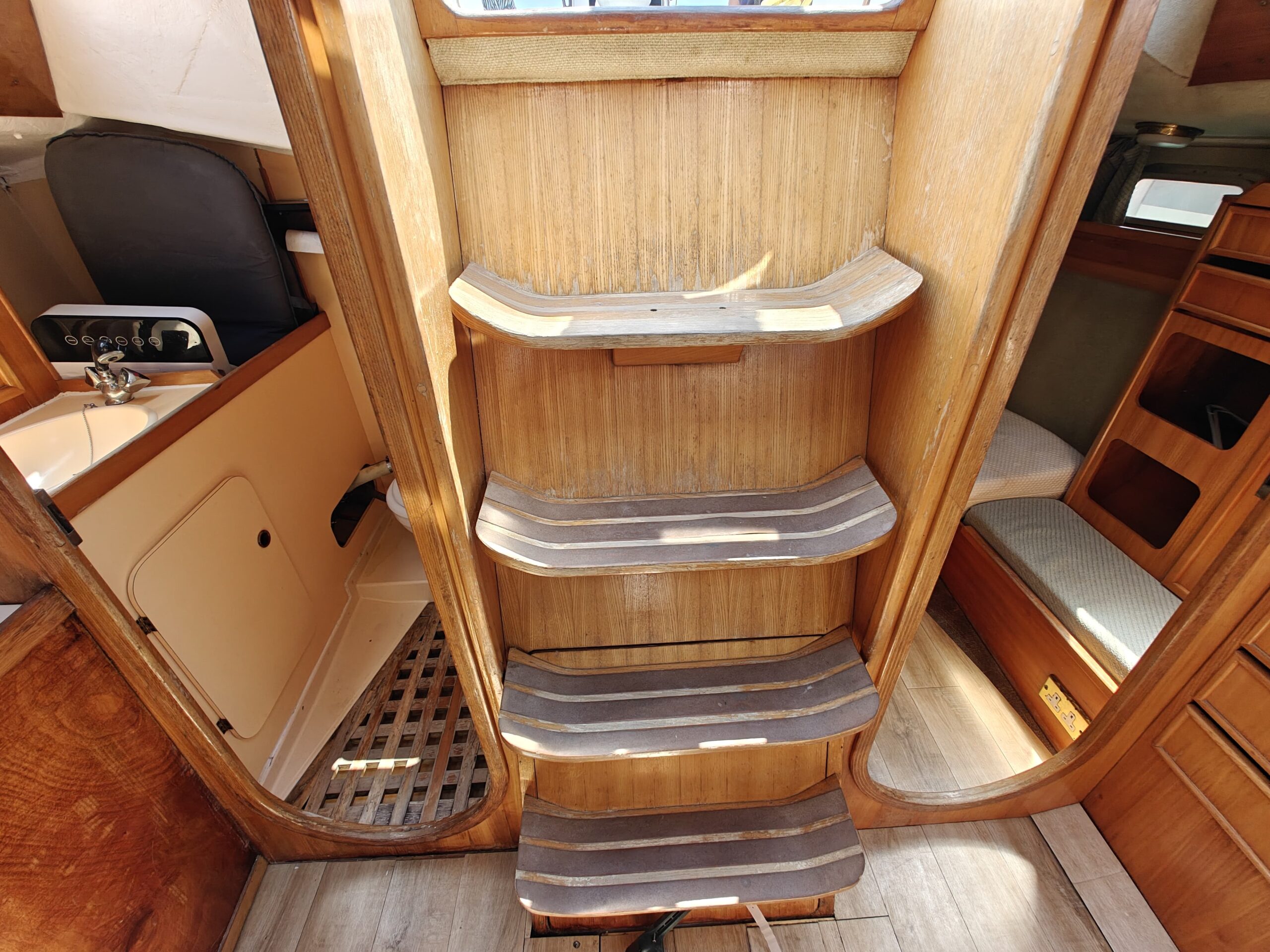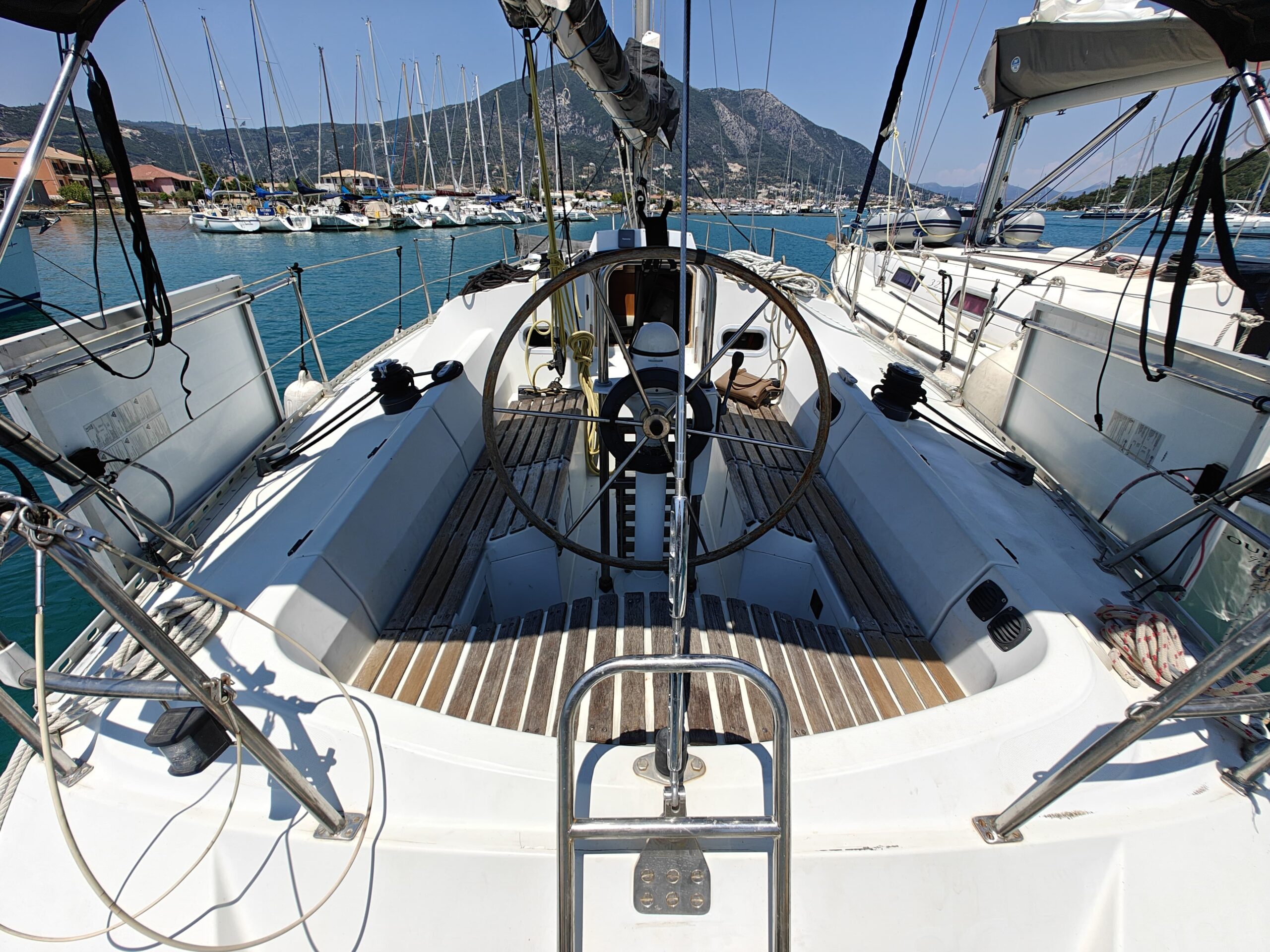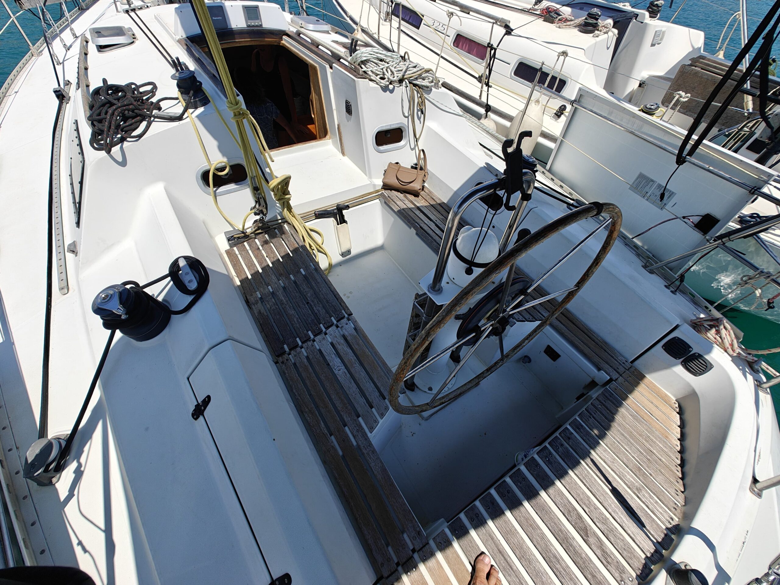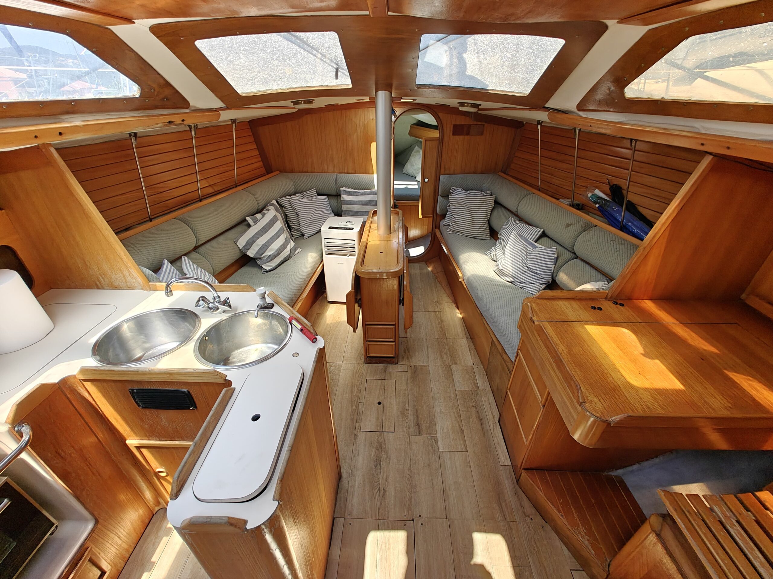 Sailing gear has been modernized with a new jib, furler, baby stay cable, and refreshed lines for the genoa and reefing systems. The sails are in great shape, genoa in perfect condition, mainsail in good condition, handled easily via four Harken winches, and supported by an Autohelm 4000 autopilot.