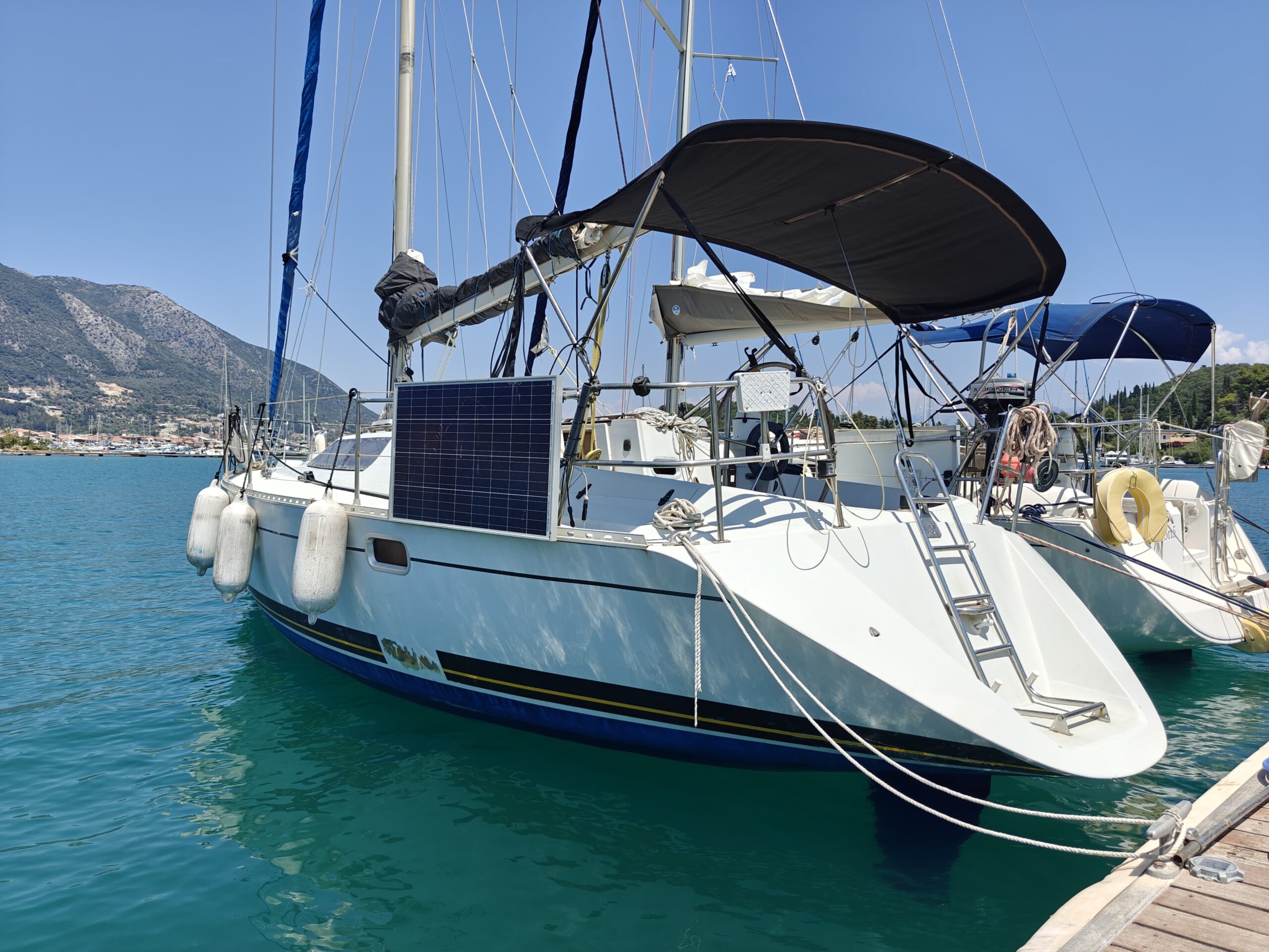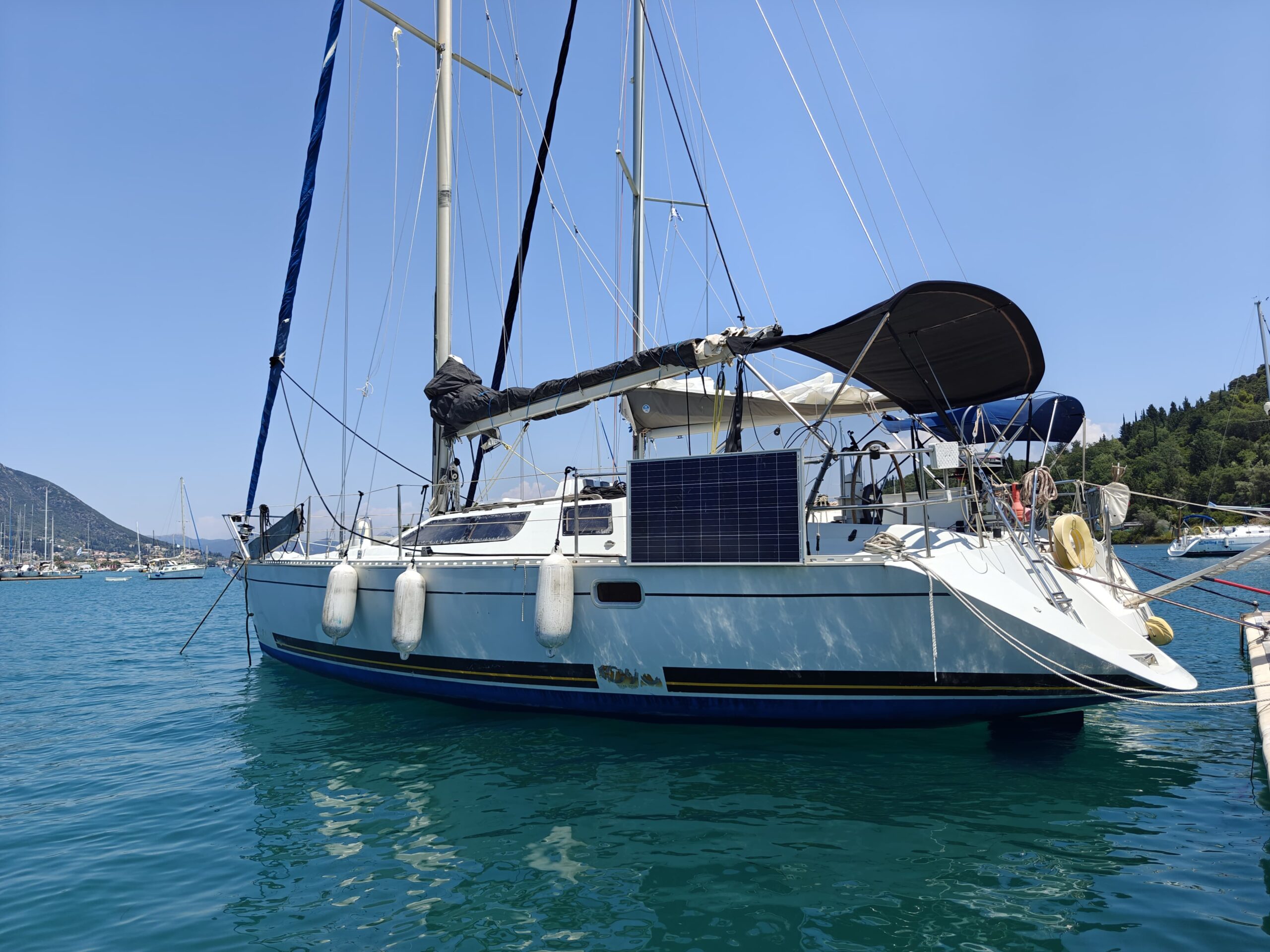 Recent upgrades include new rigging, seacocks, and a comprehensive solar setup with 240W panels (2022), MPPT Victron controllers, and a smart 220V Victron battery charger, ensuring energy independence and reliability at sea.
