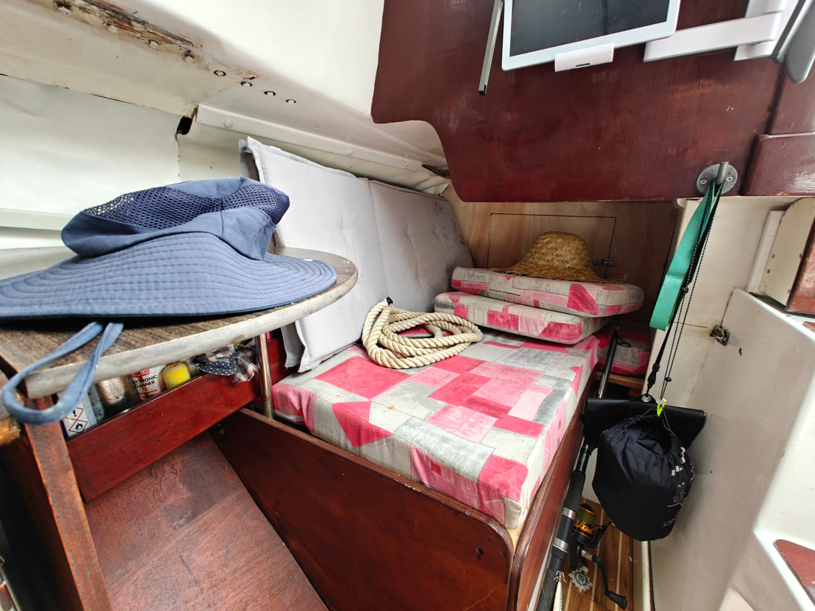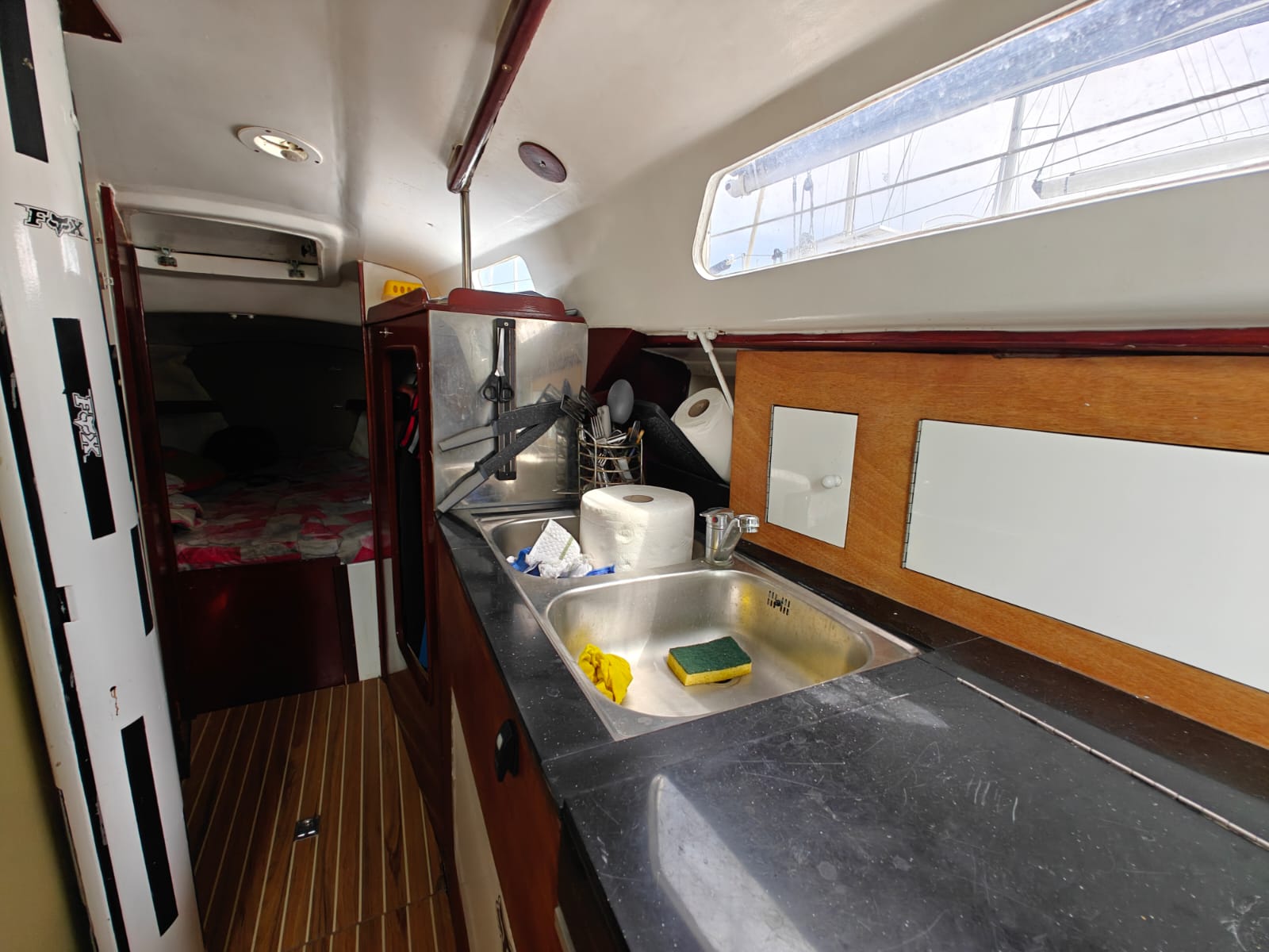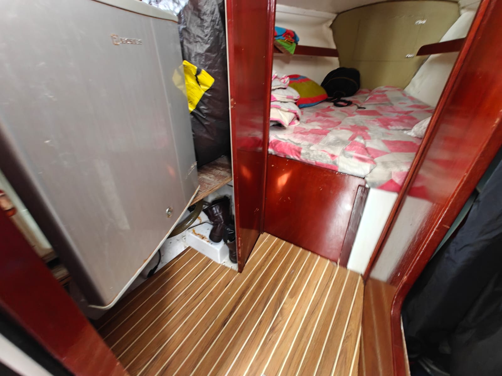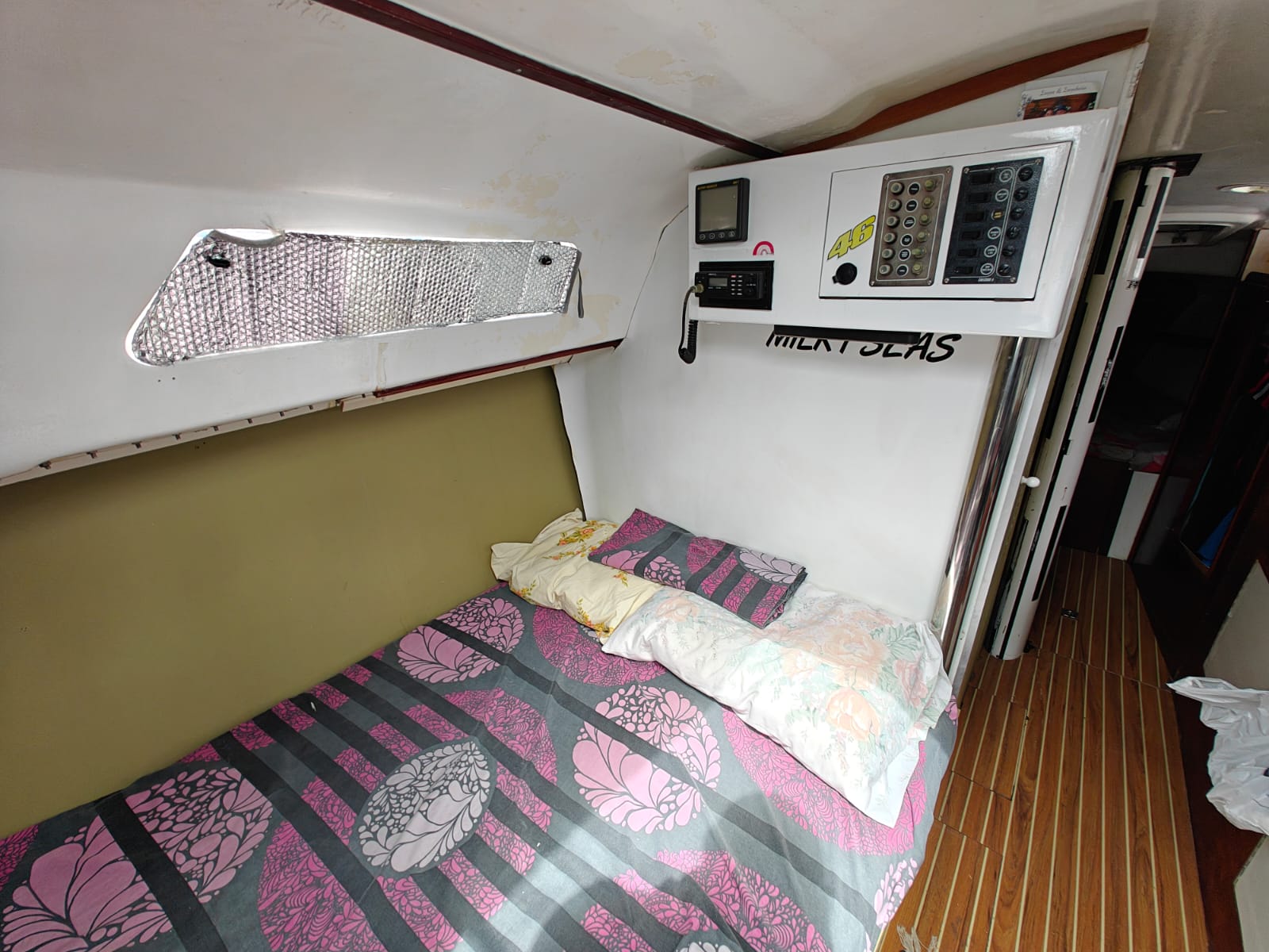 The boat is well-equipped for extended stays with a 220V refrigerator, inverter (1000W), and 180Ah service battery.
