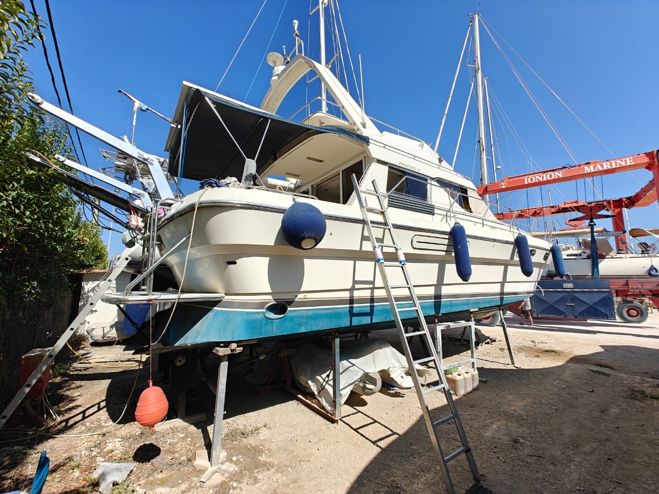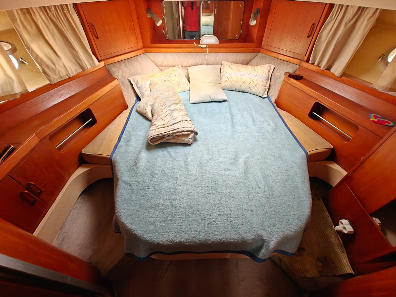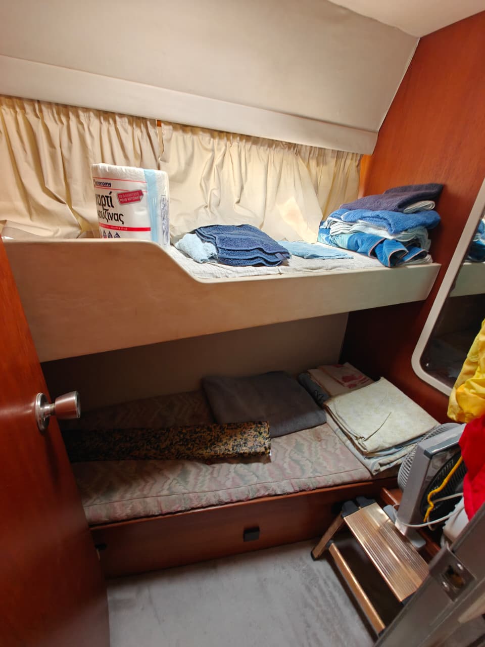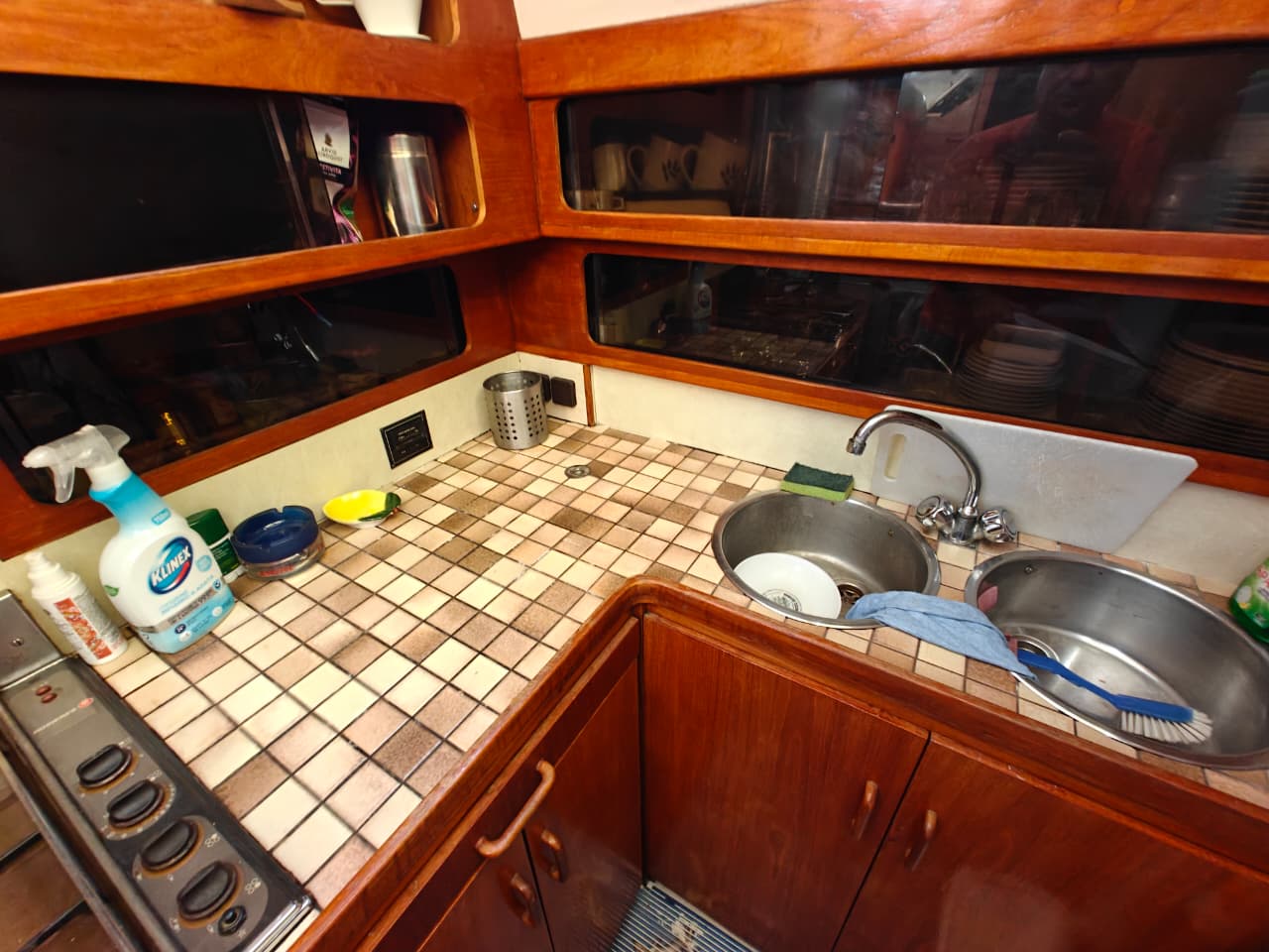 Accommodation includes a forward master cabin with a double island berth, a versatile twin guest cabin convertible to a double, and an additional cabin, comfortably sleeping up to six. With two electric heads, multiple showers, a spacious saloon, and a well-equipped galley featuring a double sink, hob, refrigerator, freezer, and microwave, this yacht offers all the comforts of home for extended cruising.