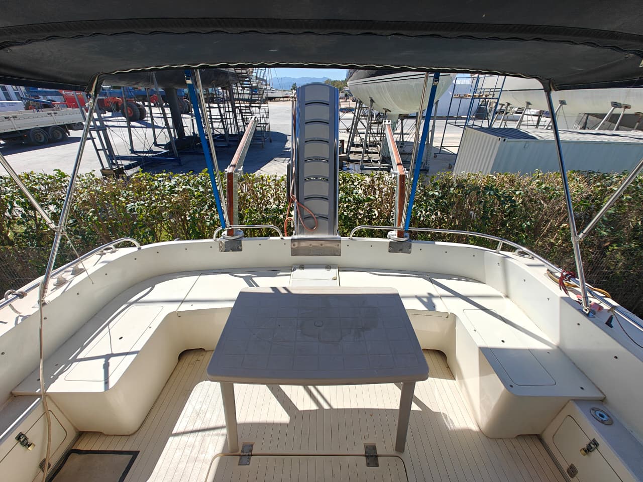 Deck equipment includes a hydraulic passerelle, davits, cockpit shower and table, Bruce anchor with 70m chain, and bimini.